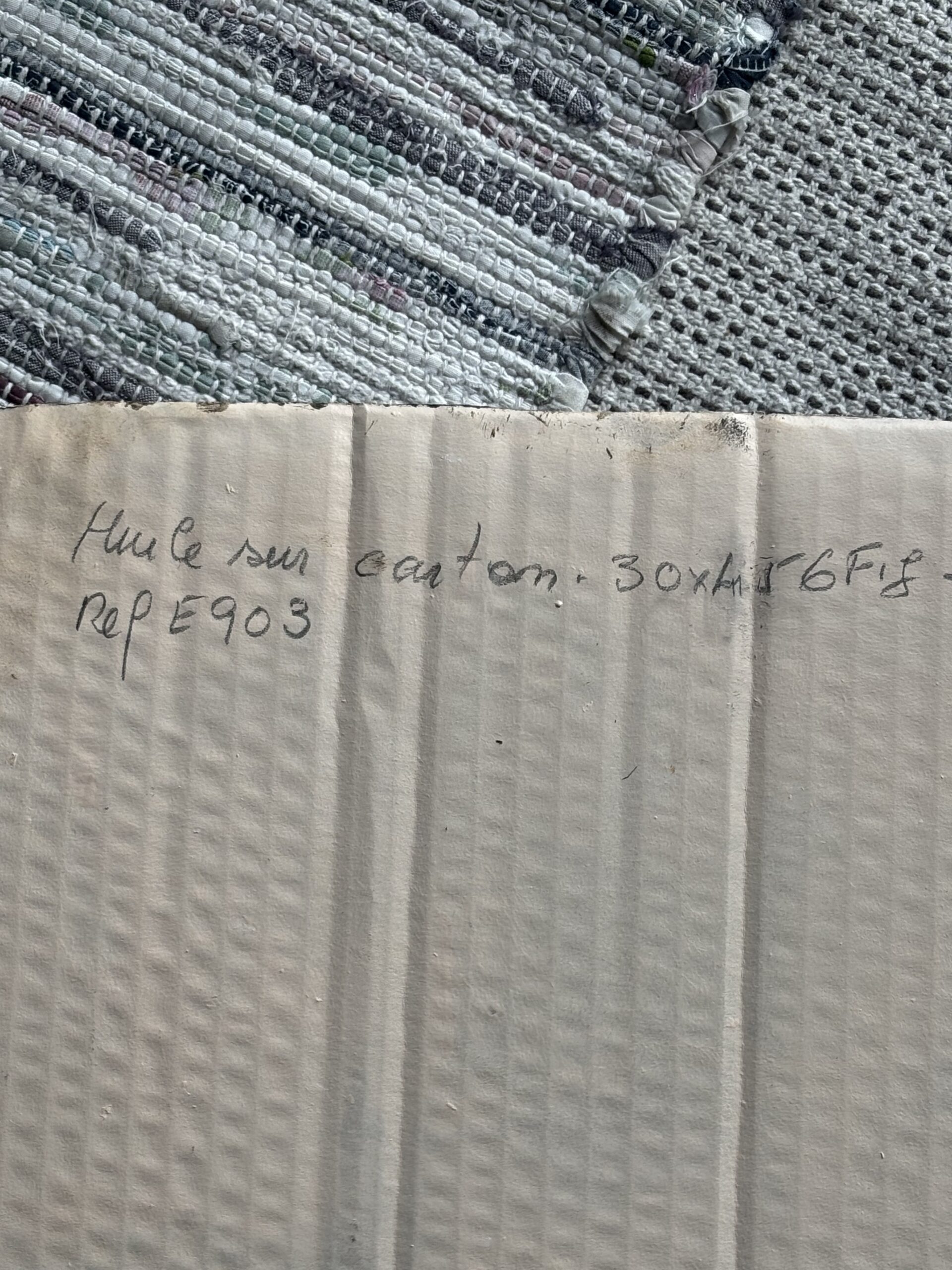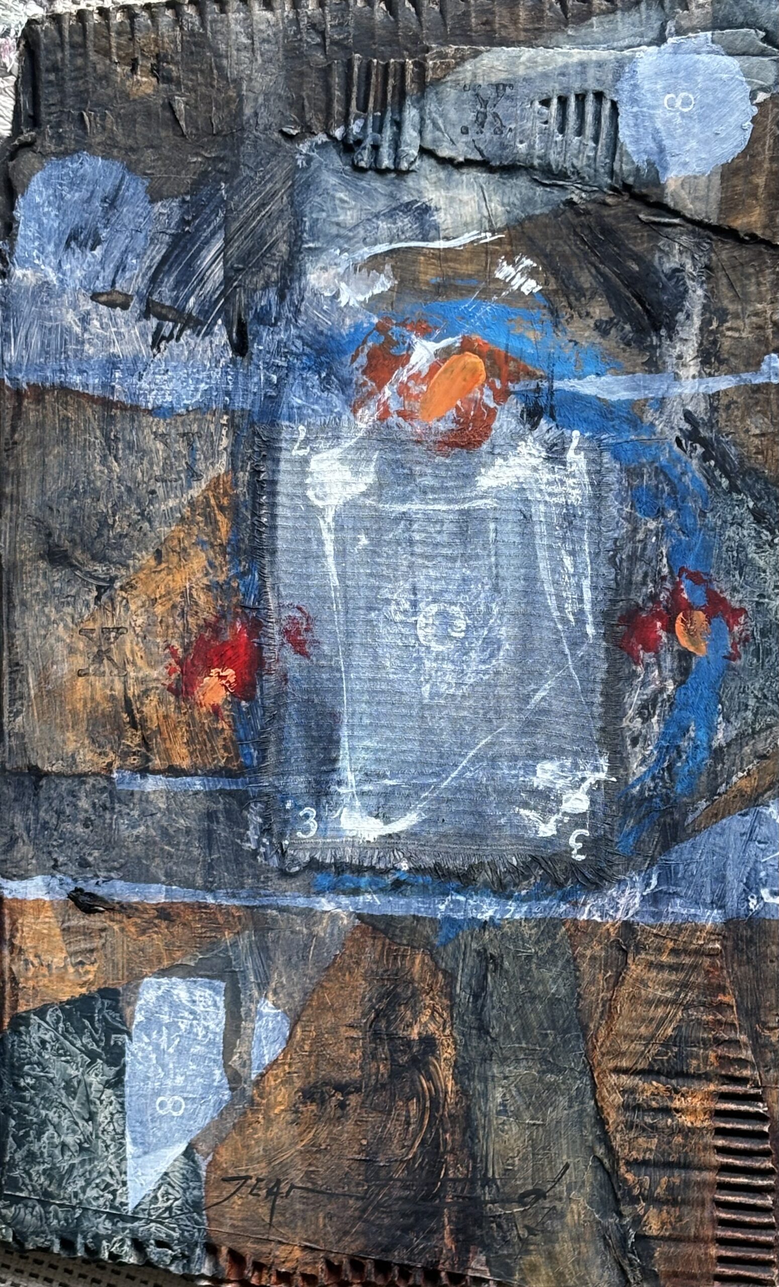 段ボールの波板構造が露わになっている部分は、この作品における重要な視覚的要素のひとつです。特に右側と下部に規則的な縞模様として現れた波形は、工業製品の機械的リズムを連想させる一方で、絵具が滲み込み、擦れ、はみ出すことで偶然性と不均質さが生じています。この「規則と逸脱」のコントラストは、現代社会における秩序と混沌のせめぎ合いを象徴するかのようです。支持体そのものが構造を主張し、絵画とオブジェクトの境界を問い直しています。