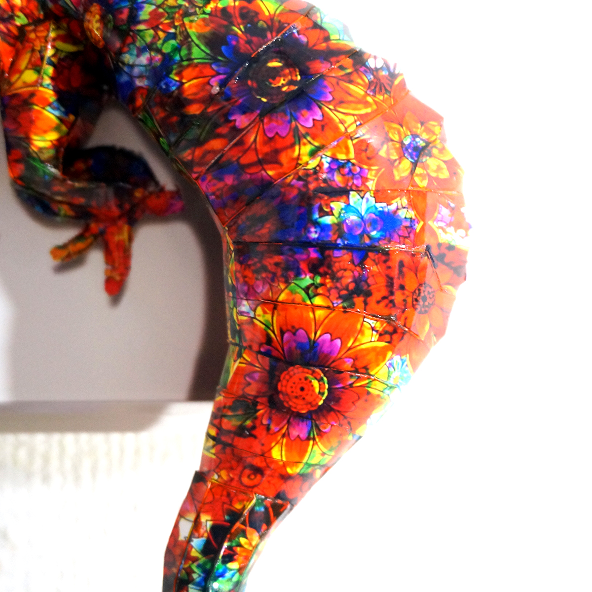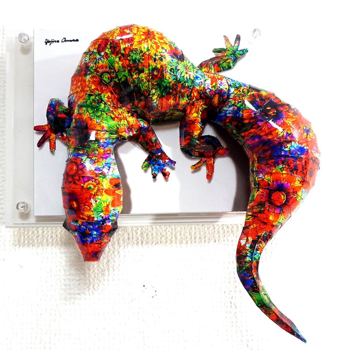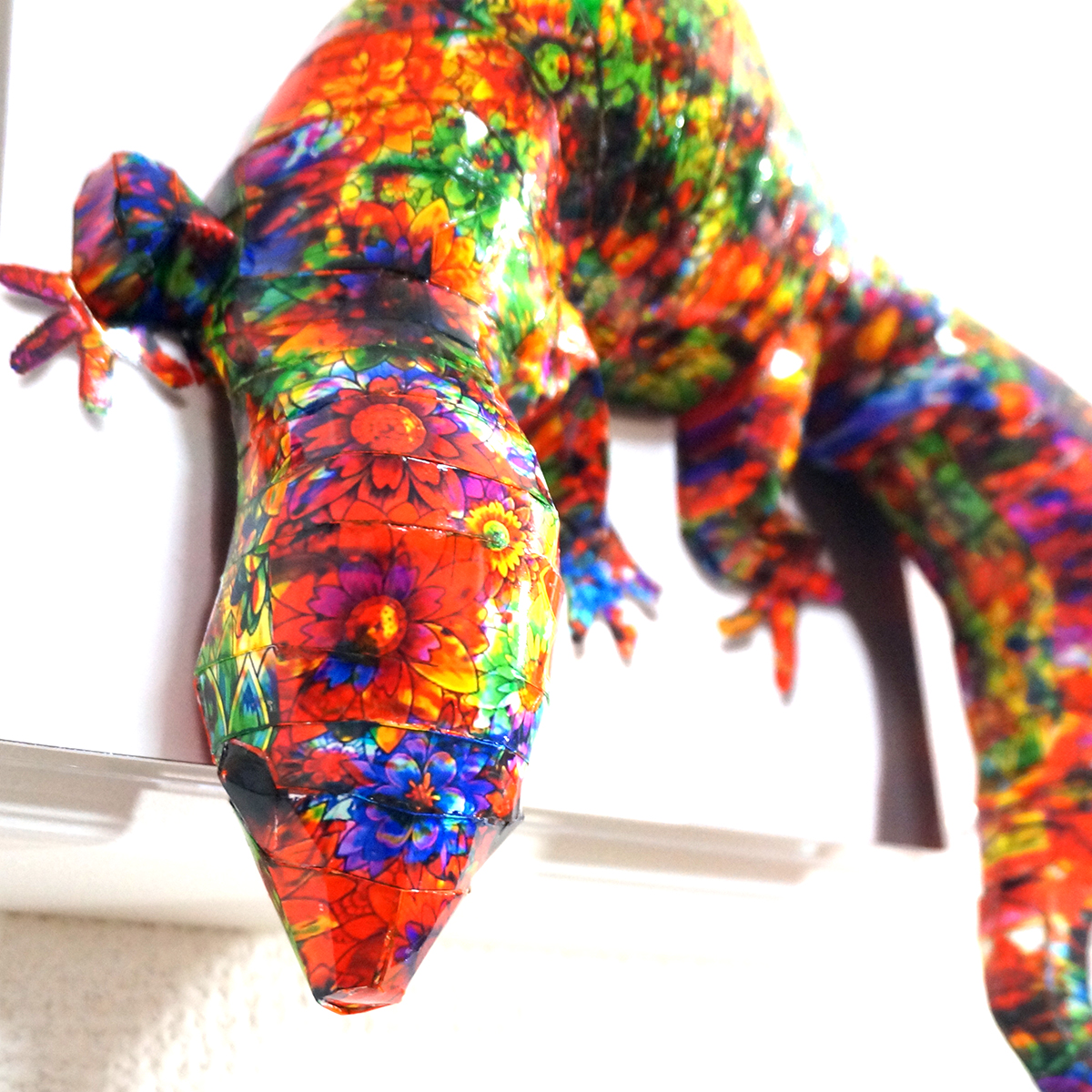 トカゲのコラージュ画像を作成しペーパークラフト技術を用いて立体的に表現した作品です。