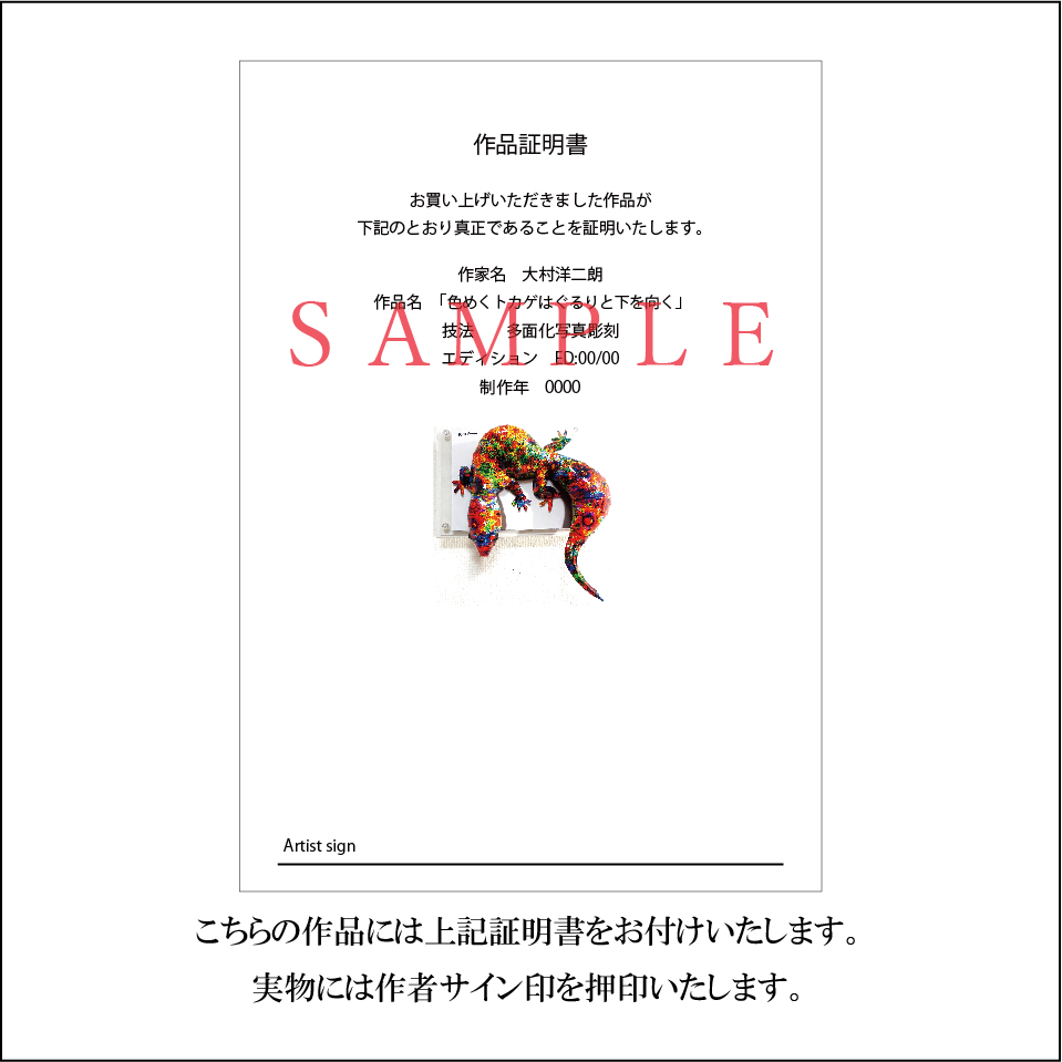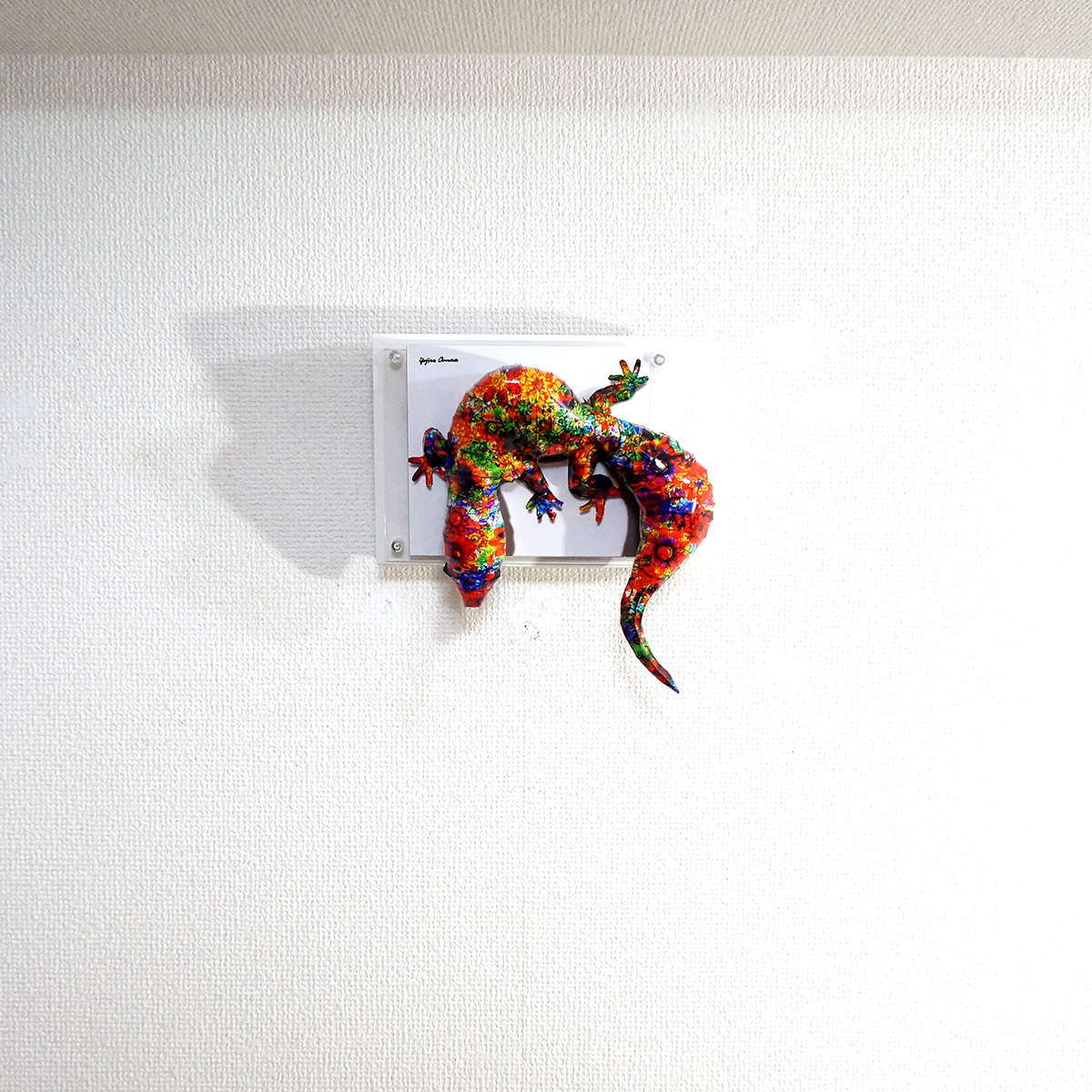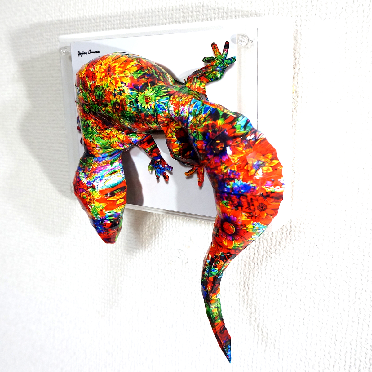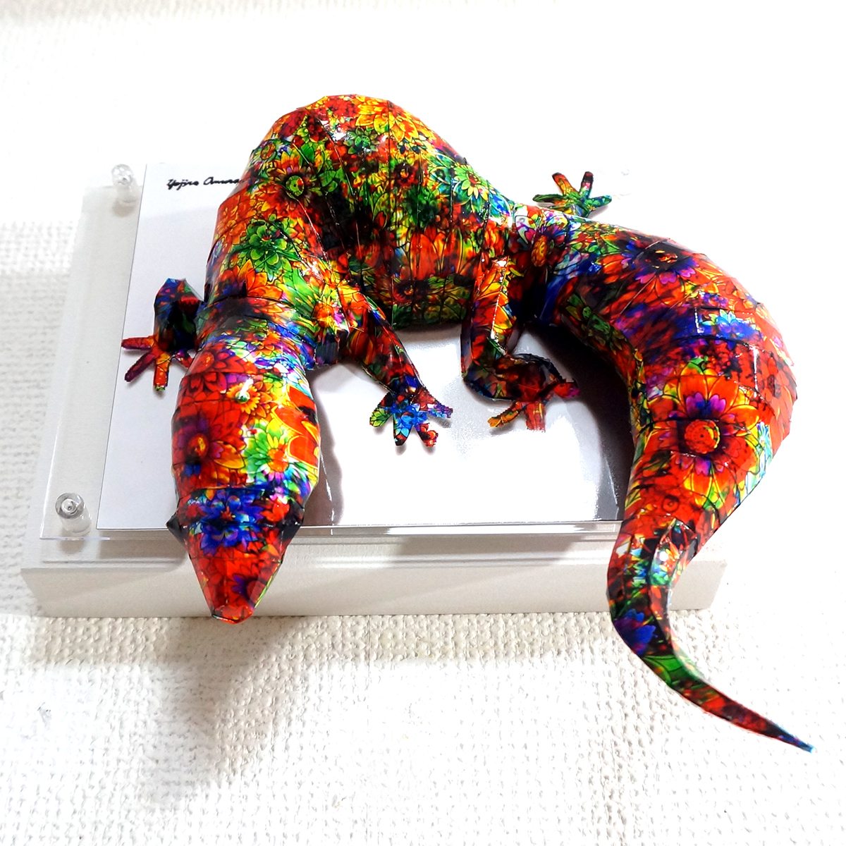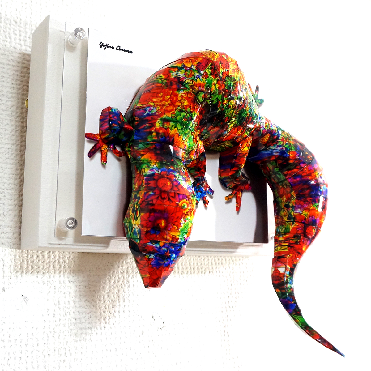 赤色を基調としたカラフルな模様をトカゲ本来の表情と重ね合わせたデザインです、表面上は光沢紙の艶のある質感となっております。