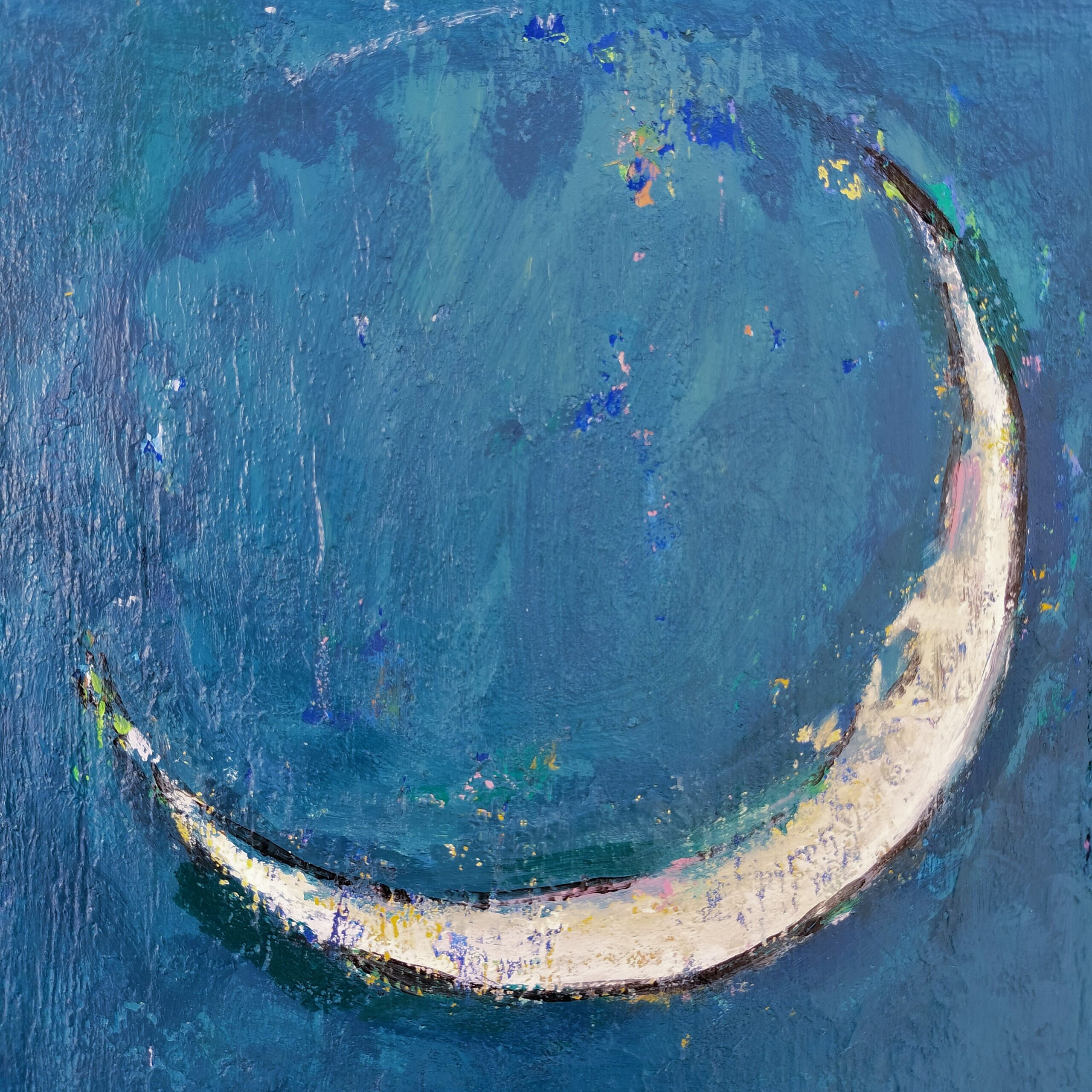 あたりが静まり返る夜、一匹のフレンチブルドッグの視線の先には、優しく光る三日月。