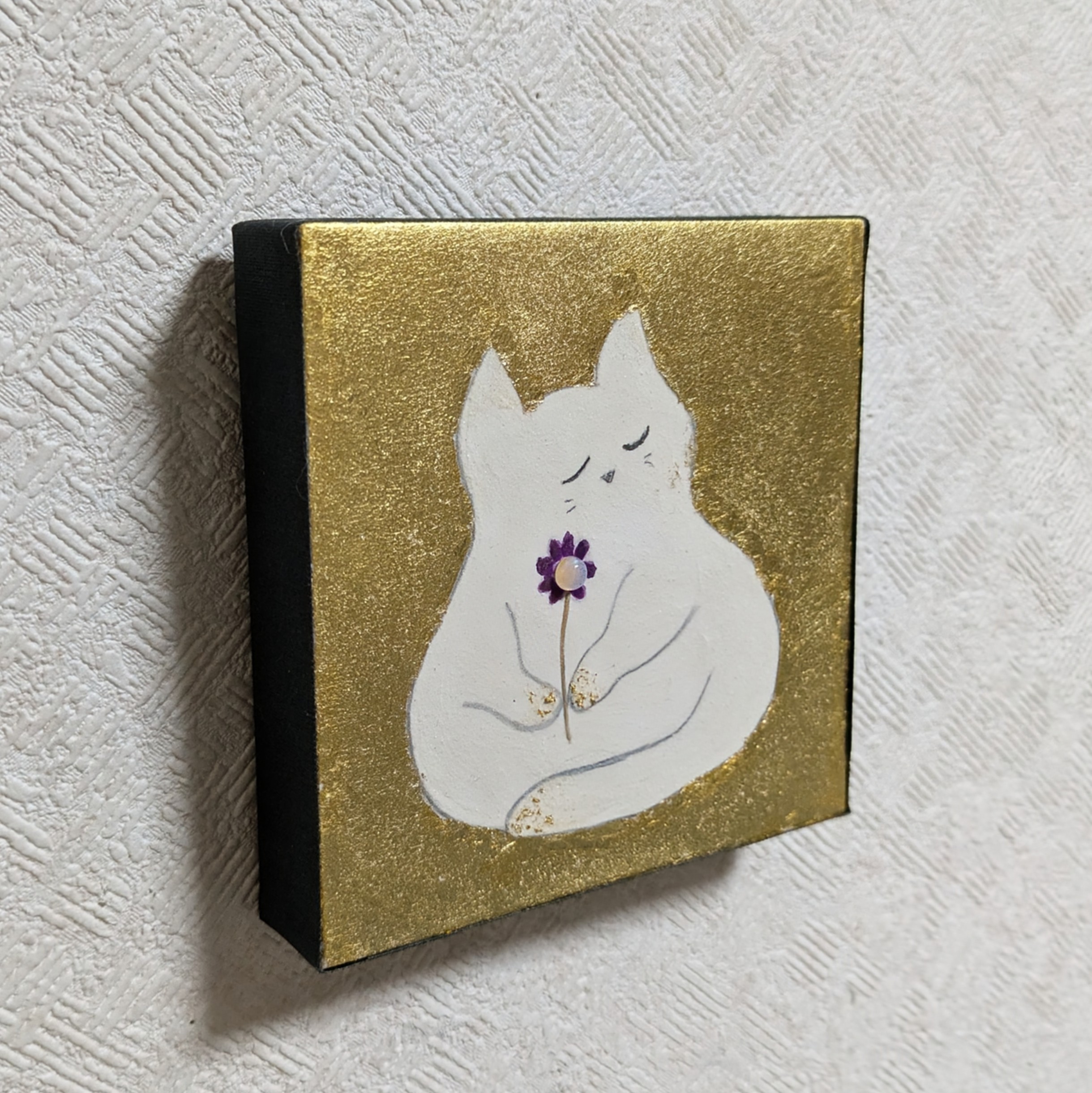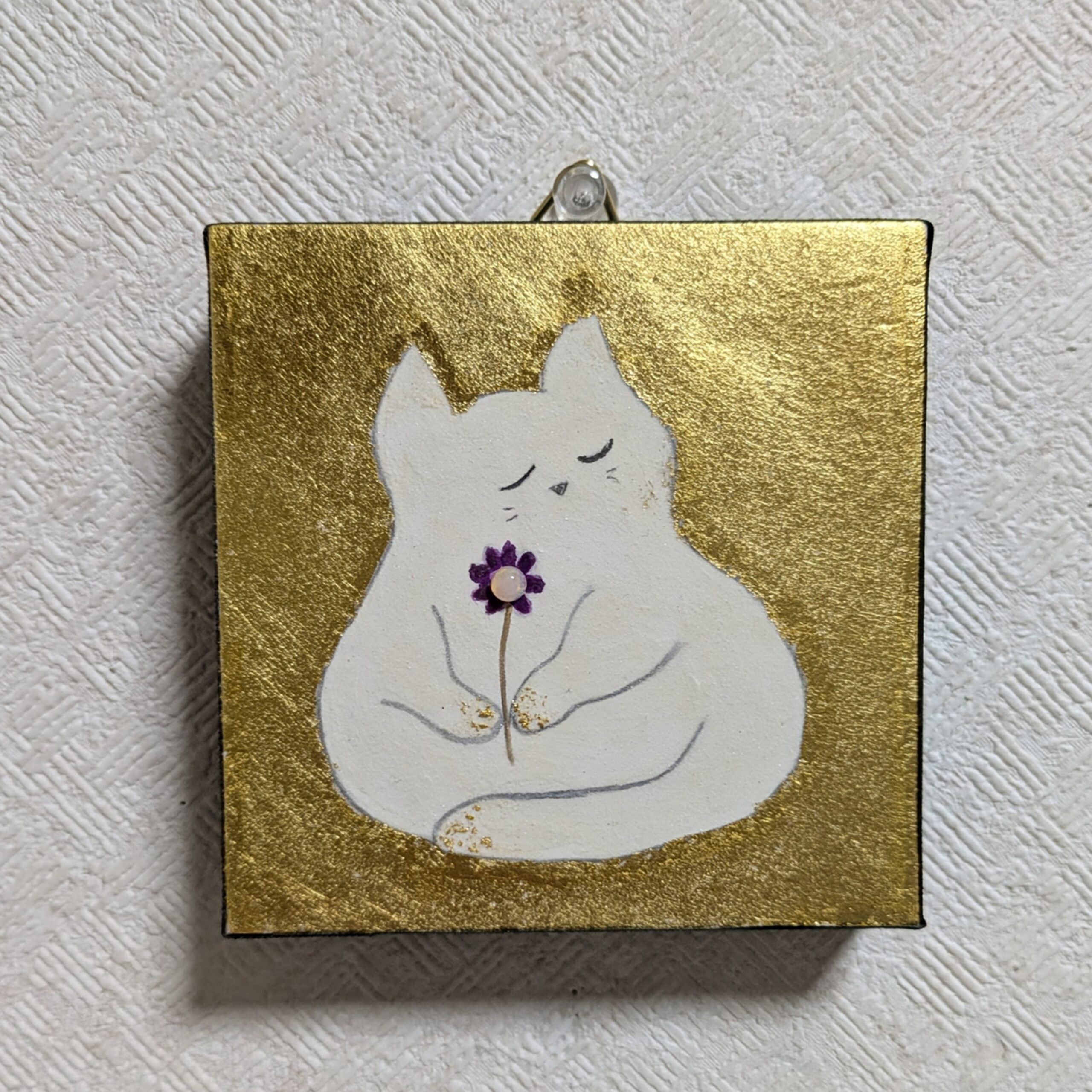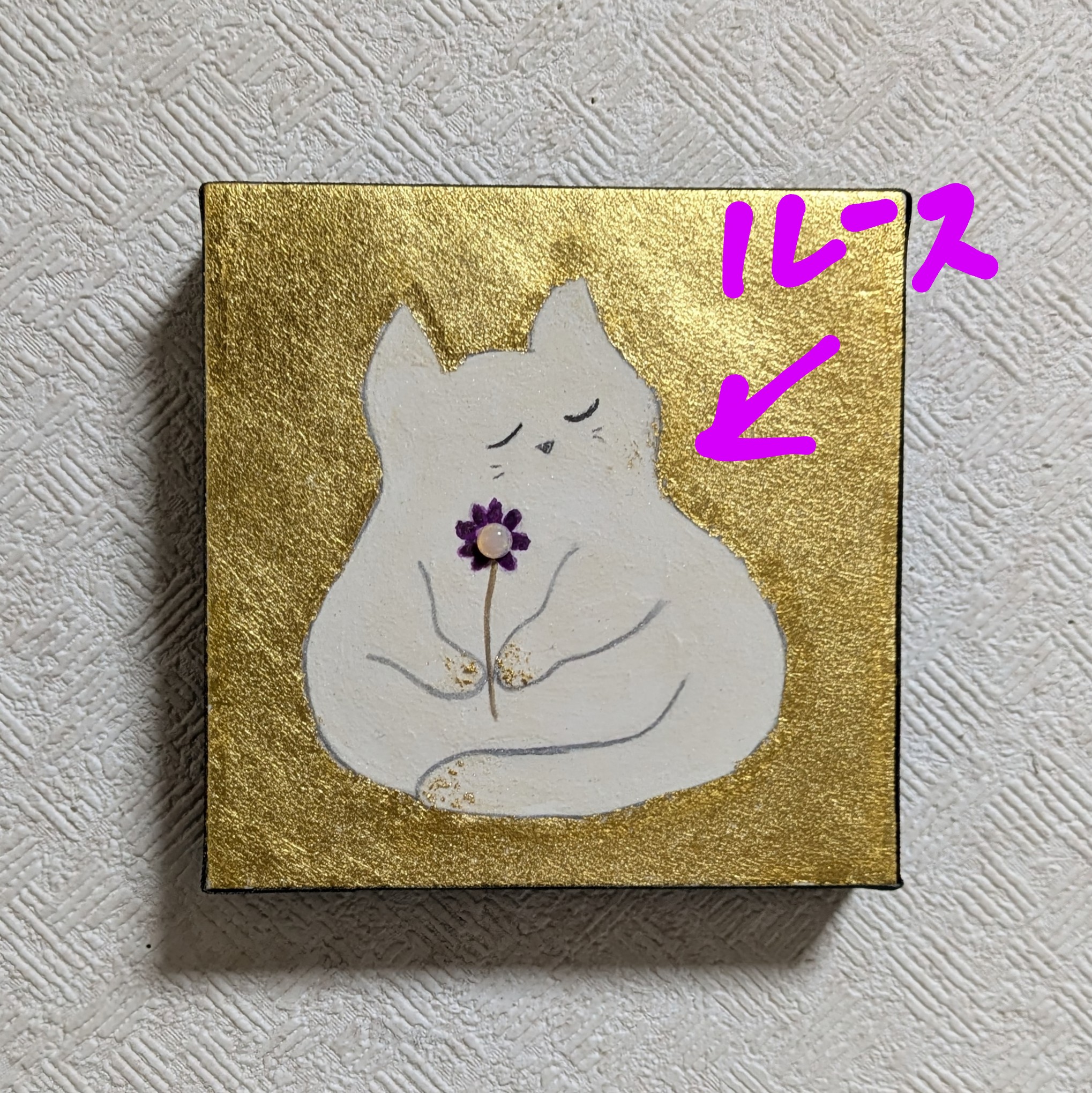 良い運気を引き寄せ幸運の使いと伝えられている白猫を描きました。花びらには三大ヒーリングストーンのスギライトを使用し、10月の誕生石を飾りました。