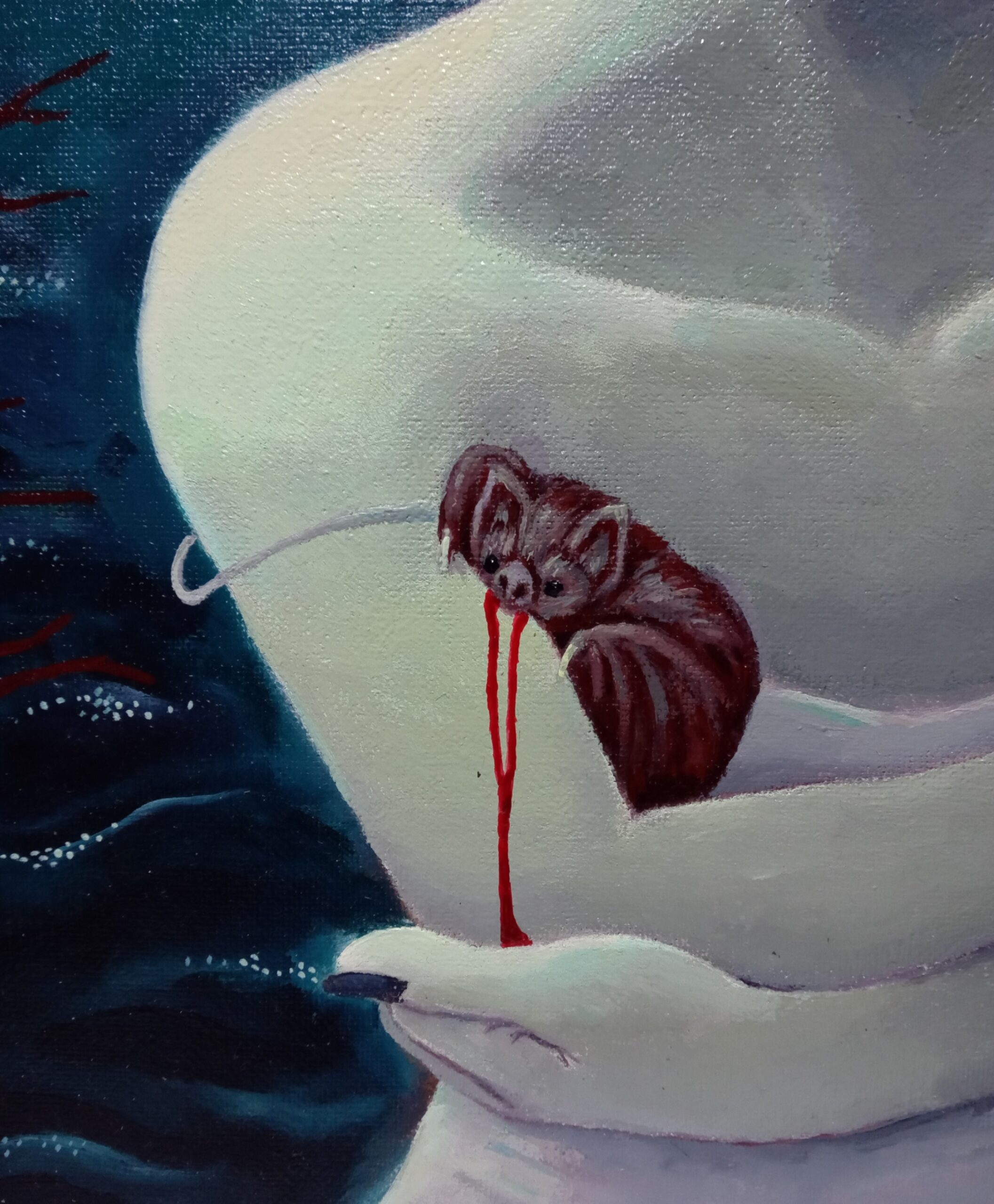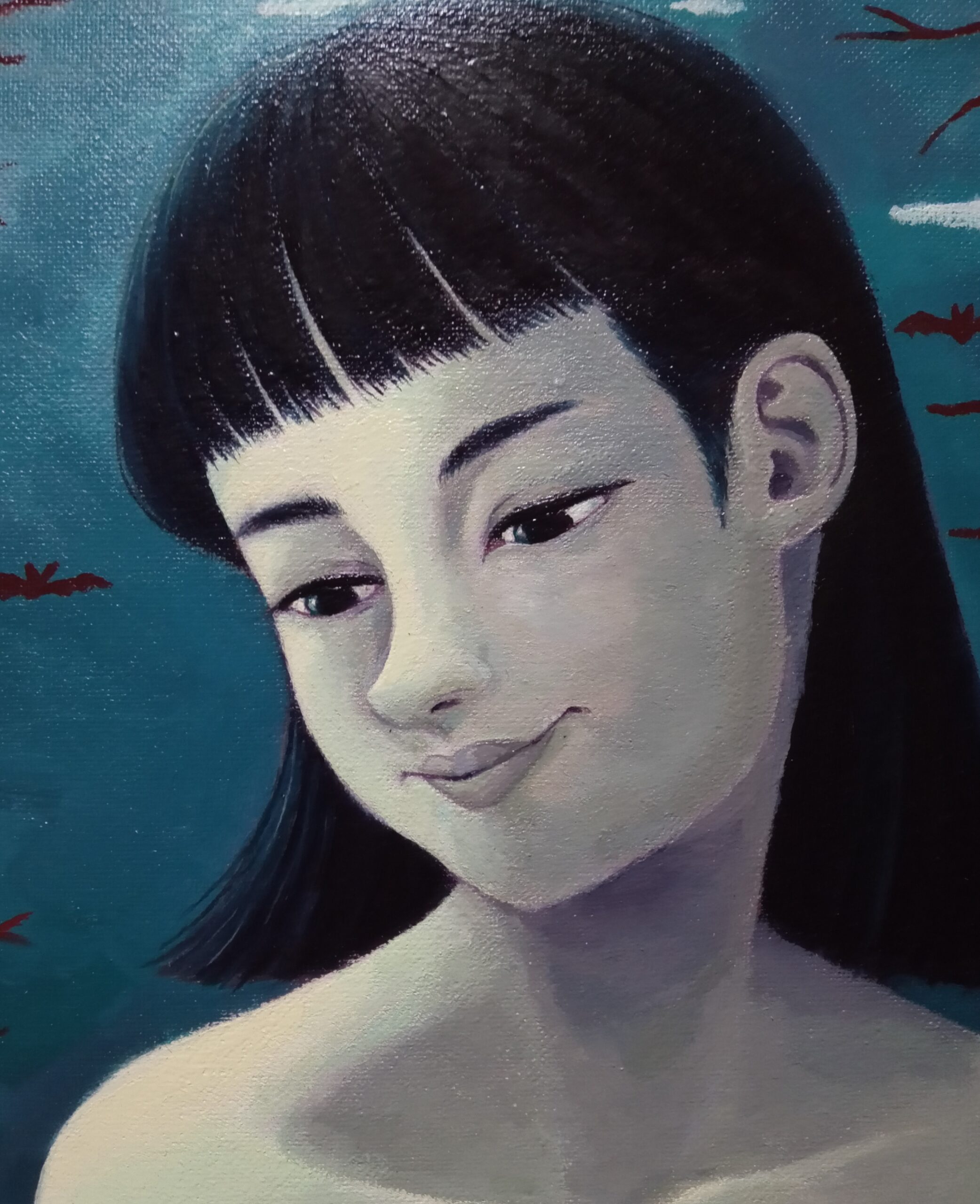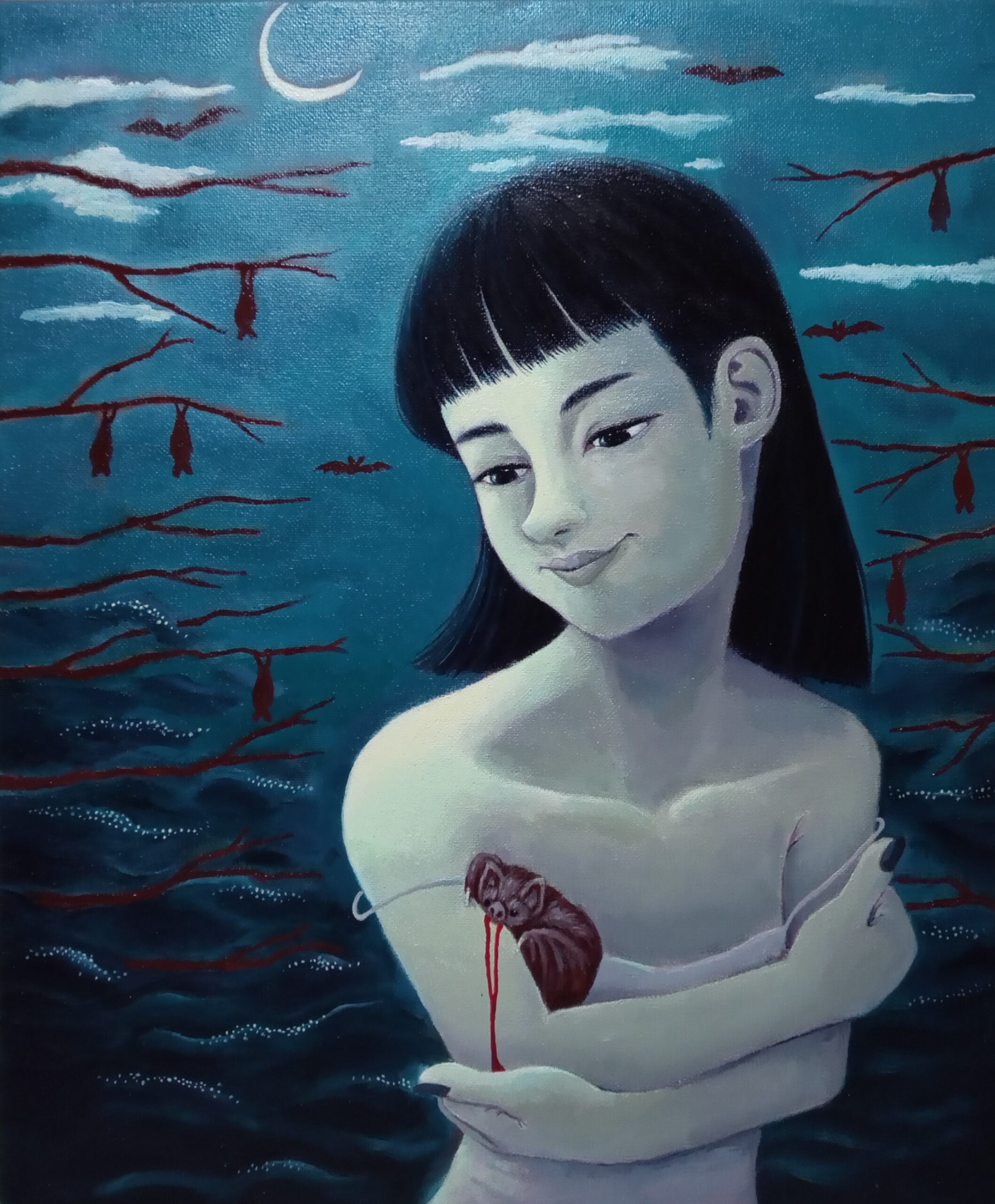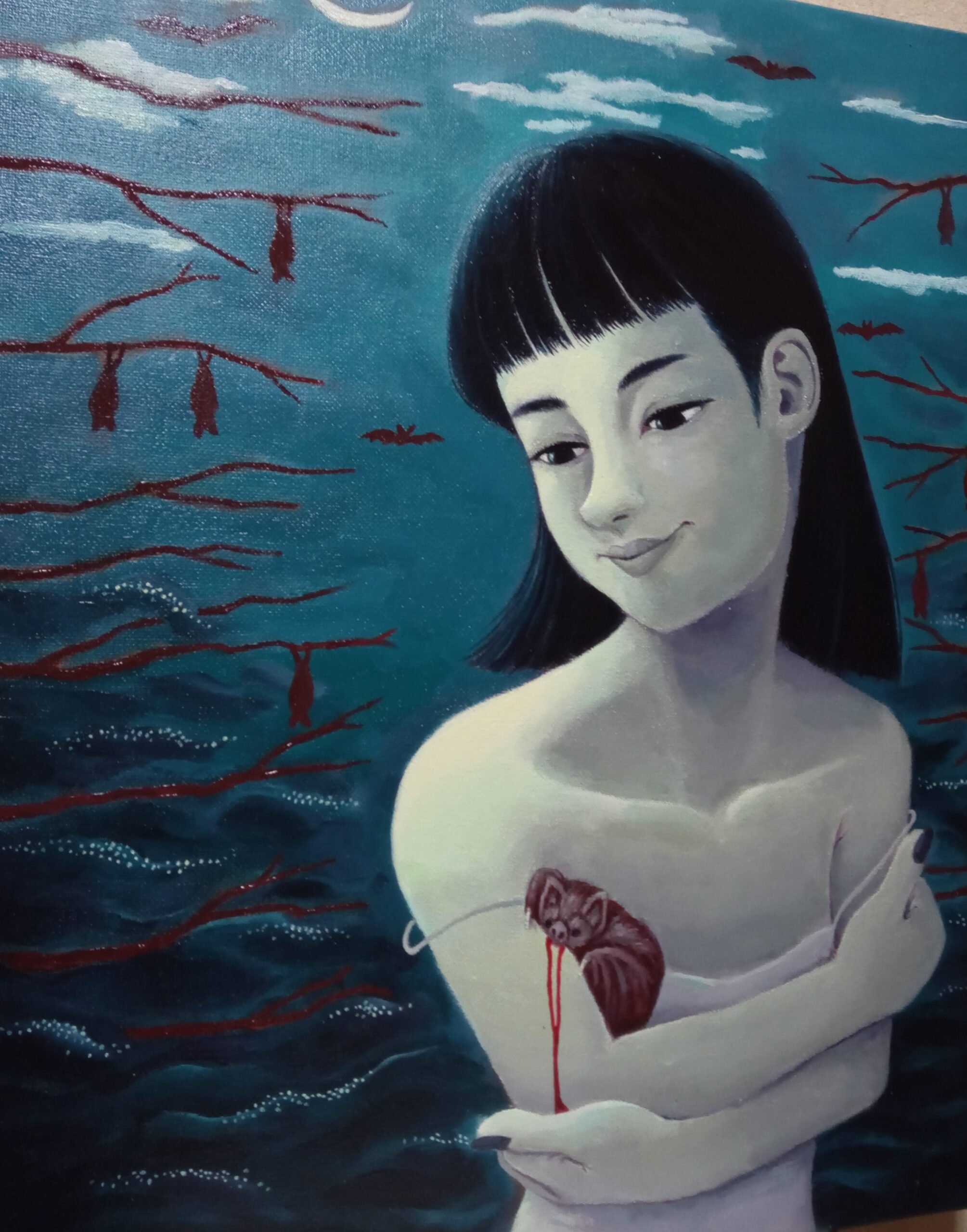 series Monster&Fairy⑱ 伝説の妖怪や怪物、妖精などを現代風にアレンジして表現しました。 「いつもありがとね…感謝の気持ちよ♡」と小夜子ちゃん。仲良しのコウモリ君にお裾分けです。これからもよろしくね♡