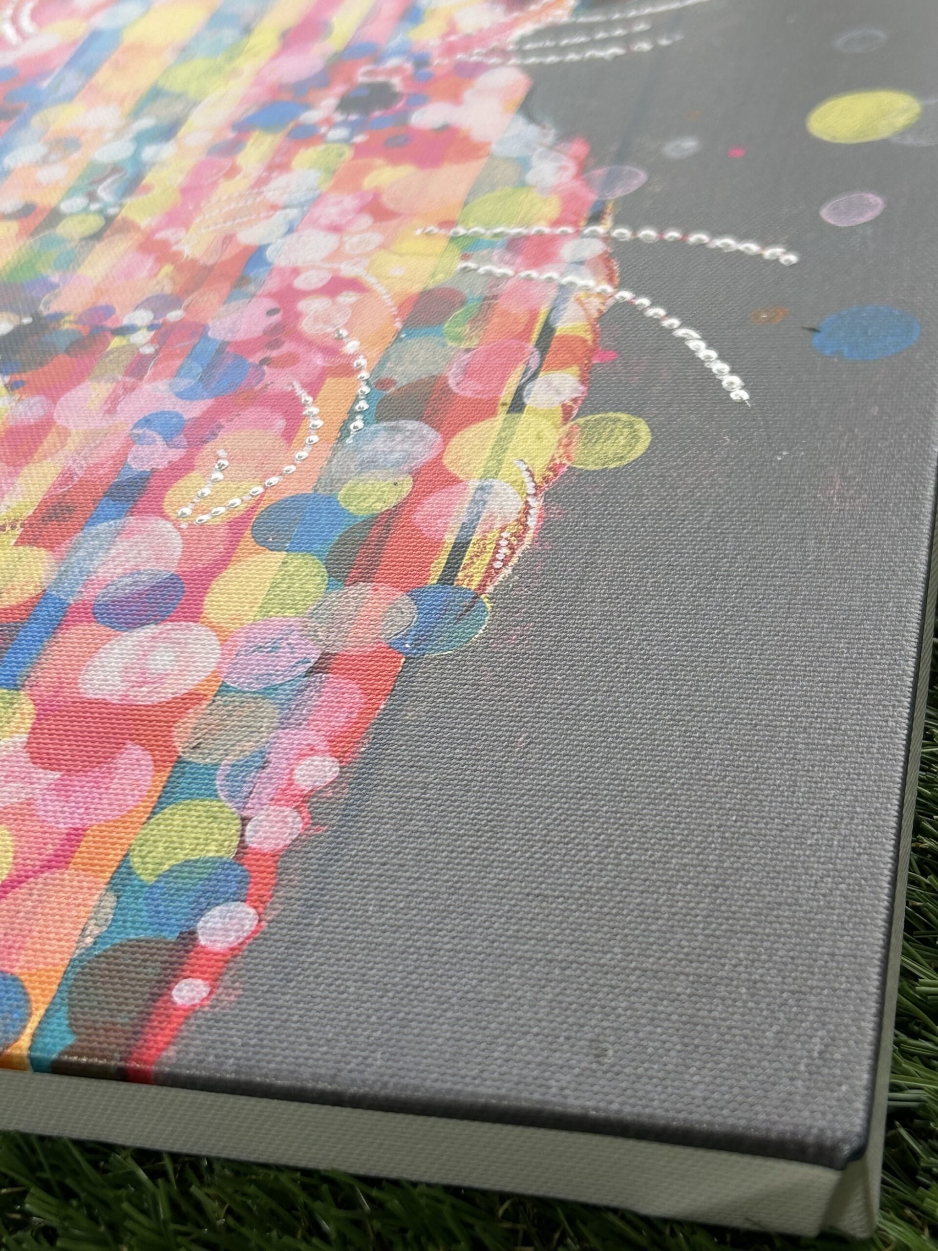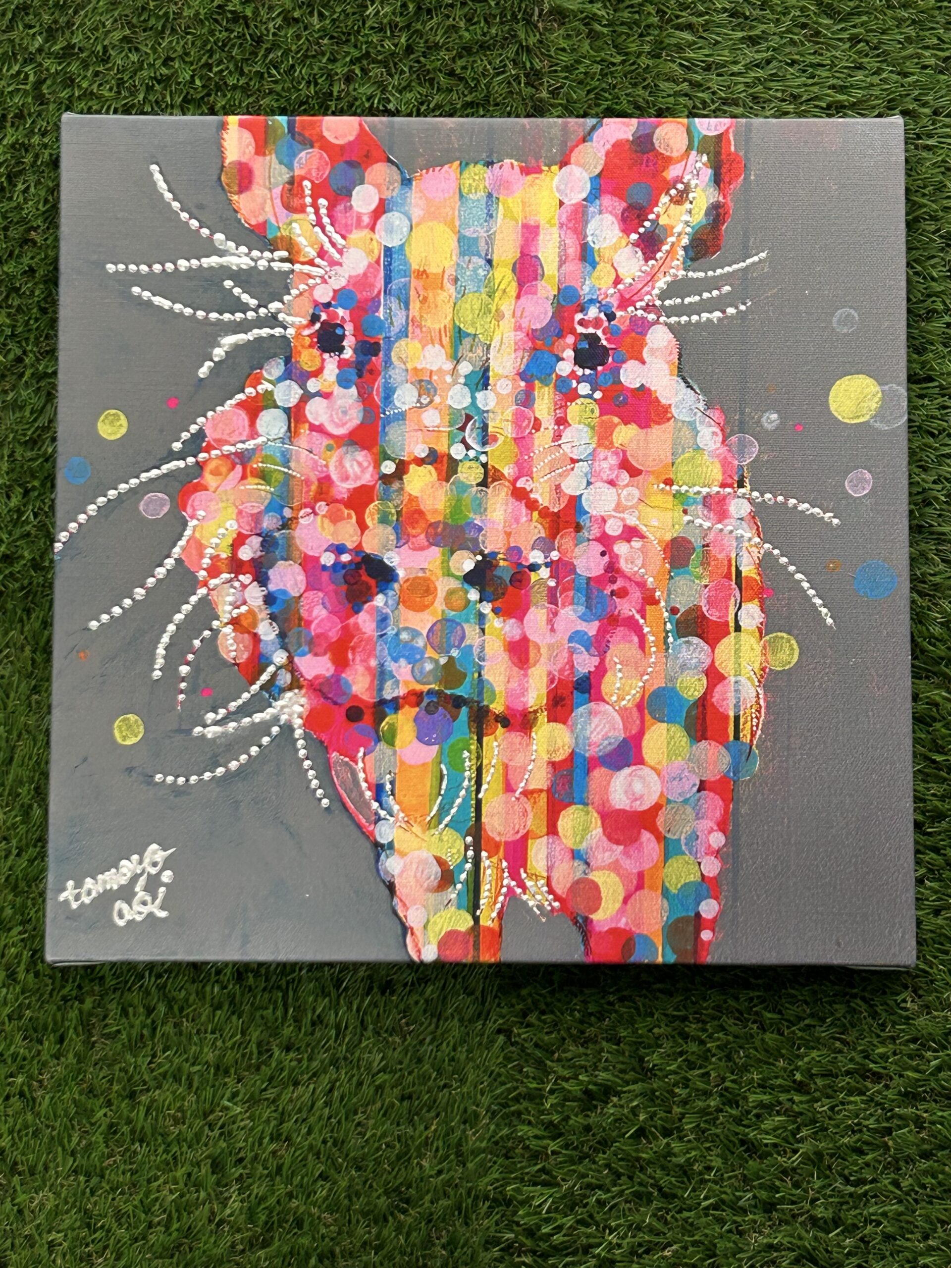 ピンク等鮮やかな色で下地をつくり、光の粒が集まるようにブタちゃんを表現 親しみのあるアニマルの表情が観る人の元気を後押しできたら嬉しいです