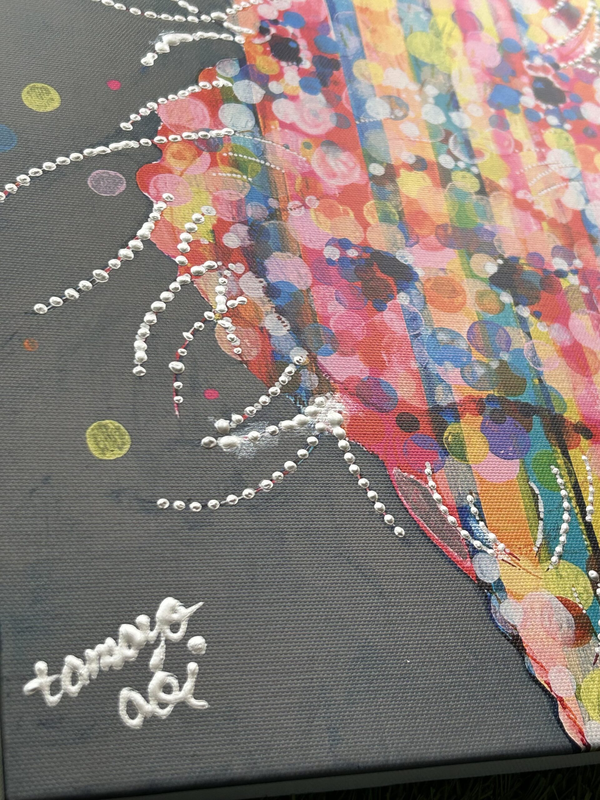 あおいたまよ の〝ブタしかかたん〟の複製画にアクリル絵の具でパール色を加筆 サインと髭の部分に絵の具の厚みがあります