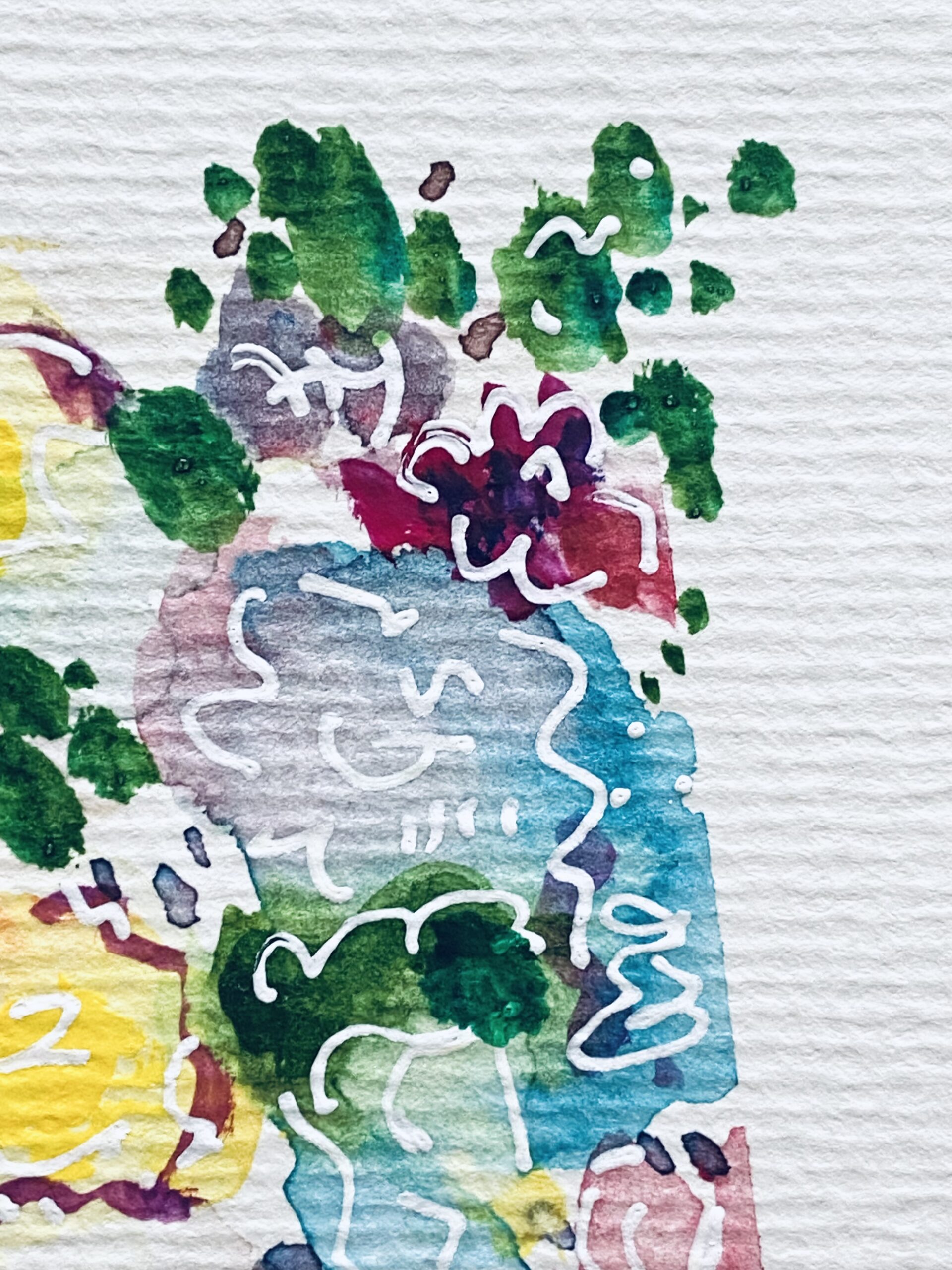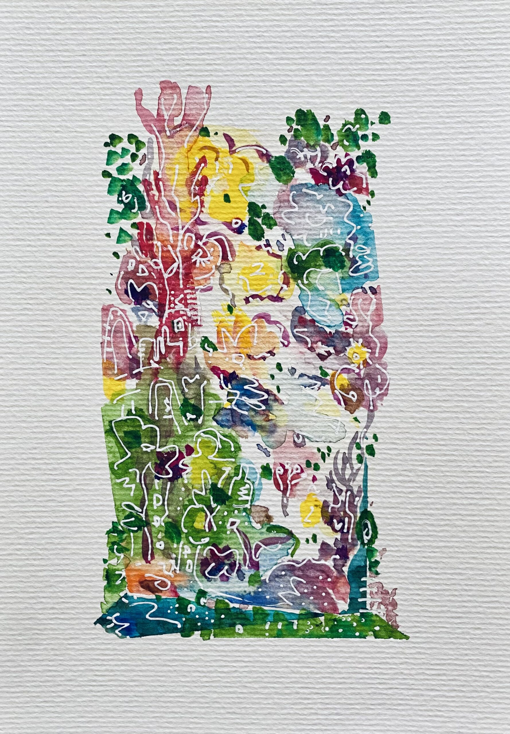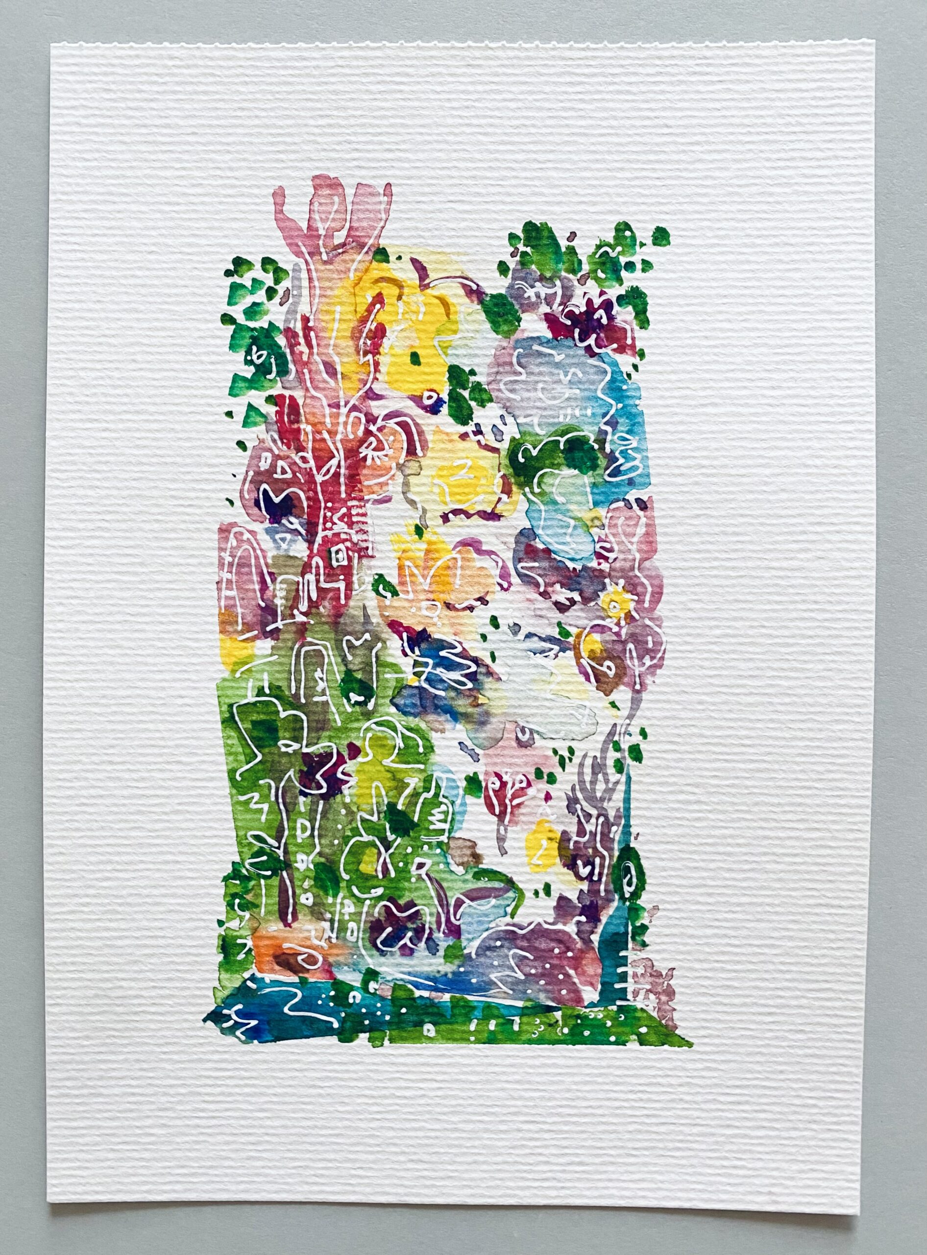 2008年 浮かんだイメージを付箋にボールペンでスケッチ。2012年になりそれをまとめたものを知人に見せたところサイズや画材をかえて絵画として発表することを勧められ、2013年、公募展にA4サイズのカードボードにペン・パステルで描いた作品を出品。その後アクリル絵具での創作をスタート。
