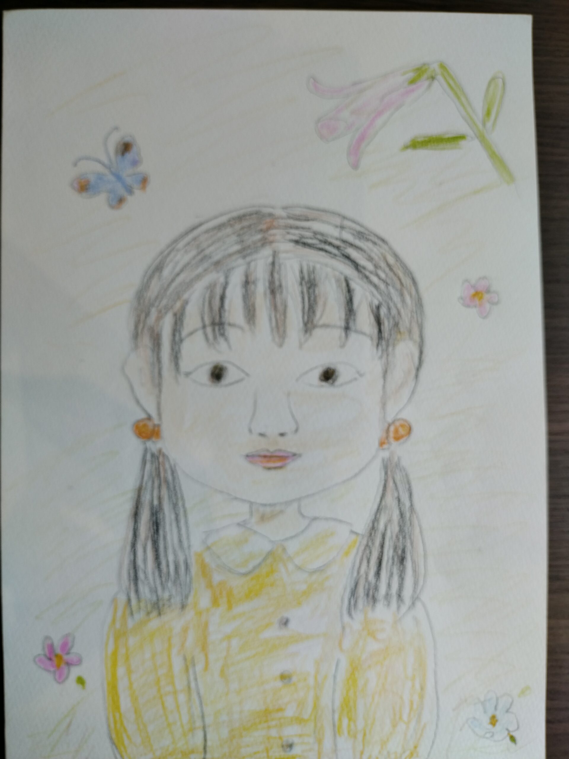 少女や花、チョウを描きました。かわいらしい雰囲気です。