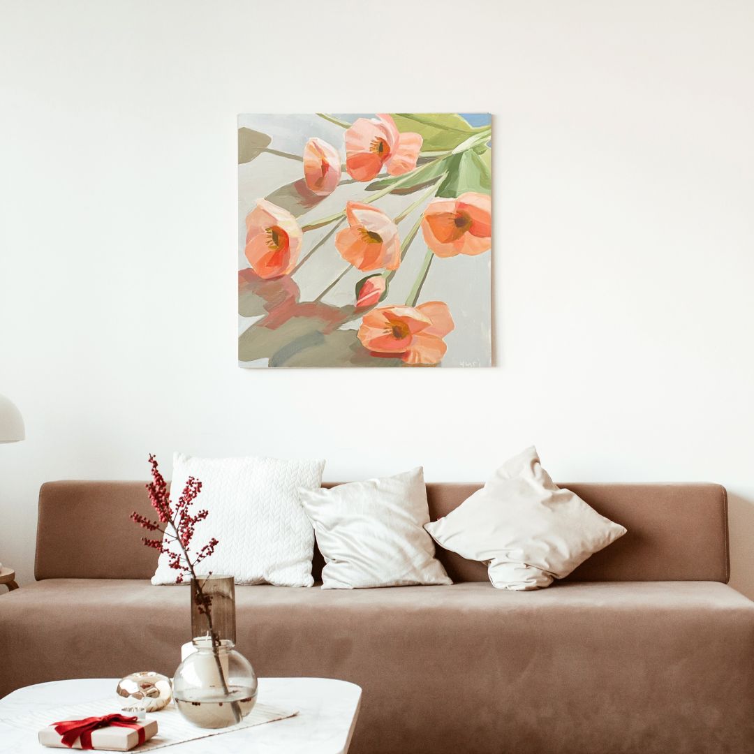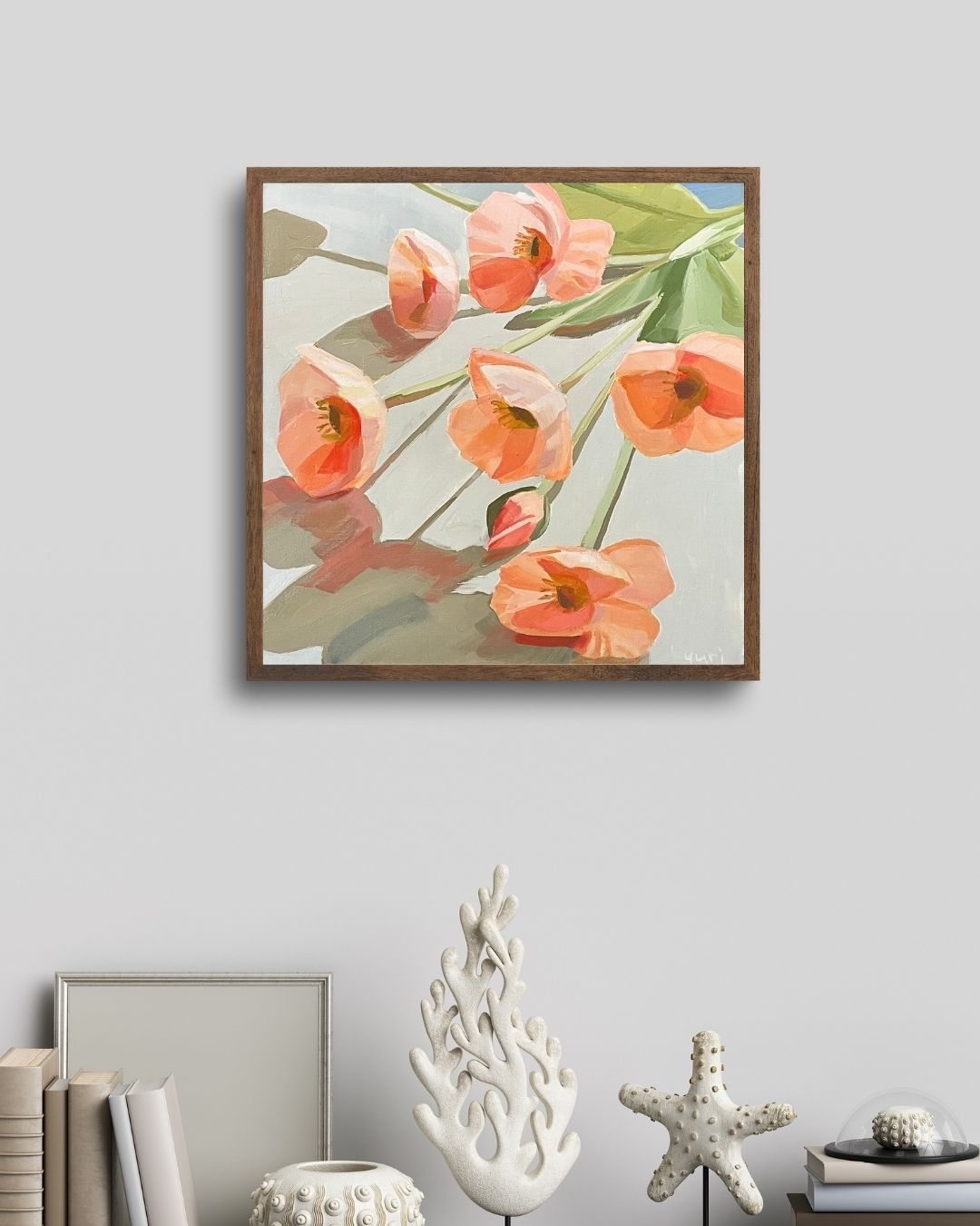 サーモンピンクのポピーがとても愛らしいので、東向きの窓際に置いて、太陽光で描きました。
