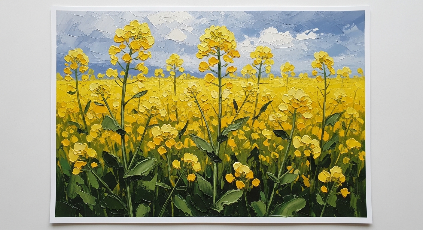 厚塗りの筆致が花々の立体感を際立たせ、黄色の絨毯が空へと広がるような錯覚を生む。