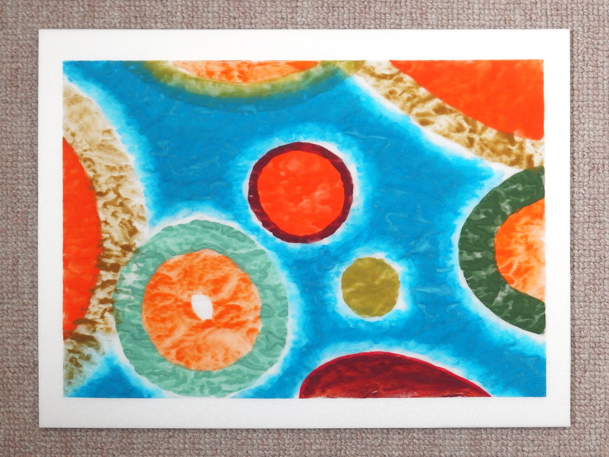 スチレンペーパーという光沢のある真っ白な素材に、岩絵の具自体の美しさが際立ちます。この組み合わせを発見し、気に入って使い続けています。