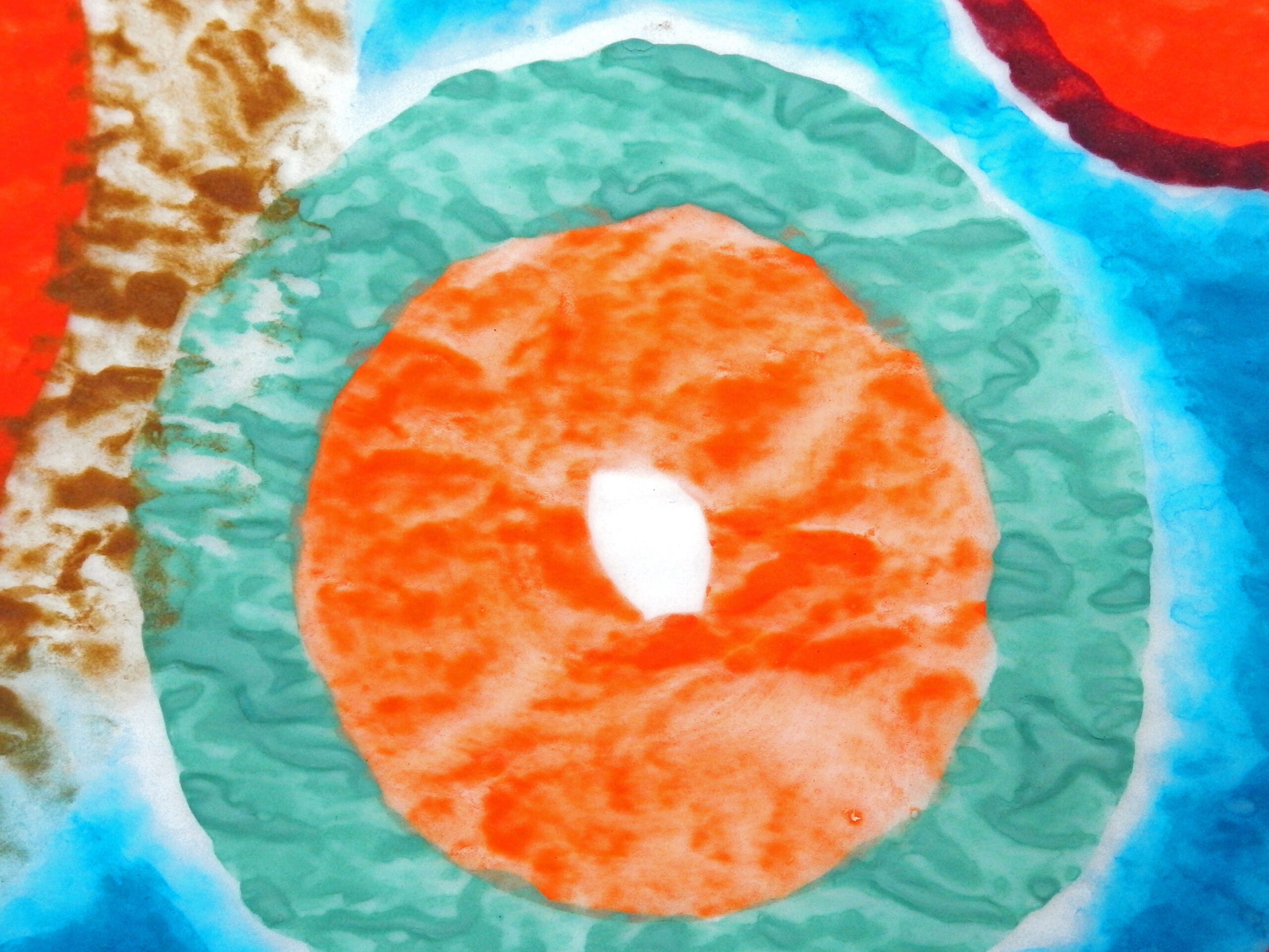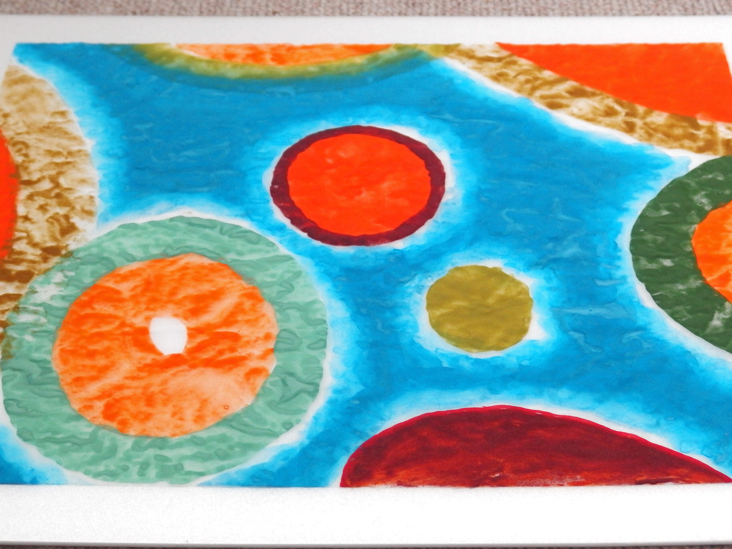 天然素材の和紙に膠を使うのが「日本画」の常識ですが、あえて人工素材を使っています。