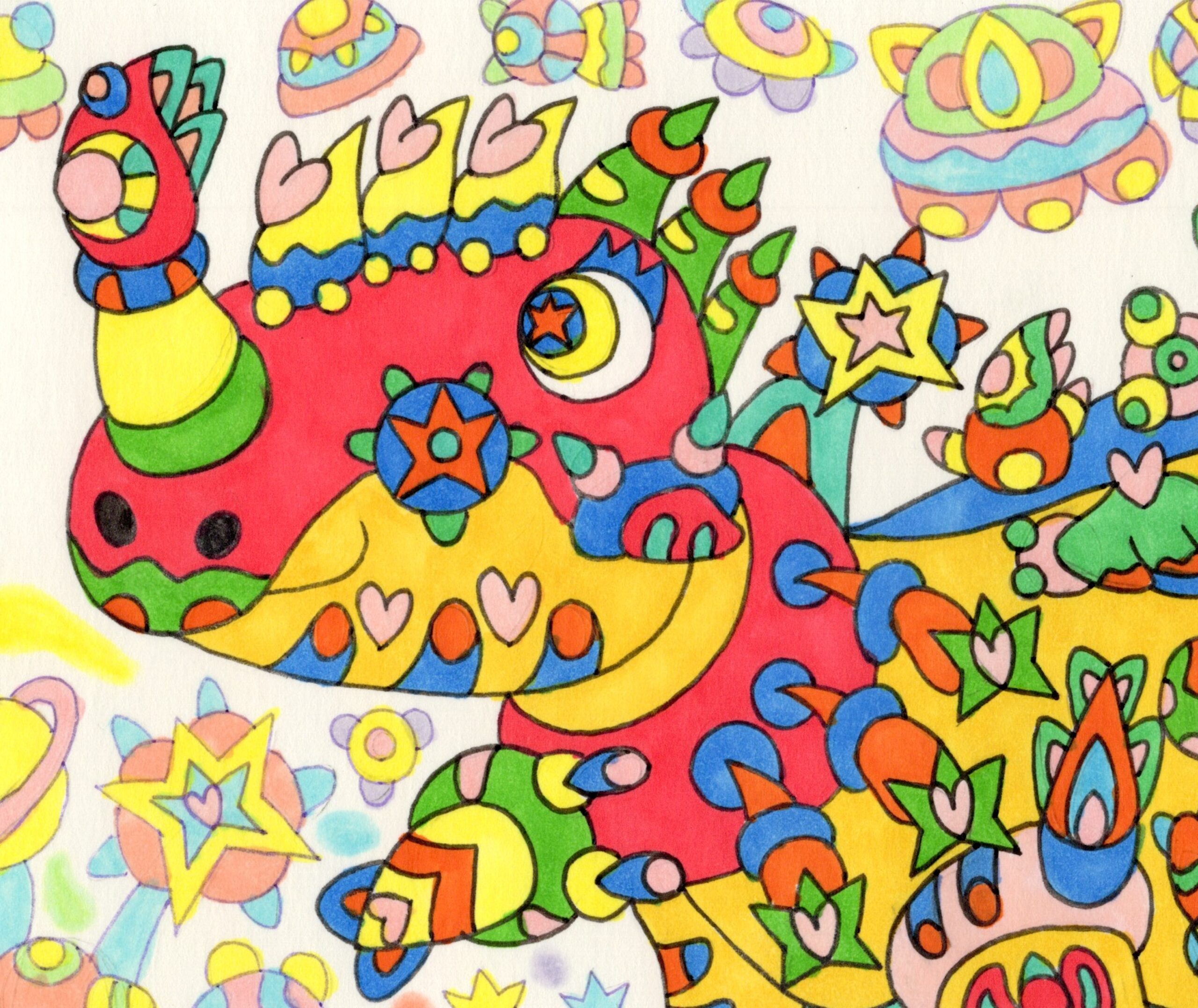 宇宙のどこかにあるという星や惑星を生み出す海。その海を海の名産が多い福井県出身の恐竜であるフクイサウルスから生まれた竜が守っています。その様子をたくさんのUFOが安心して応援しています。