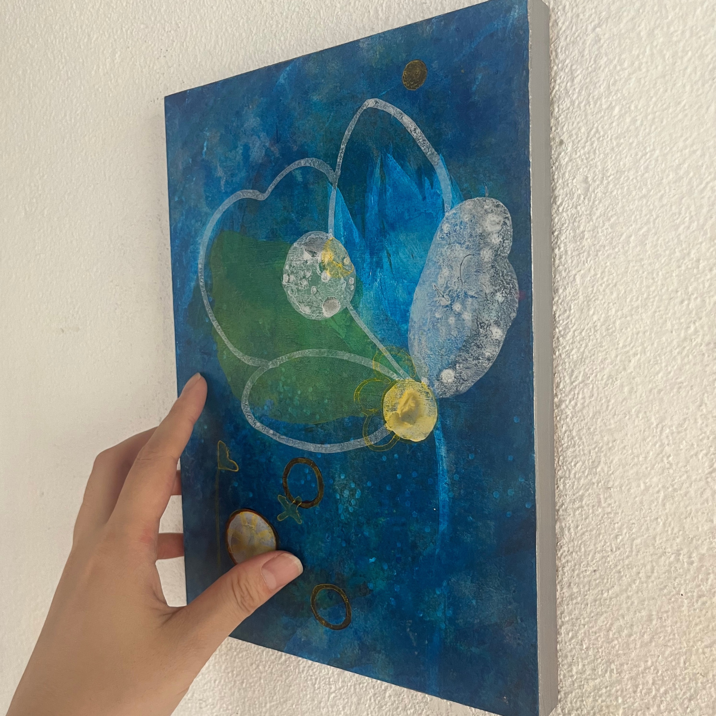 「もっと自由に、絵との関係を楽しんでほしい」「絵についてしまった傷や風合いの変化も、古道具の味わいのように楽しんでほしい」という願いから生まれた「触れる絵画」シリーズの1作品。絵の表面も優しく触ることができます。