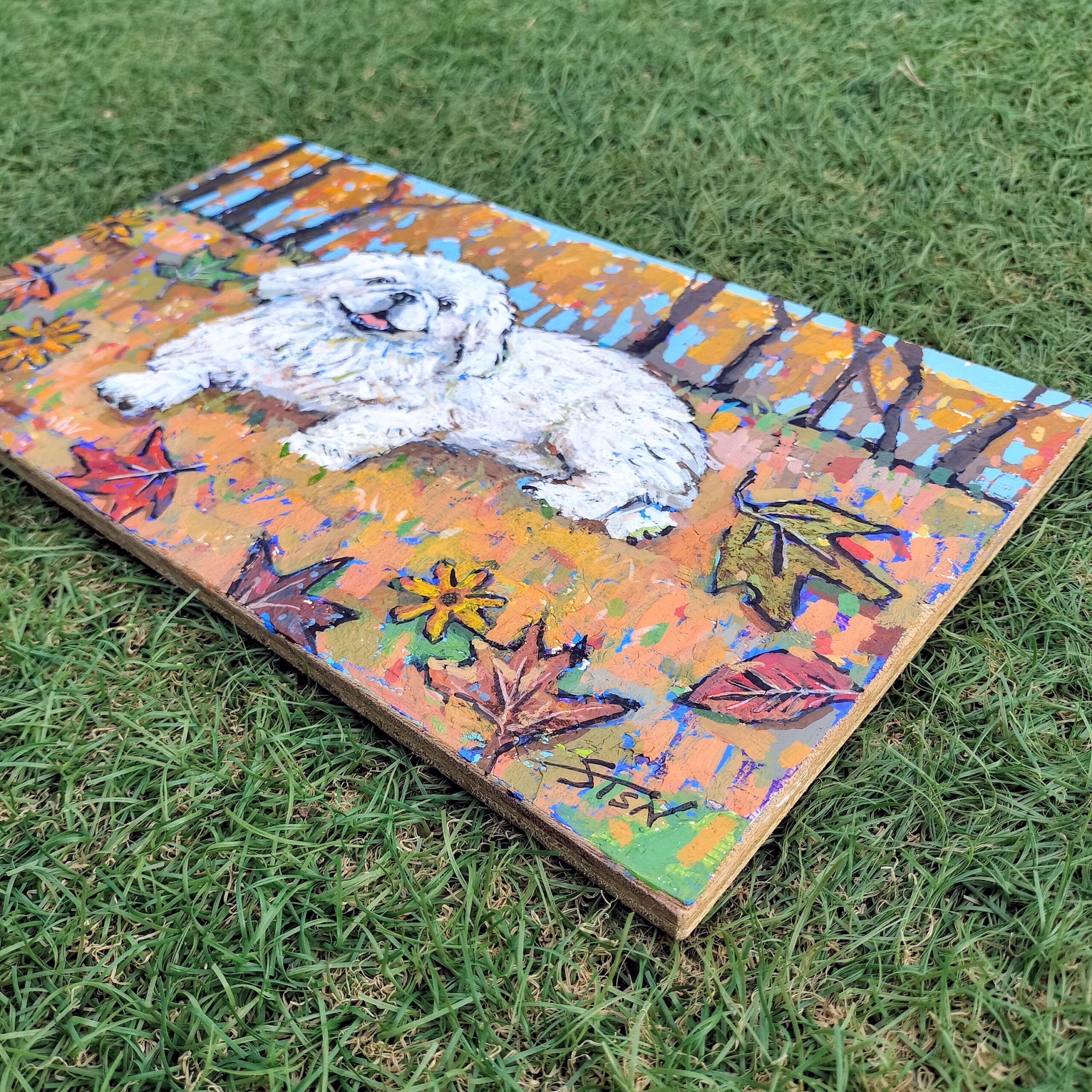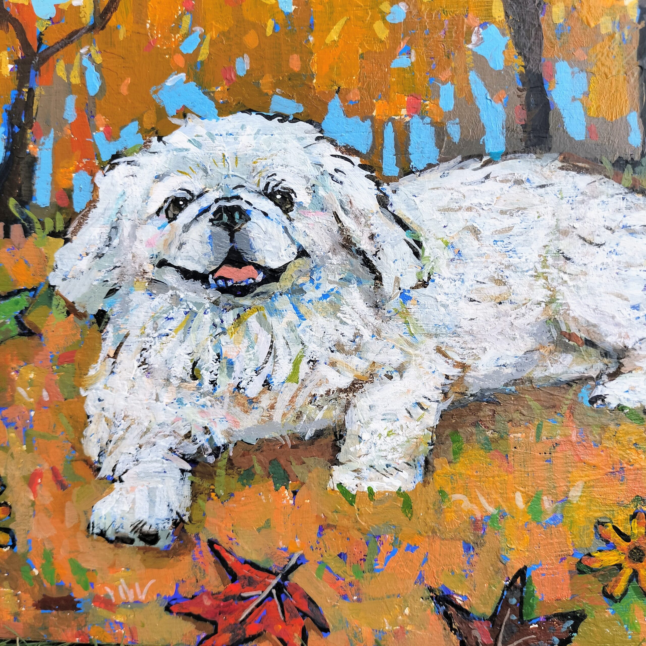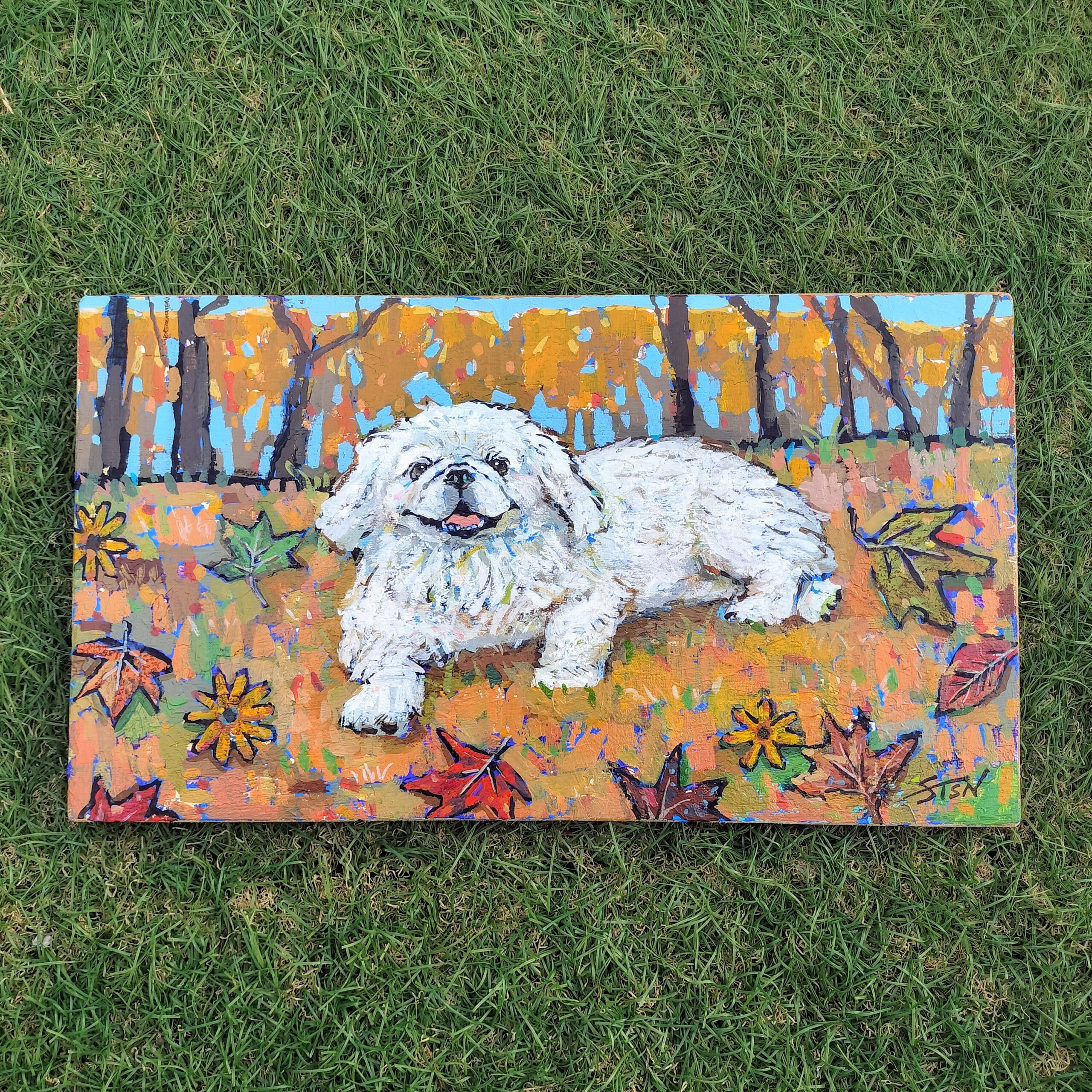 色とりどりの落ち葉といっしょに、気持ち良さそうに寝転がるペキニーズ。