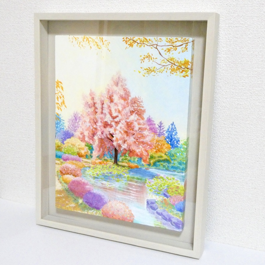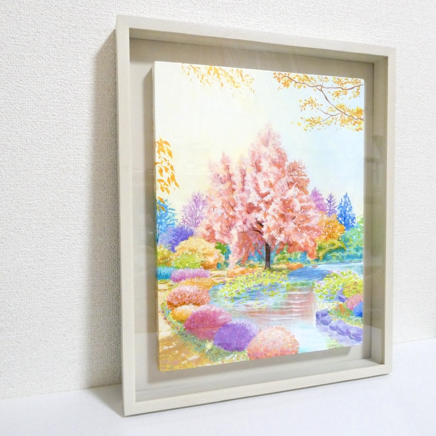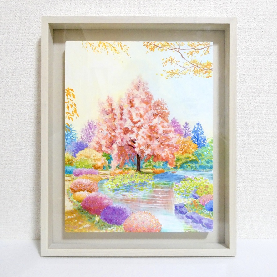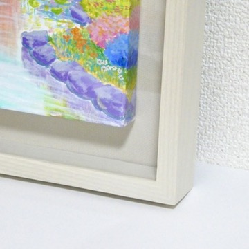 カラフルな森の風景画です。実際に見た景色をもとに想像を膨らませて描いています。自然の中を歩いた時の心健やかで明るくなれる体験を光と色彩で表現しました。鮮やかな色彩でも目に優しい配色にこだわっています。絵からポジティブな力を感じていただけたら嬉しいです。