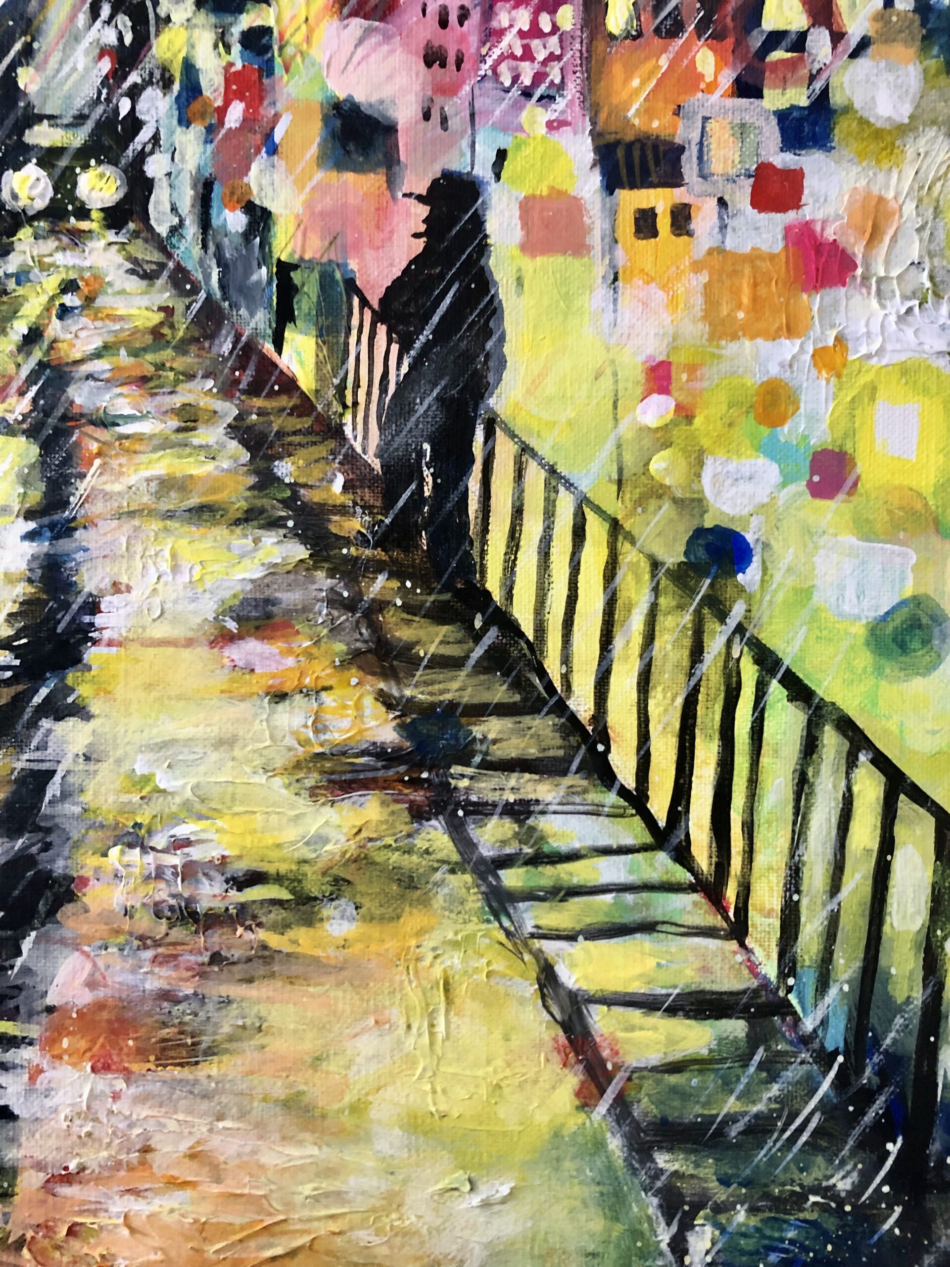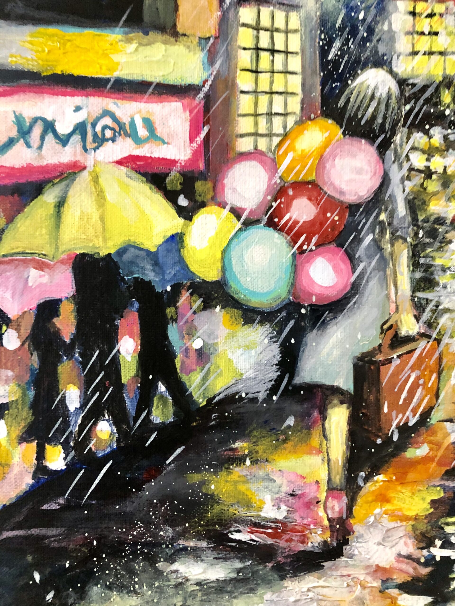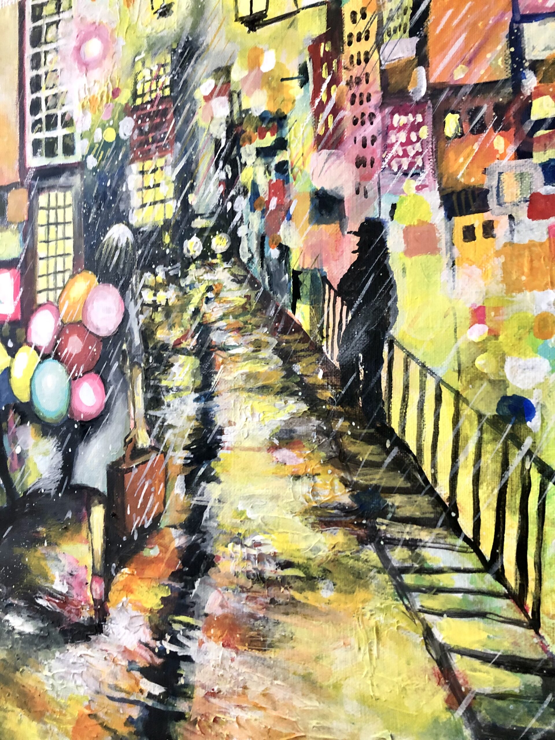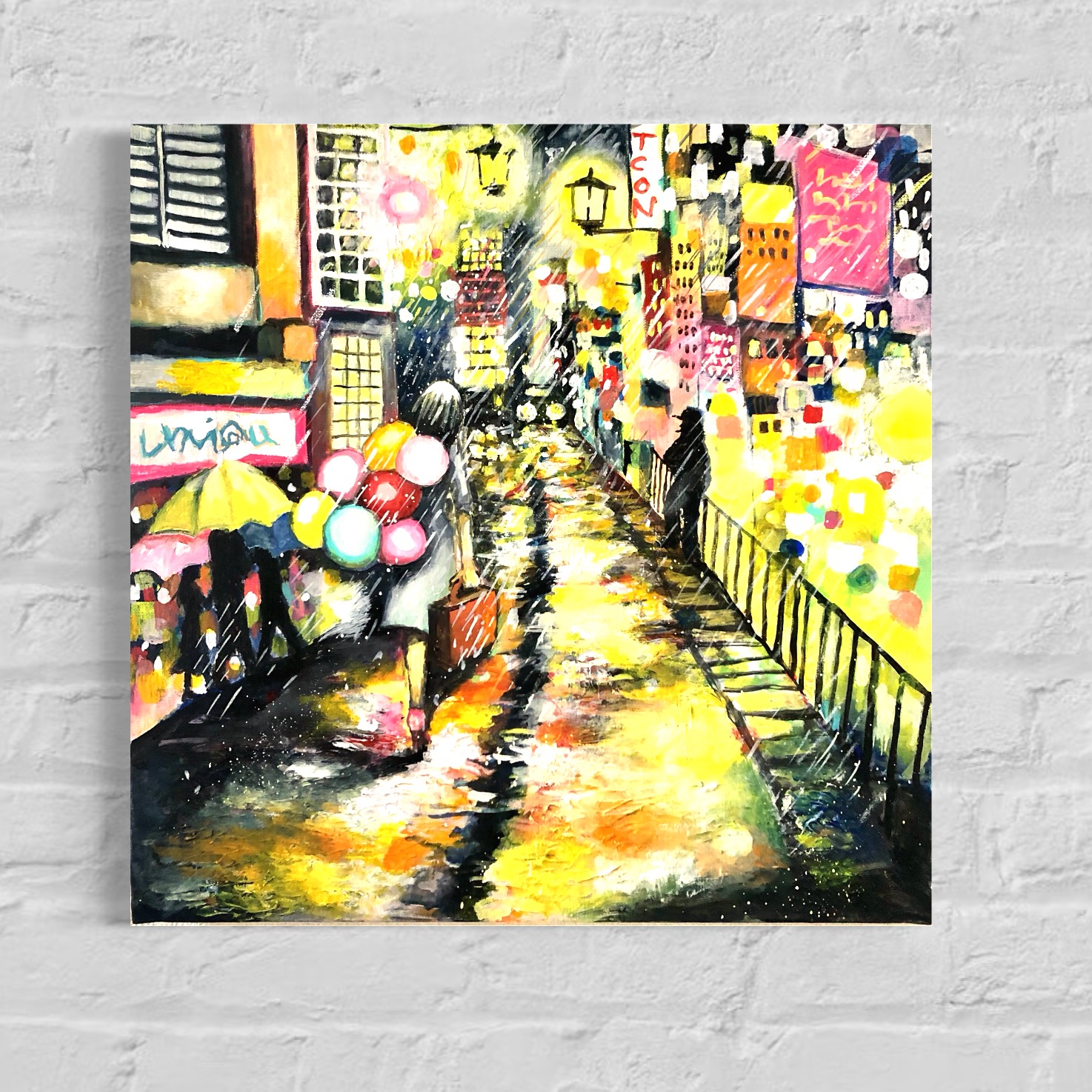 周りの人や、街、天候に流される事なく、我が道を歩むヒロインを描きました。 騒がしい、雑踏やネオン、雨音の中でも自分を見失わず信じられるのは自分の足だけ。 強い志があれば、何も怖くないという想いを込めて描きました。