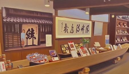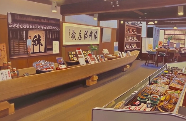 村上伝統の鮭文化を伝える「喜っ川」の店内を、温かみのある油絵で再現しました。