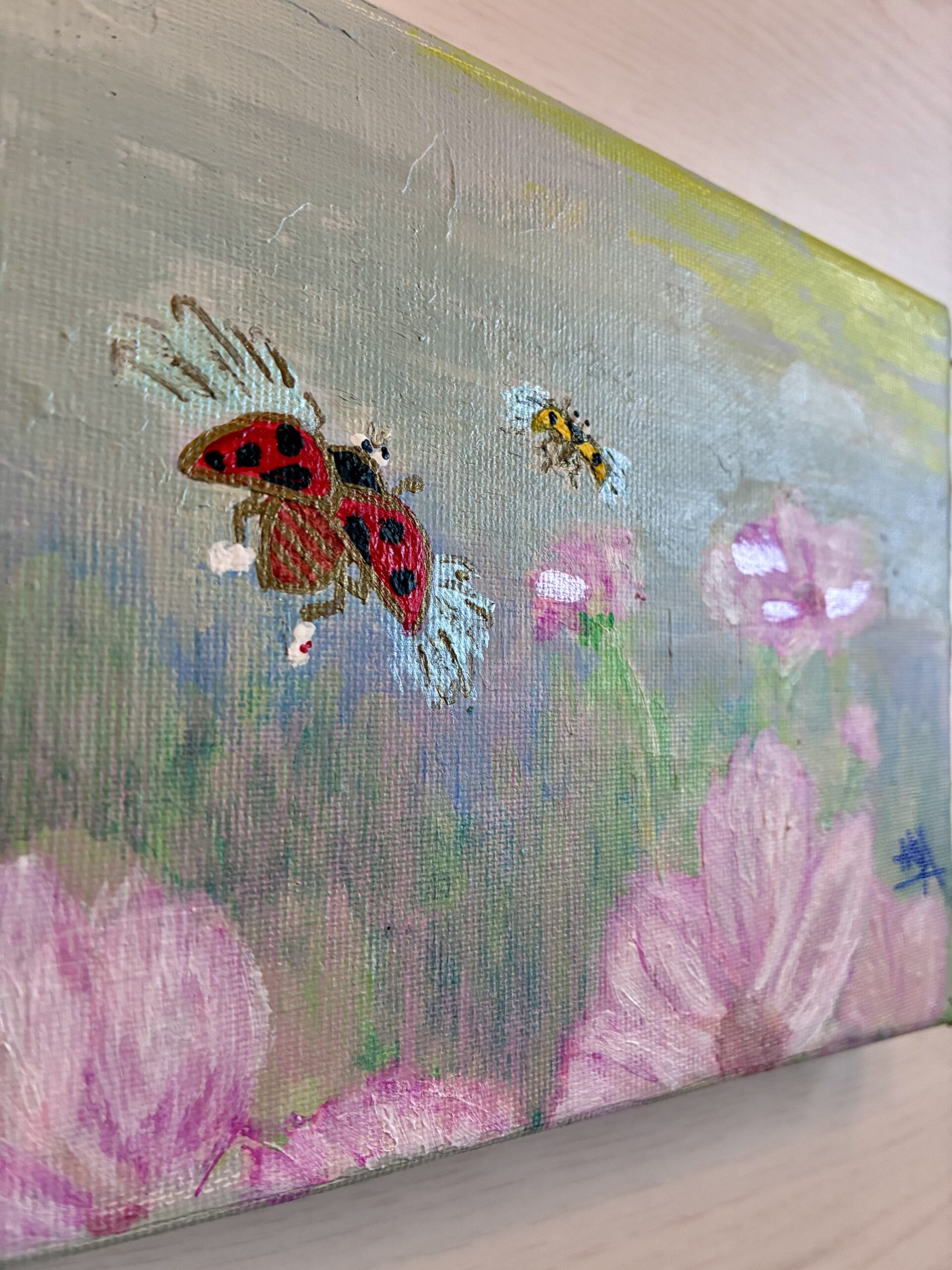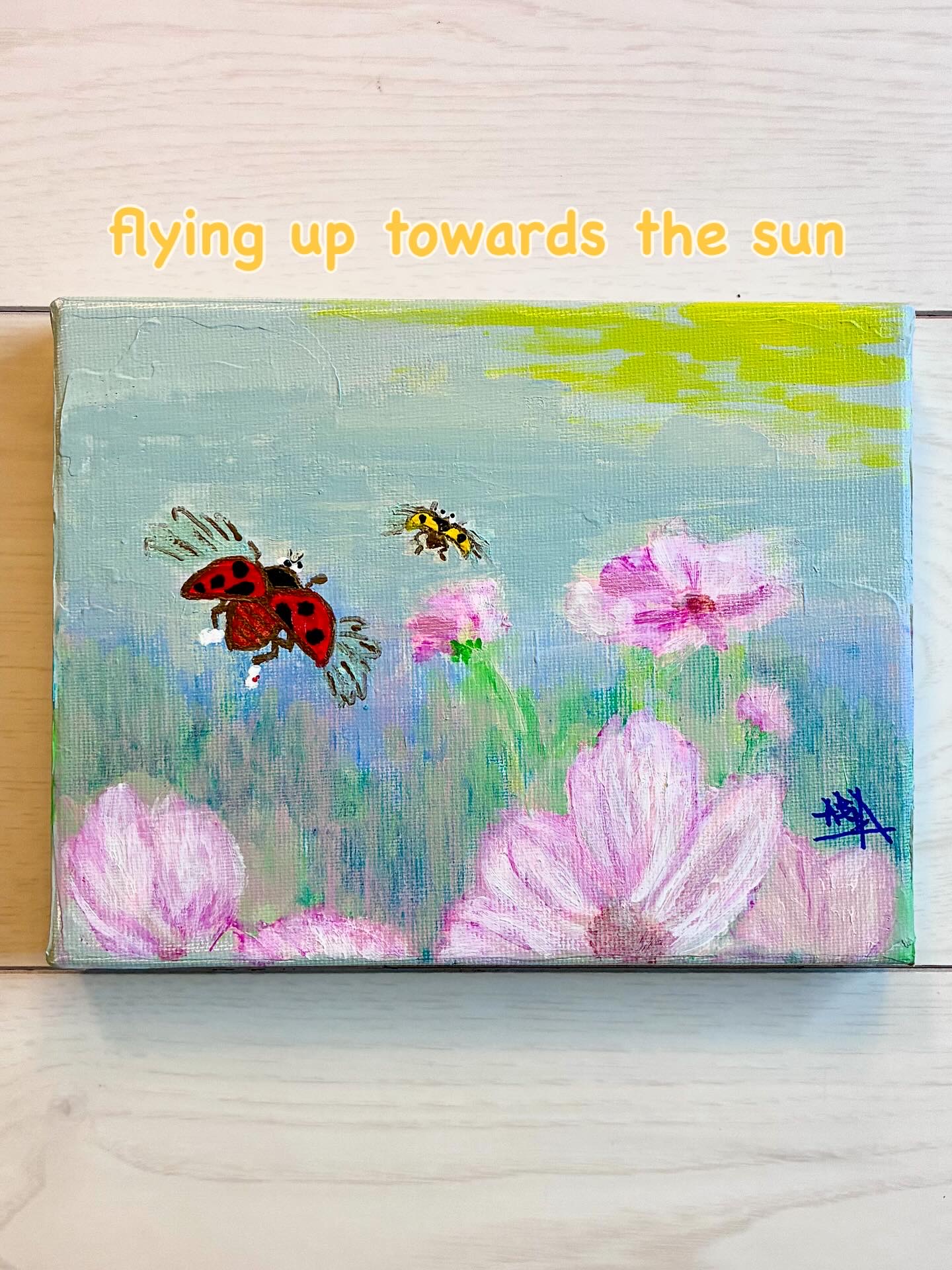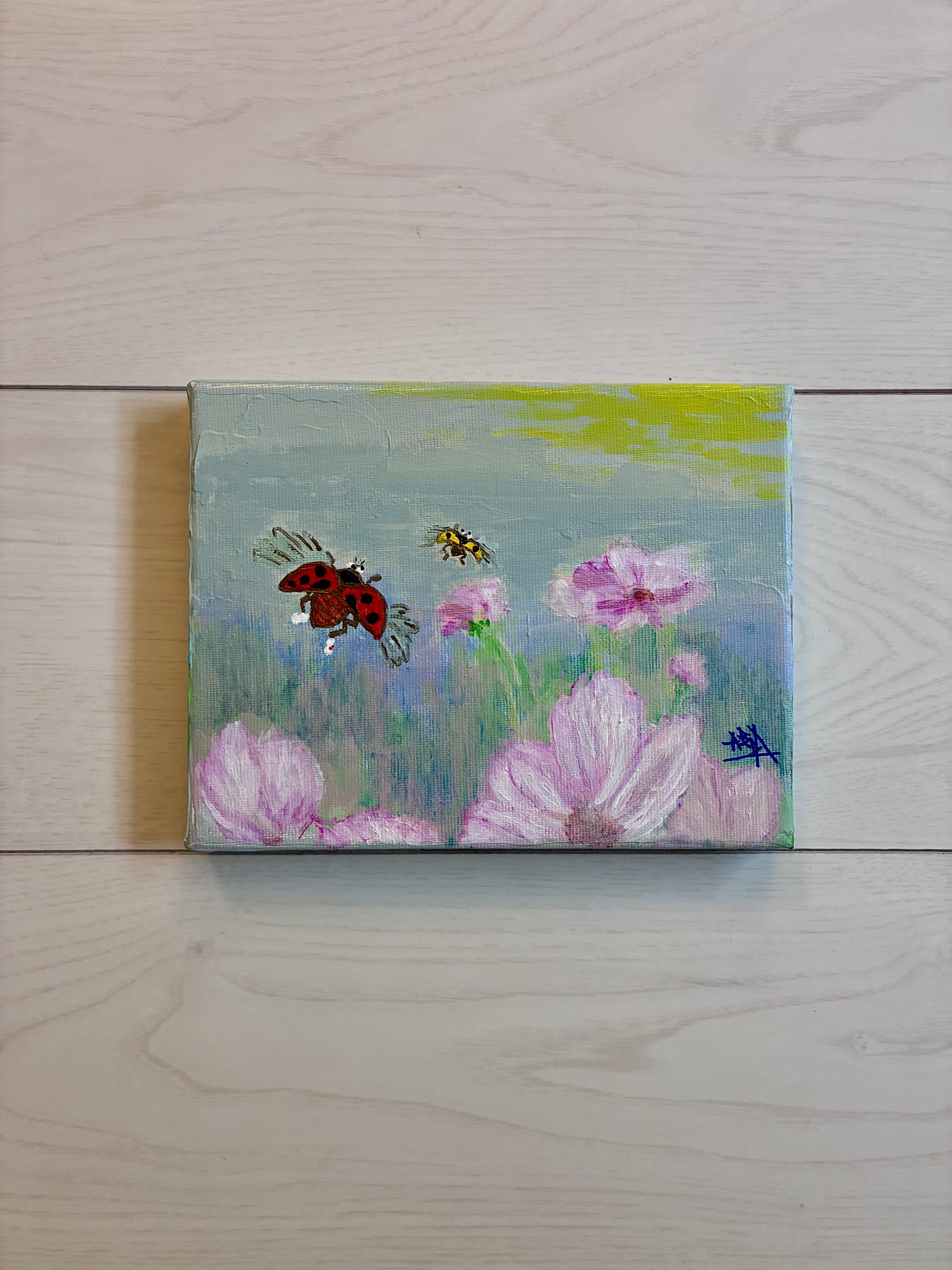 Ms.Belly シリーズです!140×180×18mmの小さいサイズのアートです。Bellyさん、揺れるコスモスの上をおひさまに向かって飛び立ちます。