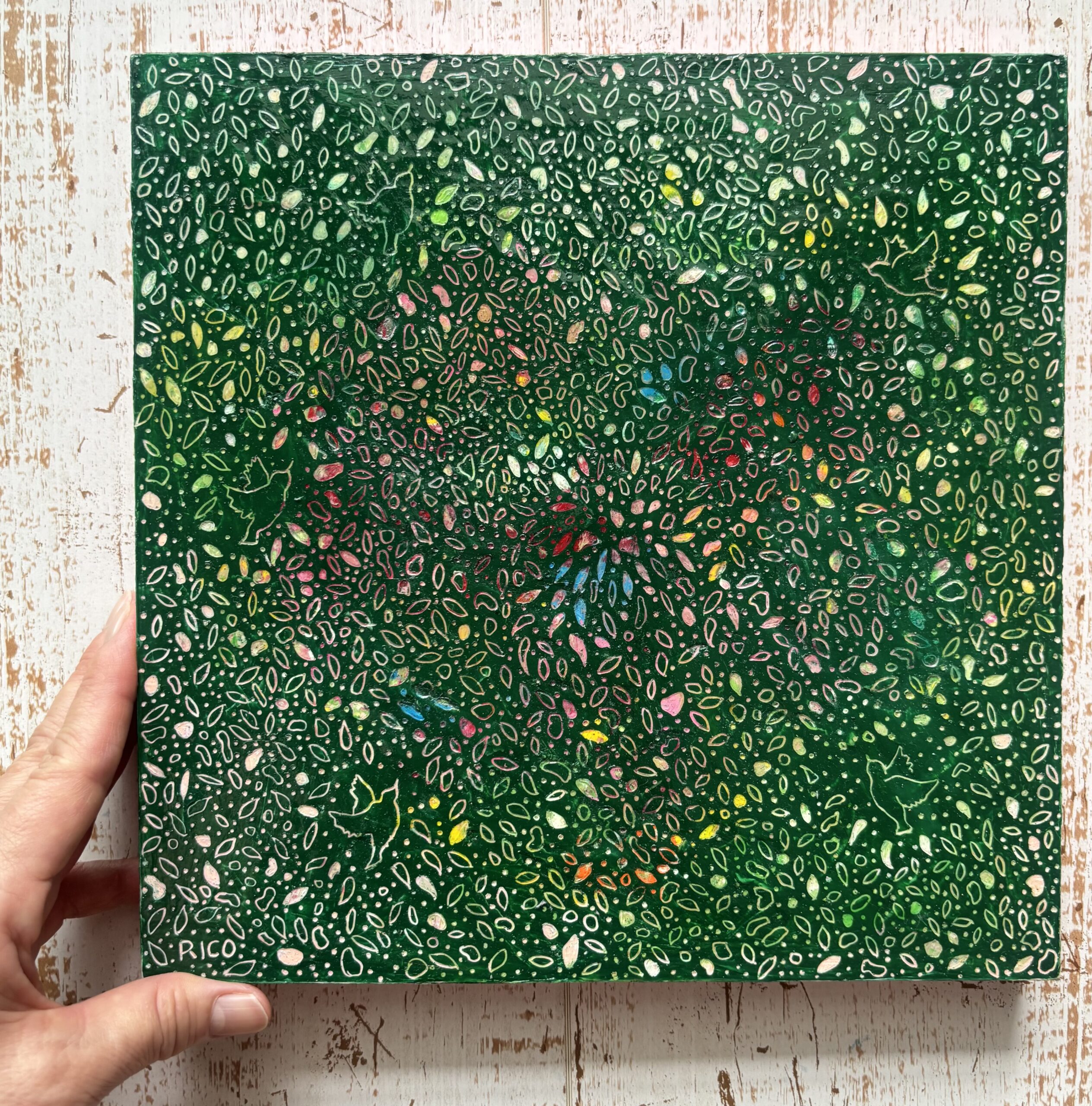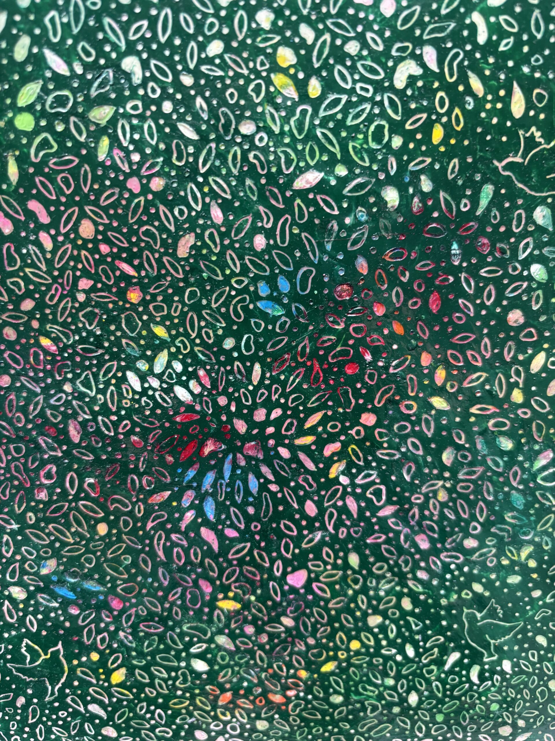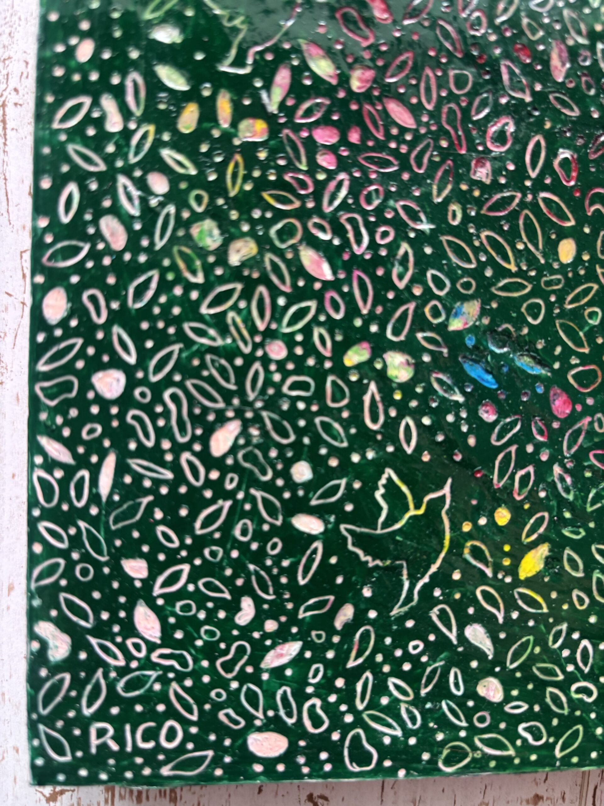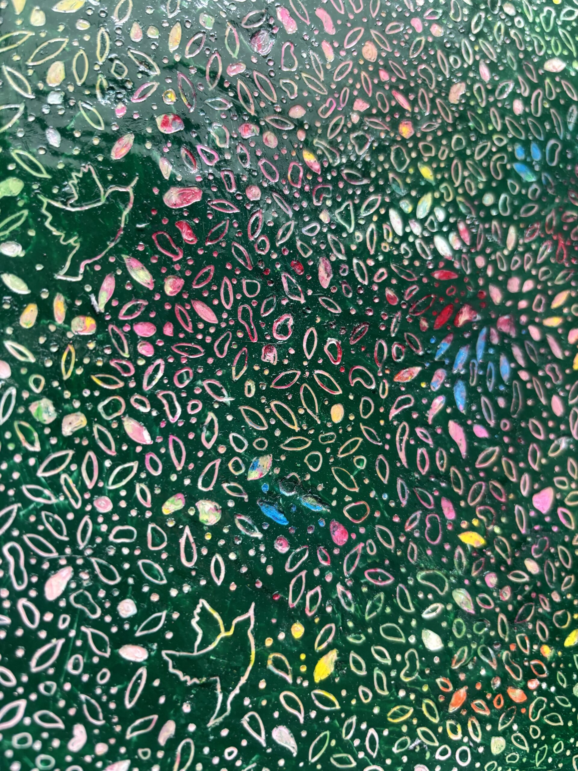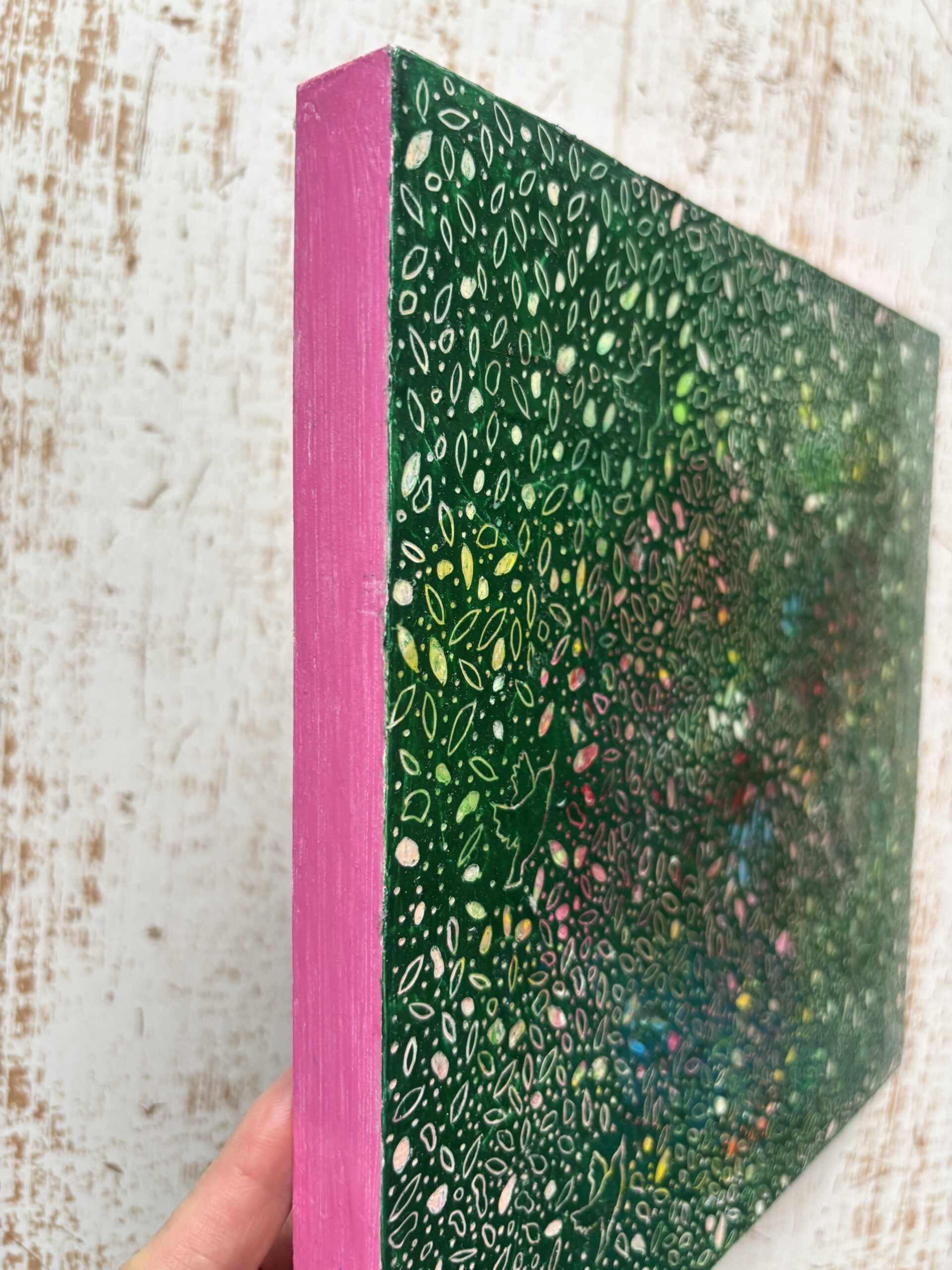 木製パネルにクレヨンを塗り重ね、上から削るように描くスクラッチアートです。