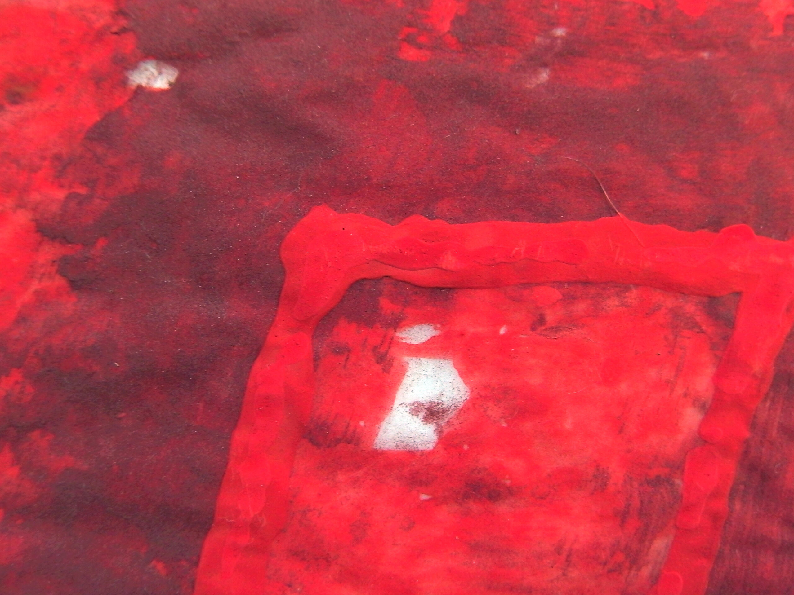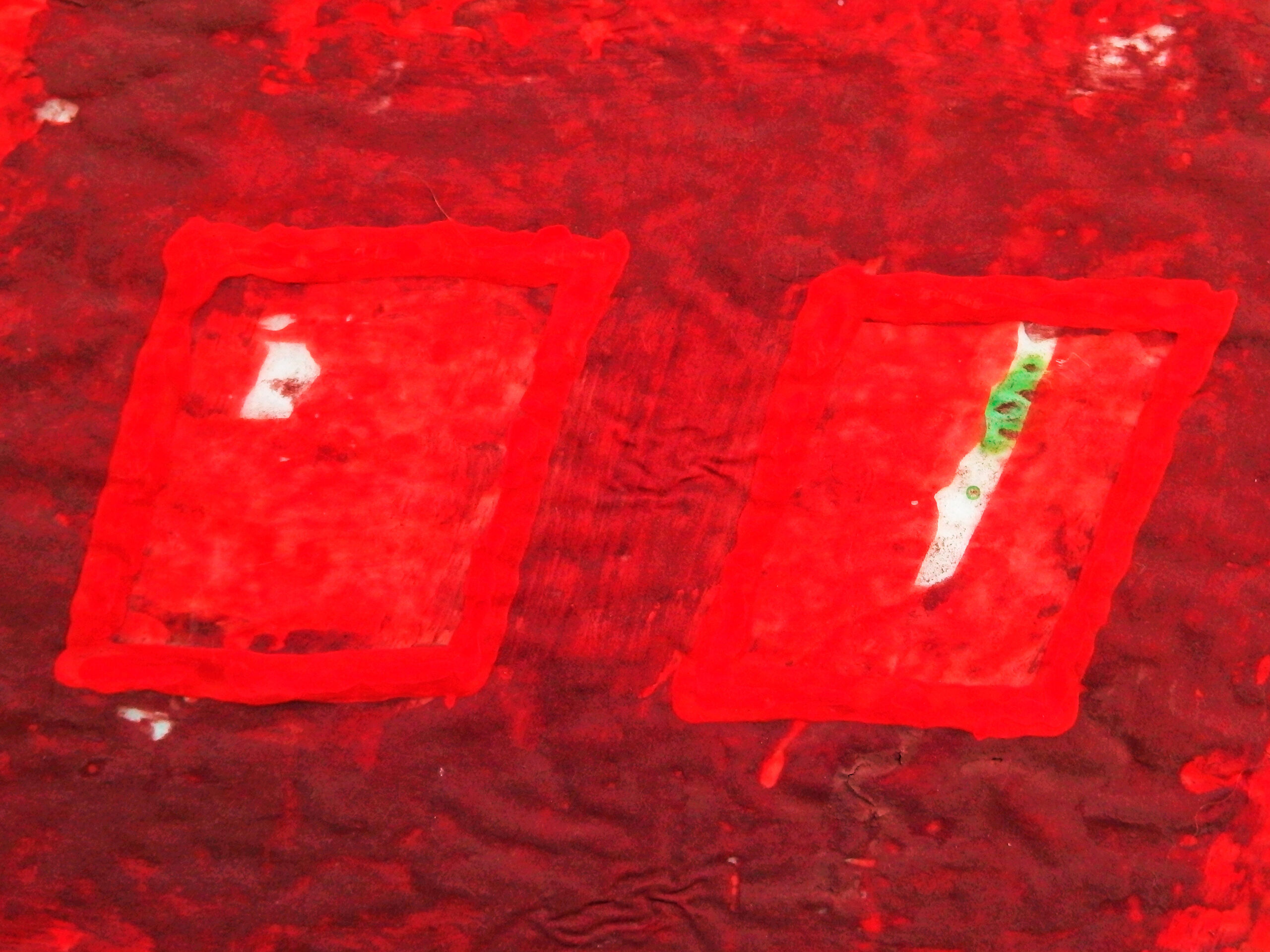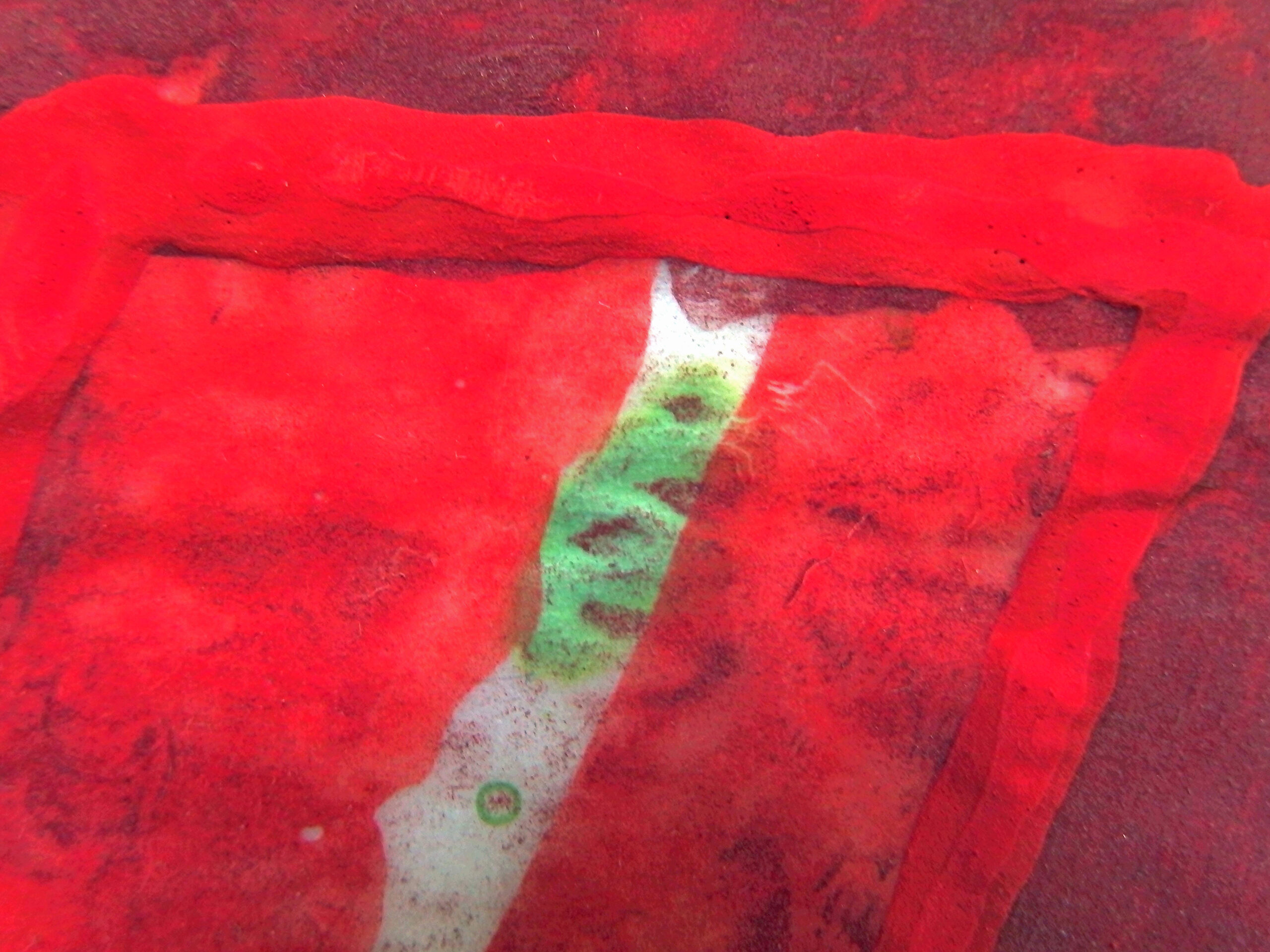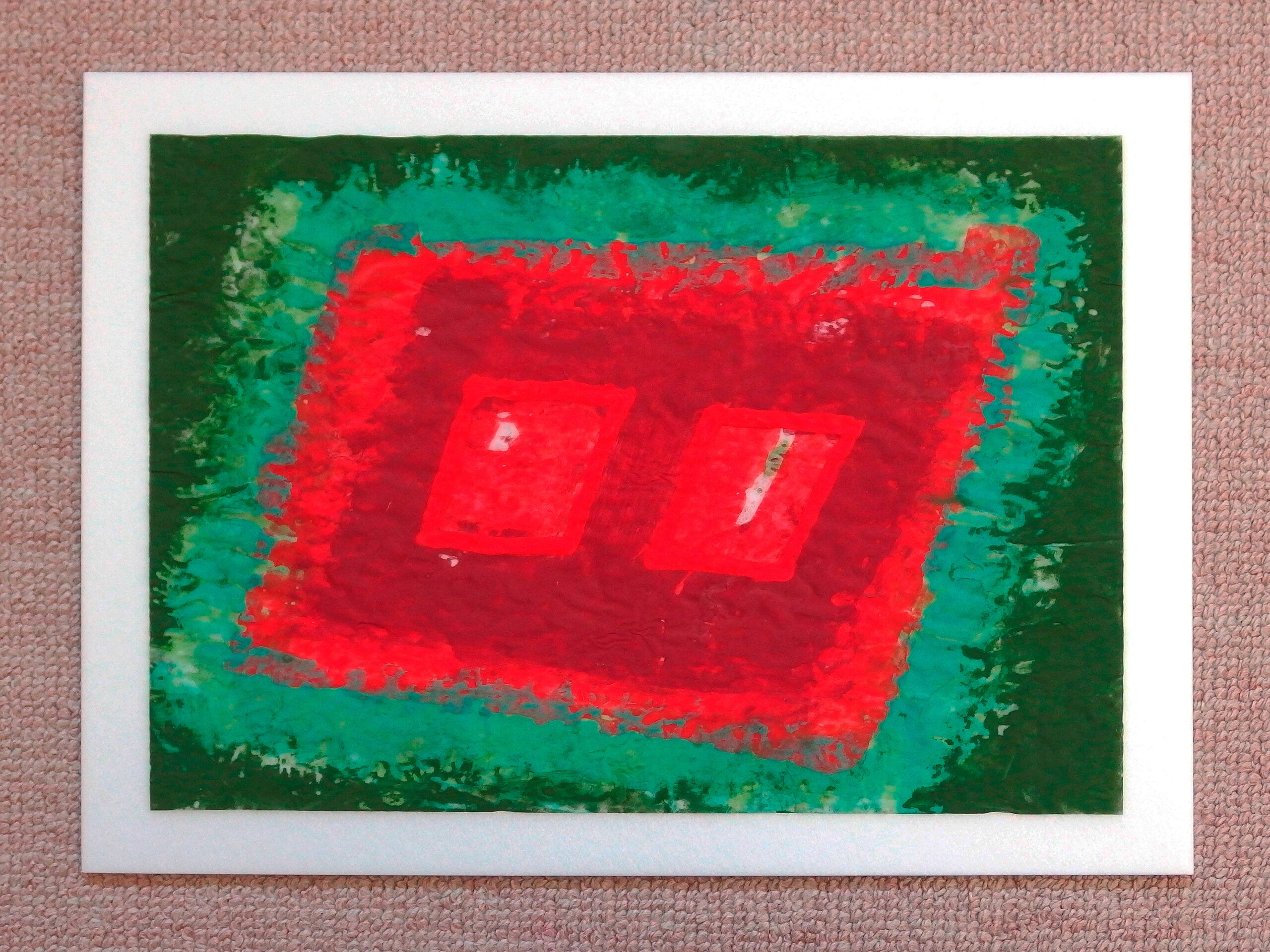 天然素材の和紙に膠を使うのが「日本画」の常識ですが、あえて人工素材を使っています。