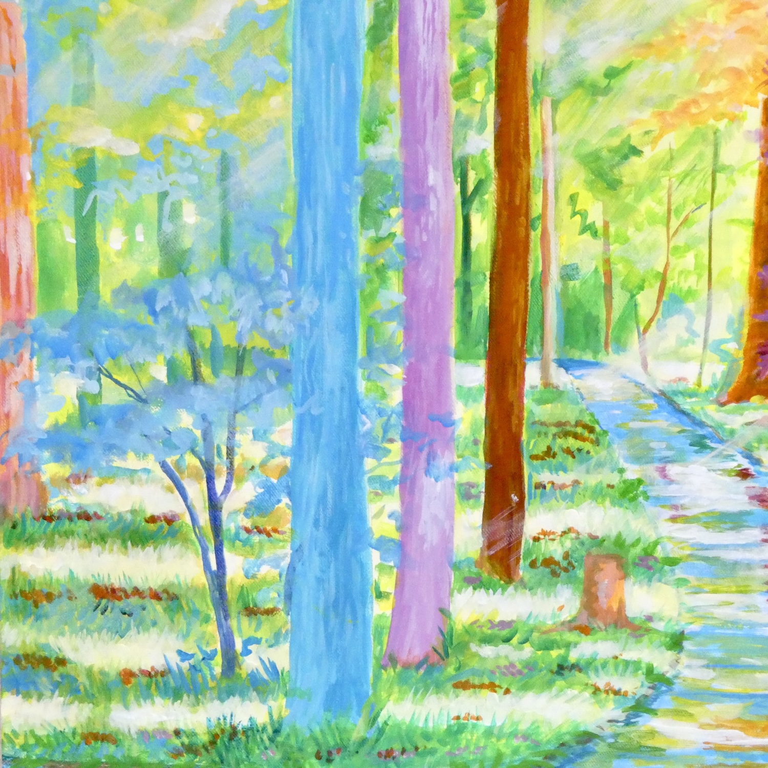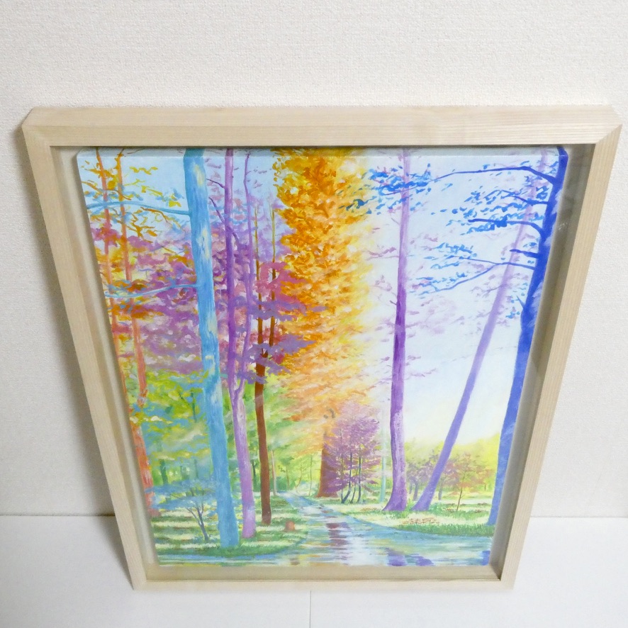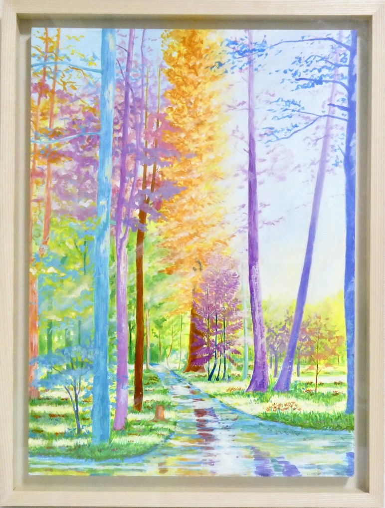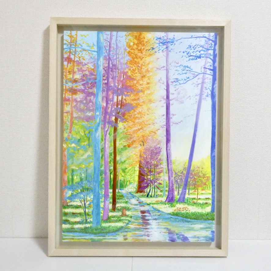カラフルな森の風景画です。実際に見た景色をもとに想像を膨らませて描いています。自然の中を歩いた時の心健やかで明るくなれる体験を光と色彩で表現しました。鮮やかな色彩でも目に優しい配色にこだわっています。絵からポジティブな力を感じていただけたら嬉しいです。