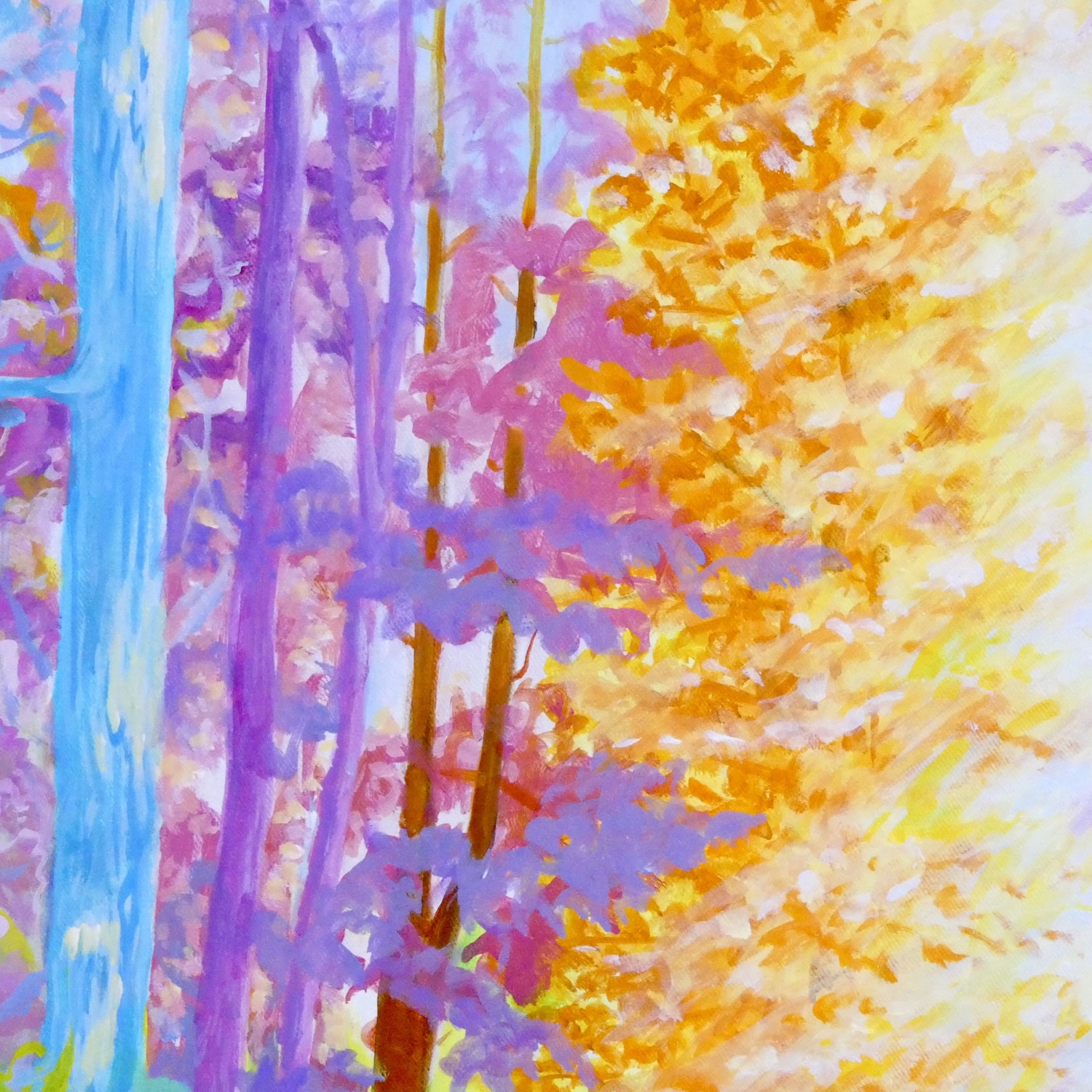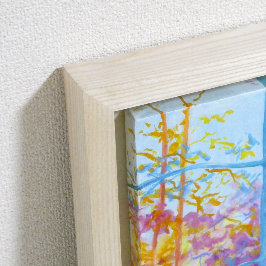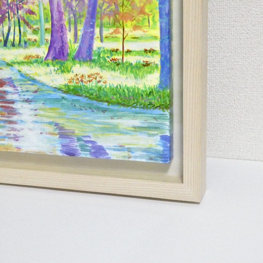 カラフルな森の風景画です。実際に見た景色をもとに想像を膨らませて描いています。自然の中を歩いた時の心健やかで明るくなれる体験を光と色彩で表現しました。鮮やかな色彩でも目に優しい配色にこだわっています。絵からポジティブな力を感じていただけたら嬉しいです。