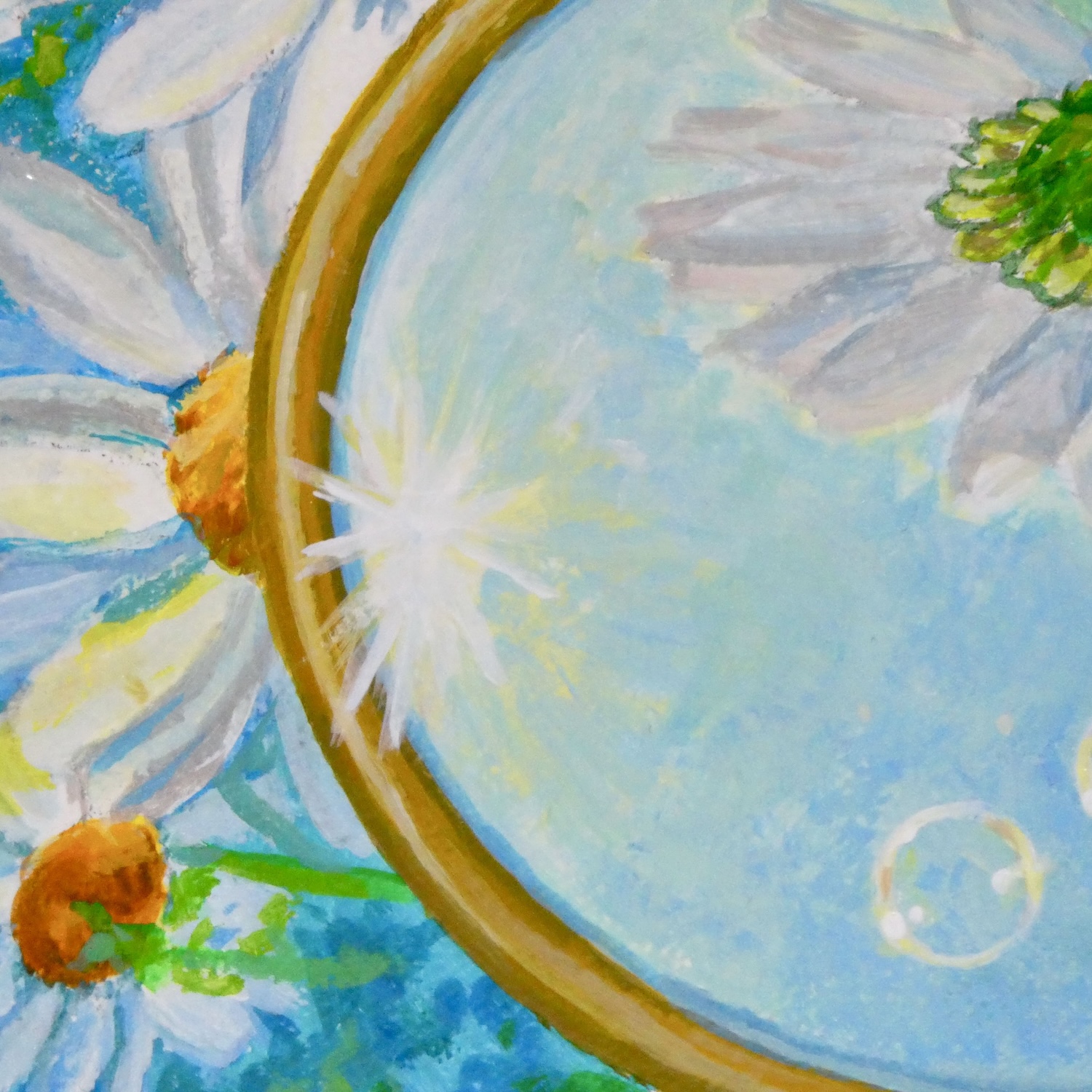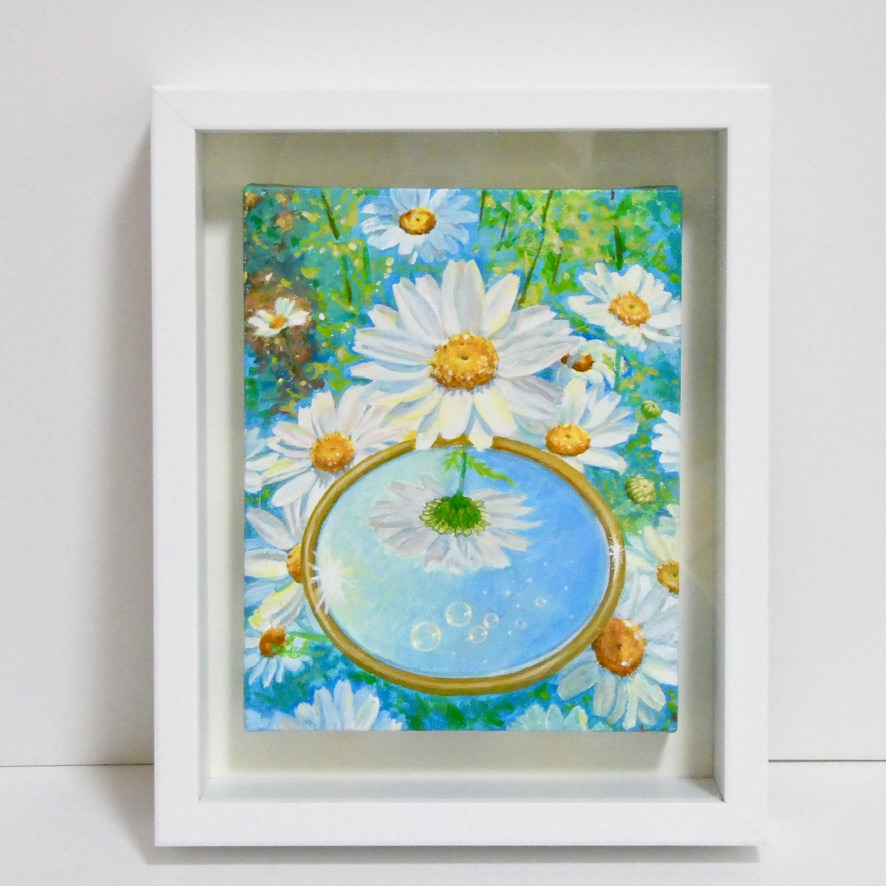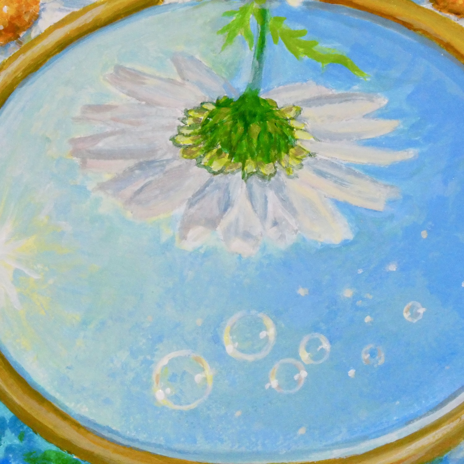 「花と鏡」シリーズ。花と花が見ている光の世界を鏡に映して描いた作品シリーズです。希望に向かって咲く花と、その花が見ているもの(空や光のある世界、イメージ)を鏡に映すことで、1つの絵の中に描いています。明るくポジティブな力を感じていただけたら嬉しいです。マーガレットの花とシャボン玉がモチーフになっています。マーガレットの花は、私が植物や風景をモチーフにし始めたきっかけの花で思い入れのある花です。自作の中でも定番で代表的モチーフになっています。