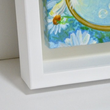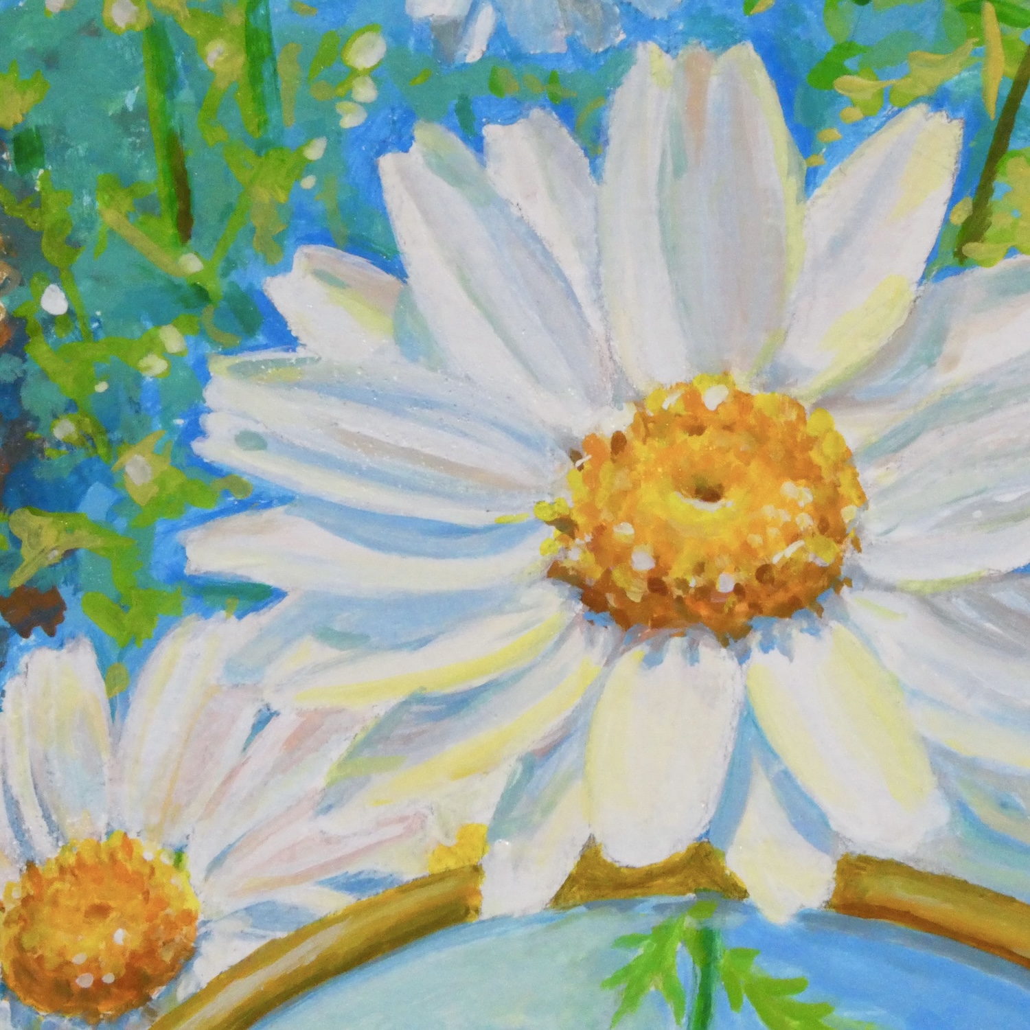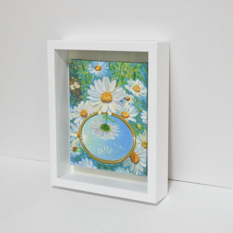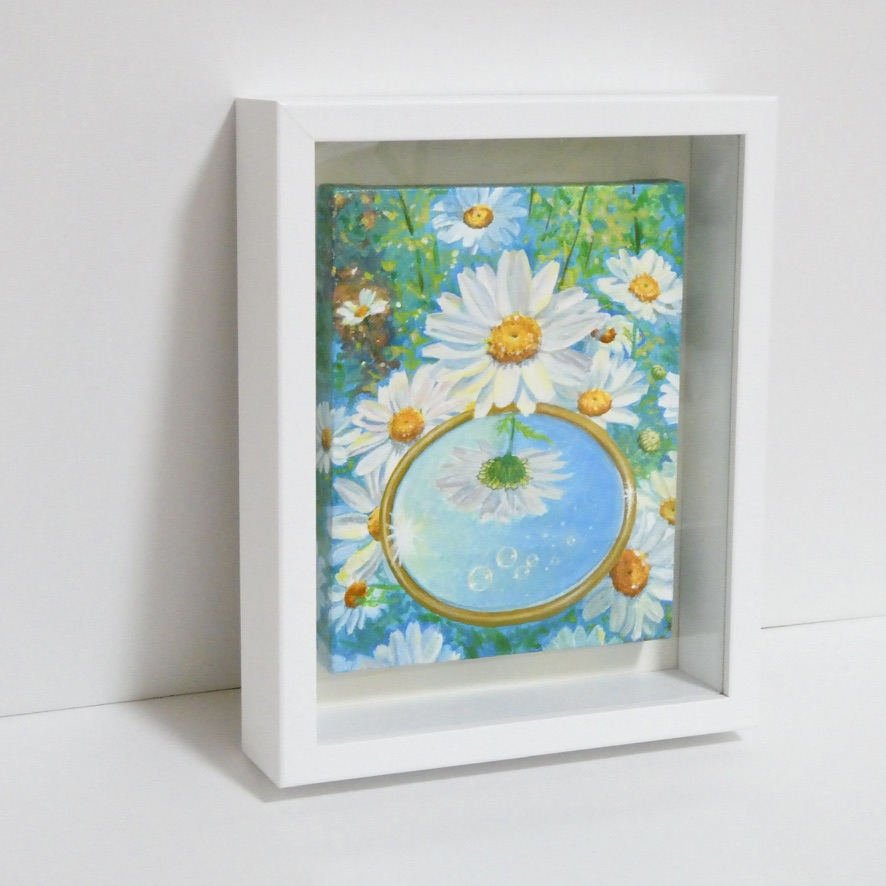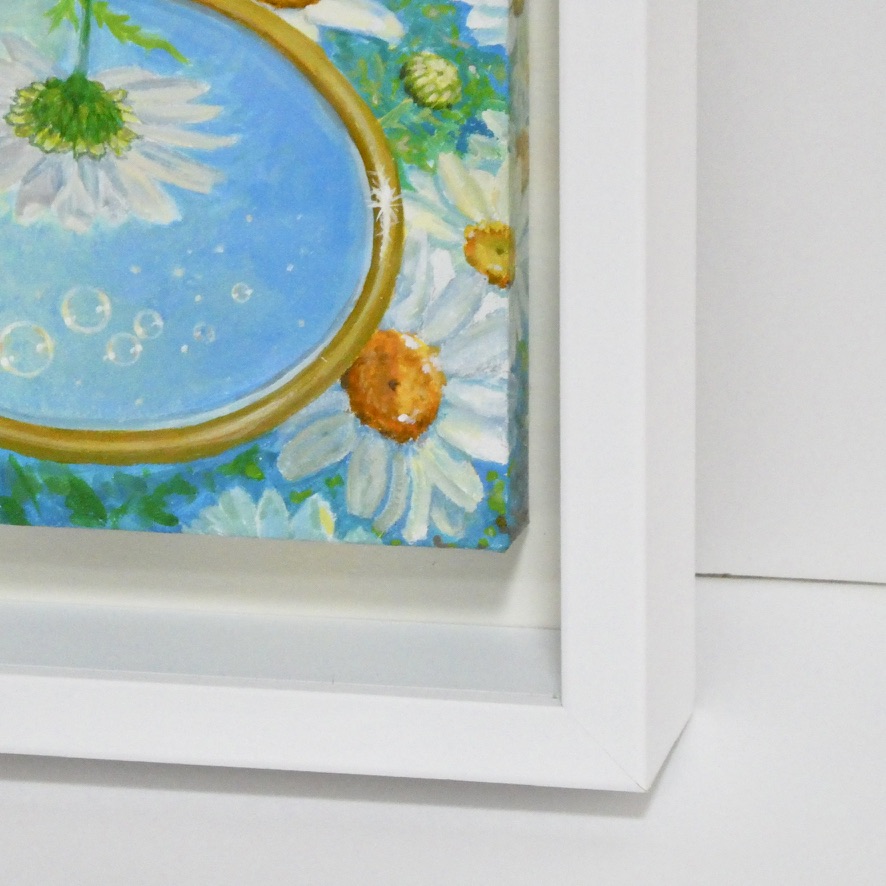 「花と鏡」シリーズ。花と花が見ている光の世界を鏡に映して描いた作品シリーズです。希望に向かって咲く花と、その花が見ているもの(空や光のある世界、イメージ)を鏡に映すことで、1つの絵の中に描いています。明るくポジティブな力を感じていただけたら嬉しいです。マーガレットの花とシャボン玉がモチーフになっています。マーガレットの花は、私が植物や風景をモチーフにし始めたきっかけの花で思い入れのある花です。自作の中でも定番で代表的モチーフになっています。