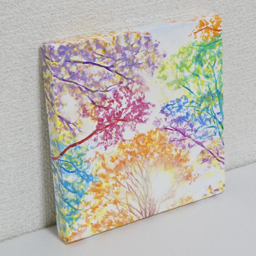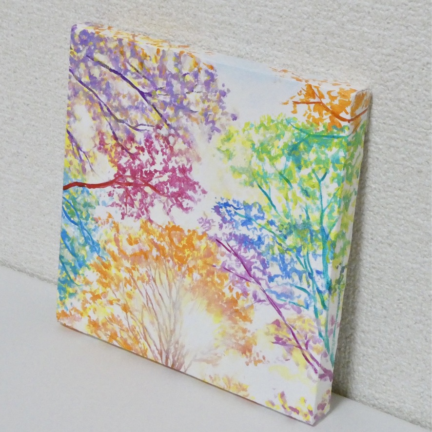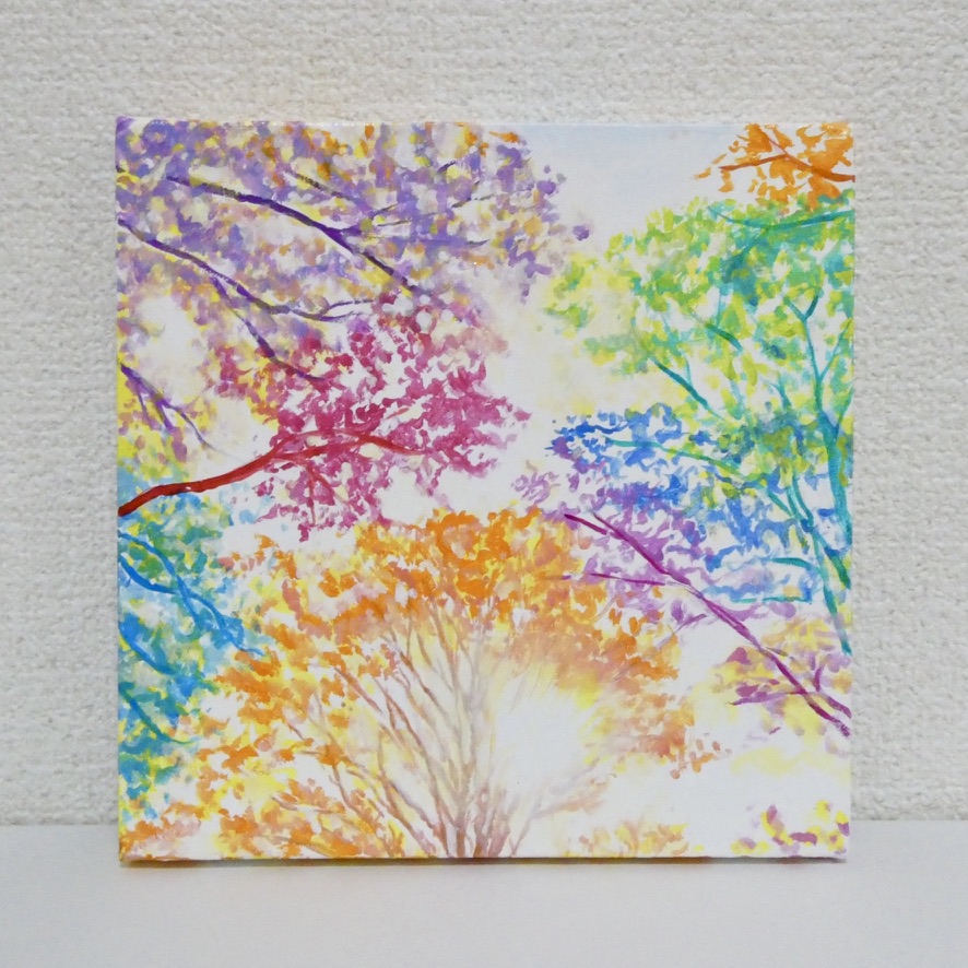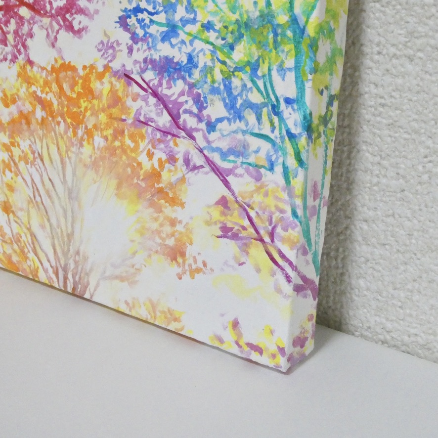 カラフルな森の風景画です。実際に見た景色をもとに想像を膨らませて描いています。自然の中を歩いた時の心健やかで明るくなれる体験を光と色彩で表現しました。鮮やかな色彩でも目に優しい配色にこだわっています。絵からポジティブな力を感じていただけたら嬉しいです。