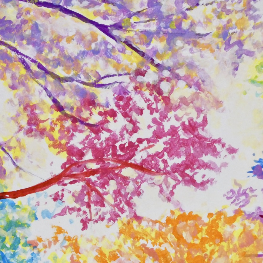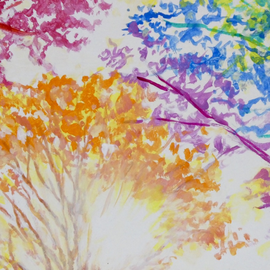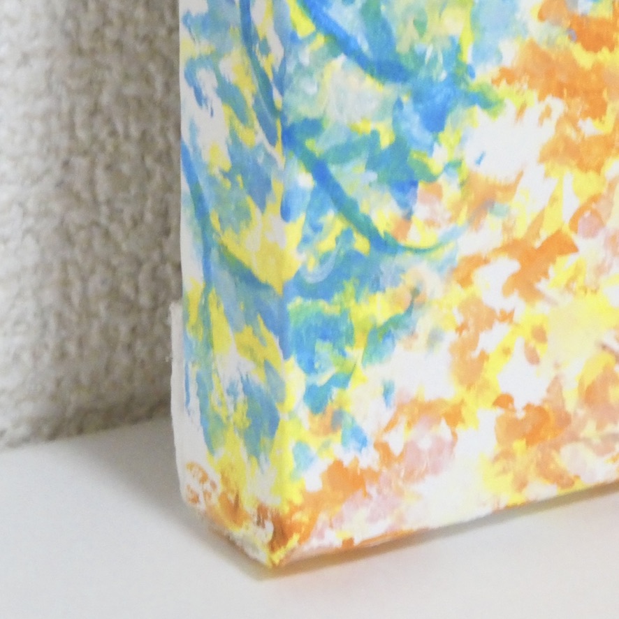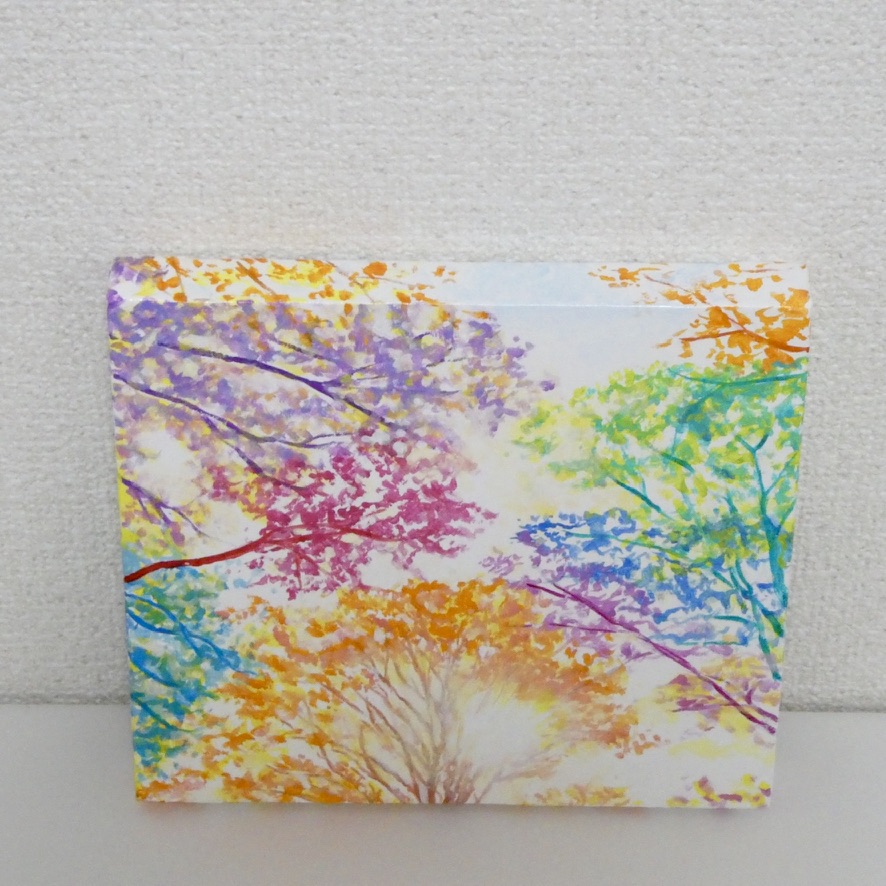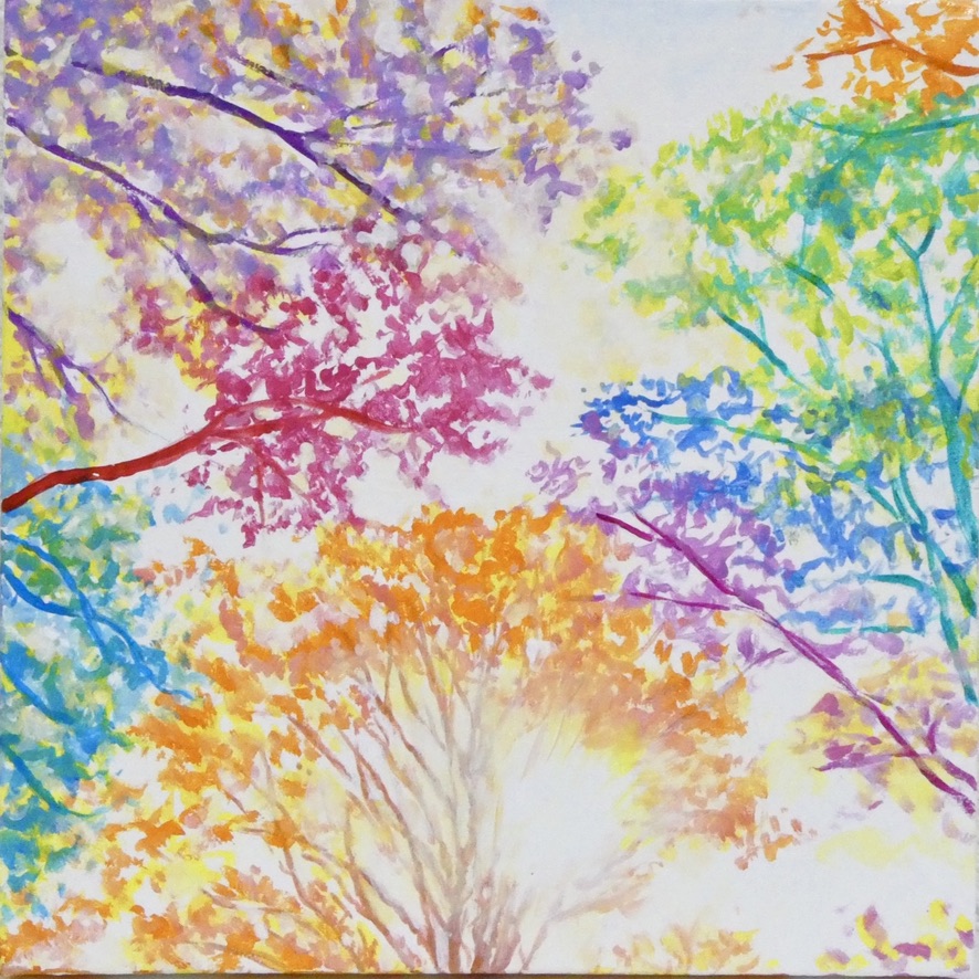 カラフルな森の風景画です。実際に見た景色をもとに想像を膨らませて描いています。自然の中を歩いた時の心健やかで明るくなれる体験を光と色彩で表現しました。鮮やかな色彩でも目に優しい配色にこだわっています。絵からポジティブな力を感じていただけたら嬉しいです。