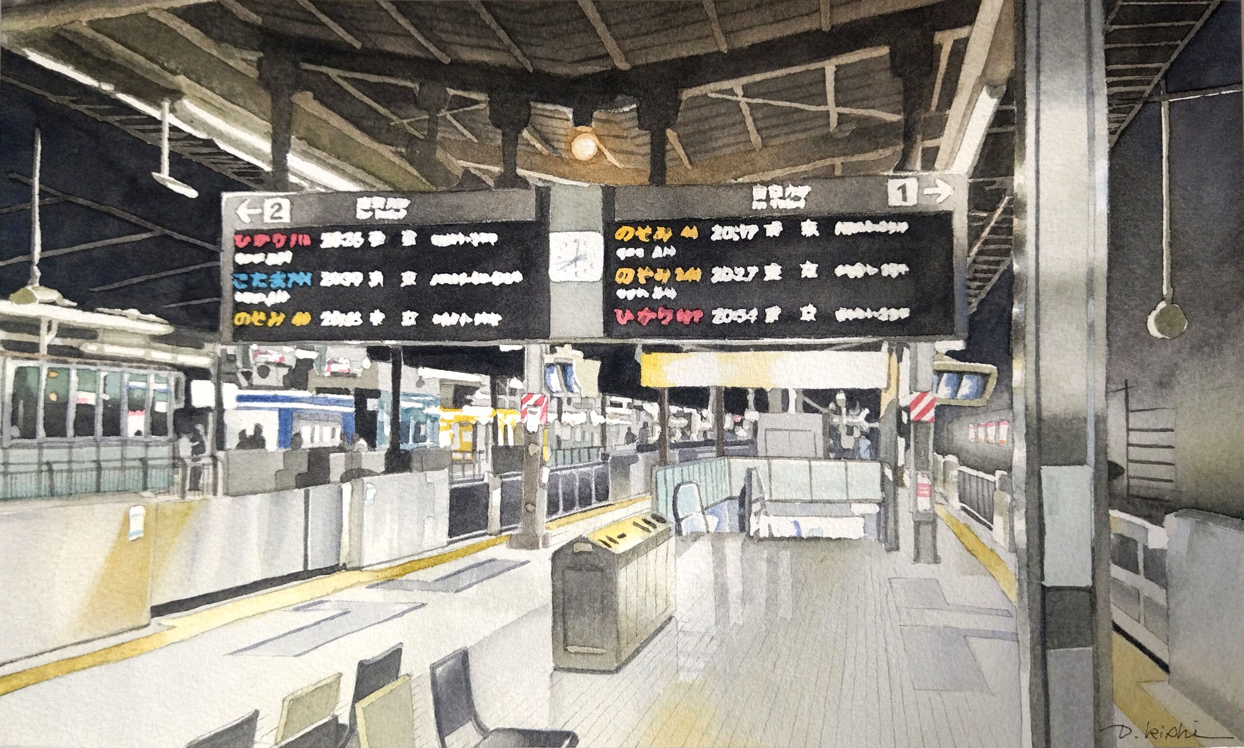夜の新横浜駅、新幹線上りのホームです。乗る電車を待つ人はおらず、迎えの人がほんの数人。しんとした空間の冷めた光が印象的でした。