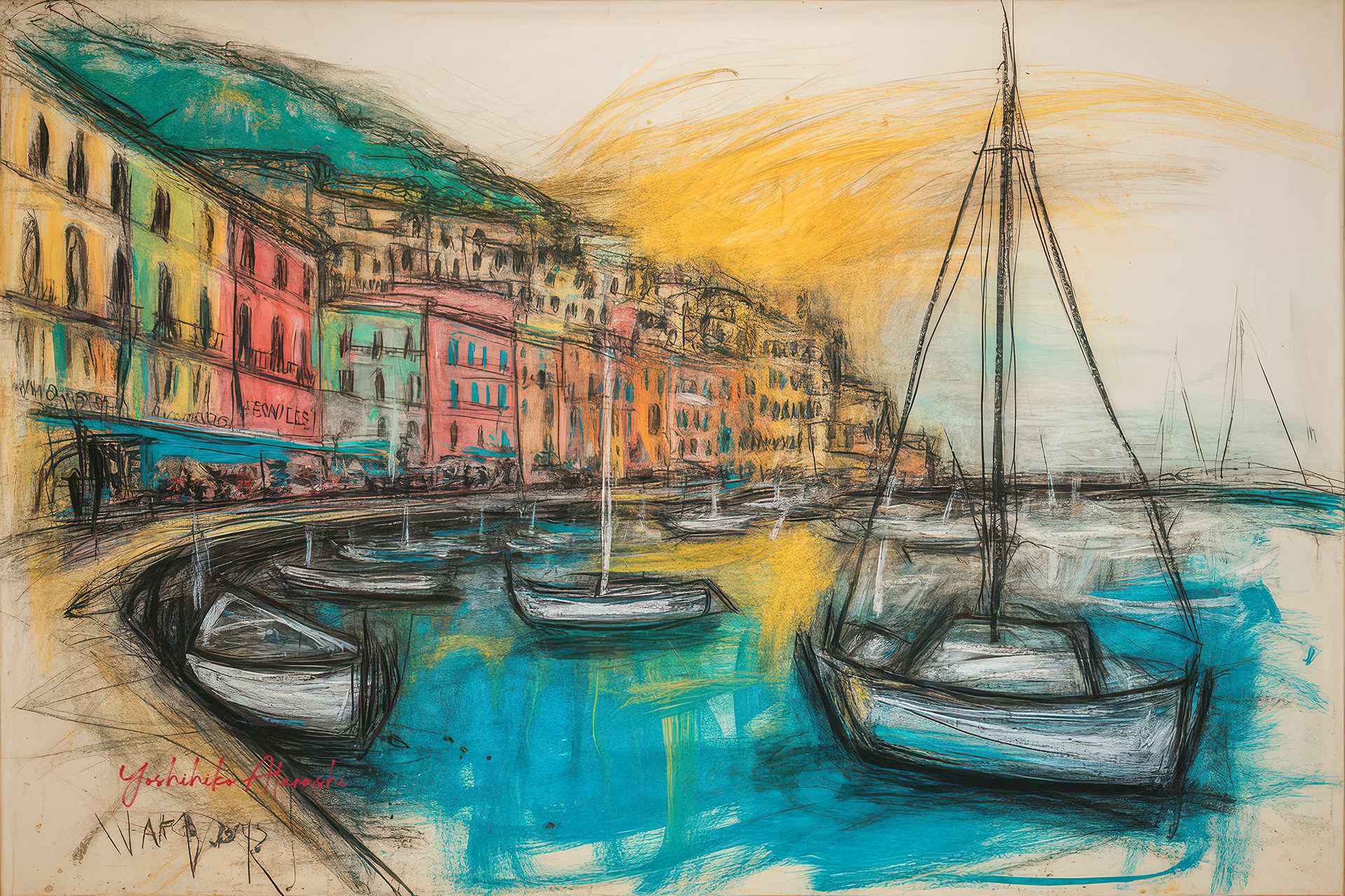 このシリーズ「エーゲ海の港町」は、旅先の記憶と憧れを色彩とリズムで表現した作品群です。スピード感ある筆致と柔らかなパステルトーン を組み合わせ、港町の光、風、匂いを抽象的に描きました。構図は遠近と反復を意識し、構成的には現実と夢の間を行き来するような情景を目 指しました。各作品には「懐かしさ」と「開放感」という対照的な感情を込めています。眺める人がそれぞれの旅の記憶と重ねられるよう願っ ています。