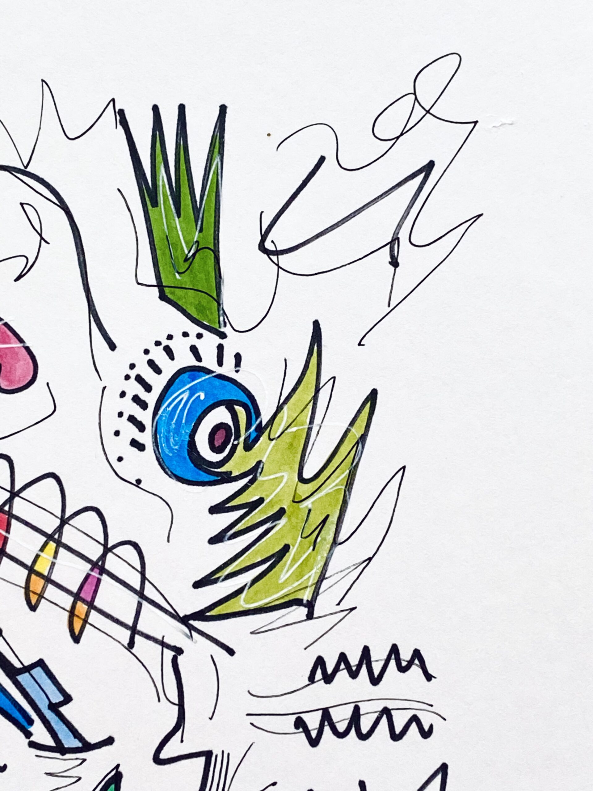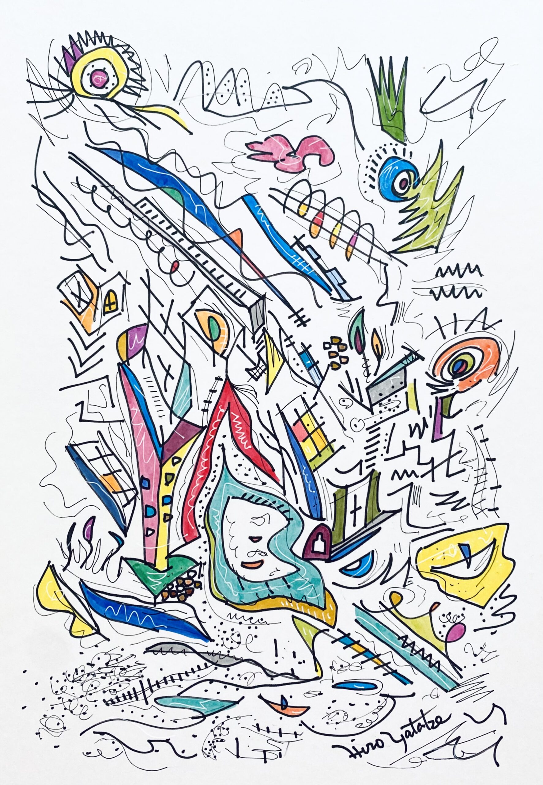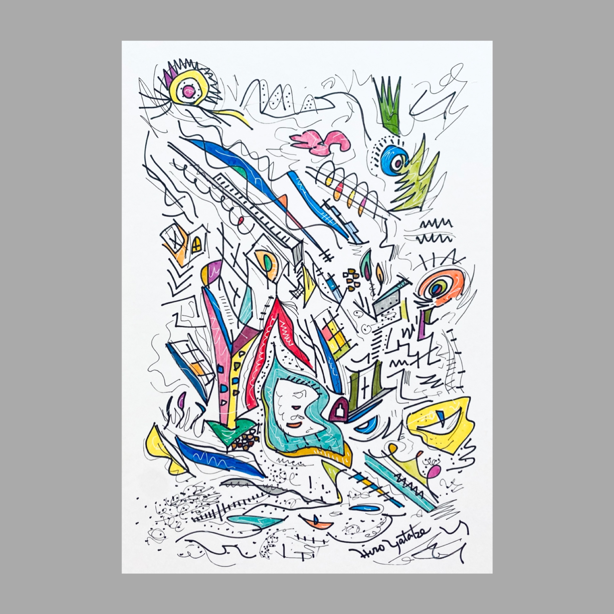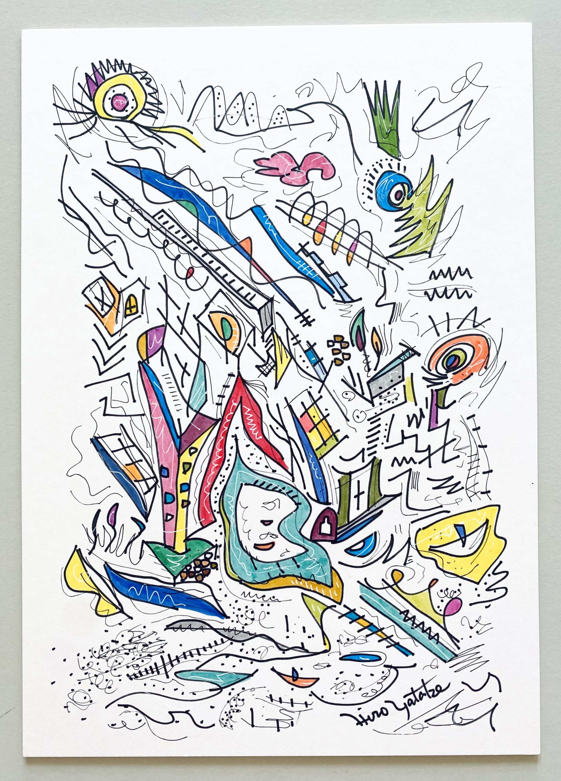 2008年 浮かんだイメージを付箋にボールペンでスケッチ。2012年になりそれをまとめたものを知人に見せたところサイズや画材をかえて絵画として発表することを勧められ、2013年、公募展にA4サイズのカードボードにペン・パステルで描いた作品を出品。その後アクリル絵具での創作をスタート。