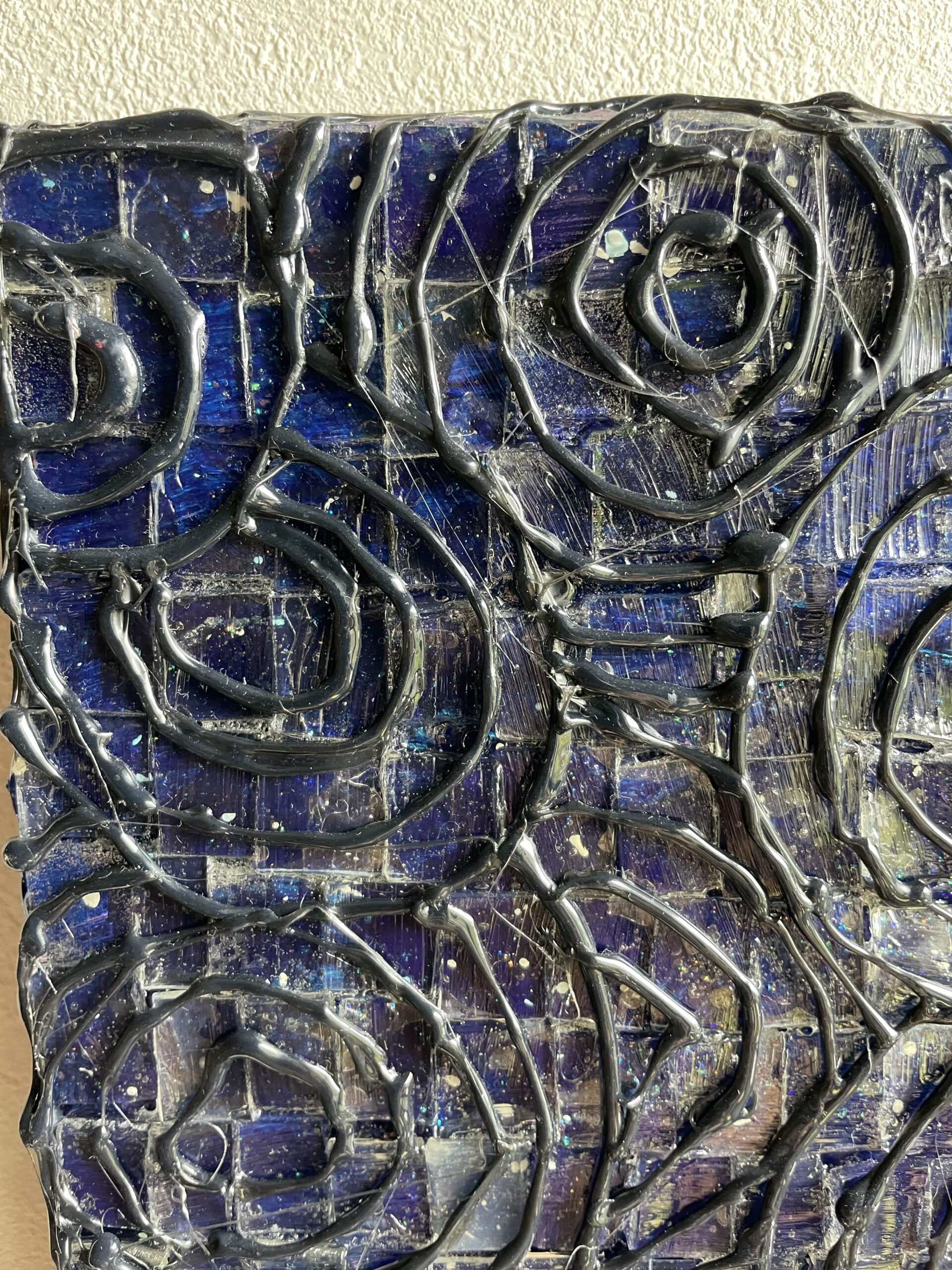 宇宙を描き、プラ板を貼り、グルーガンで装飾し、立体感を出しました。