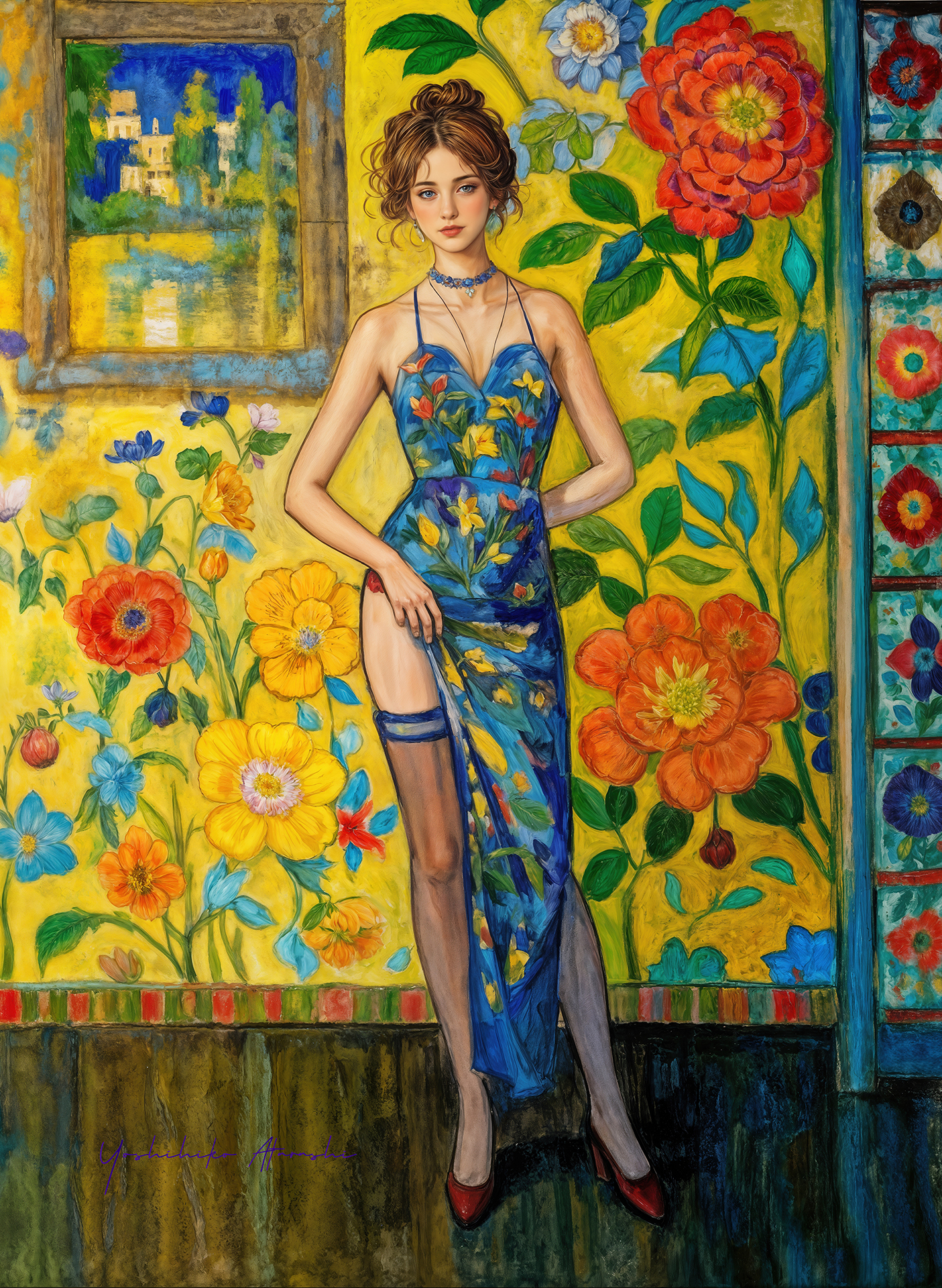 本作「Impressionist Dolls」シリーズは、印象派の色彩と現代女性の静謐な美を融合させた珠玉の作品群です。背景の鮮烈な花や抽象模様が人物の魅力を引き立て、観る者を物語の中へ誘いま す。ギャラリーでは壁一面をシリーズで構成し、空間全体をひとつの幻想世界として演出。華やかでありながら深みある美術体験をご提供しま す。コレクターのみならず、空間演出を求める方にも最適なコレクションです。