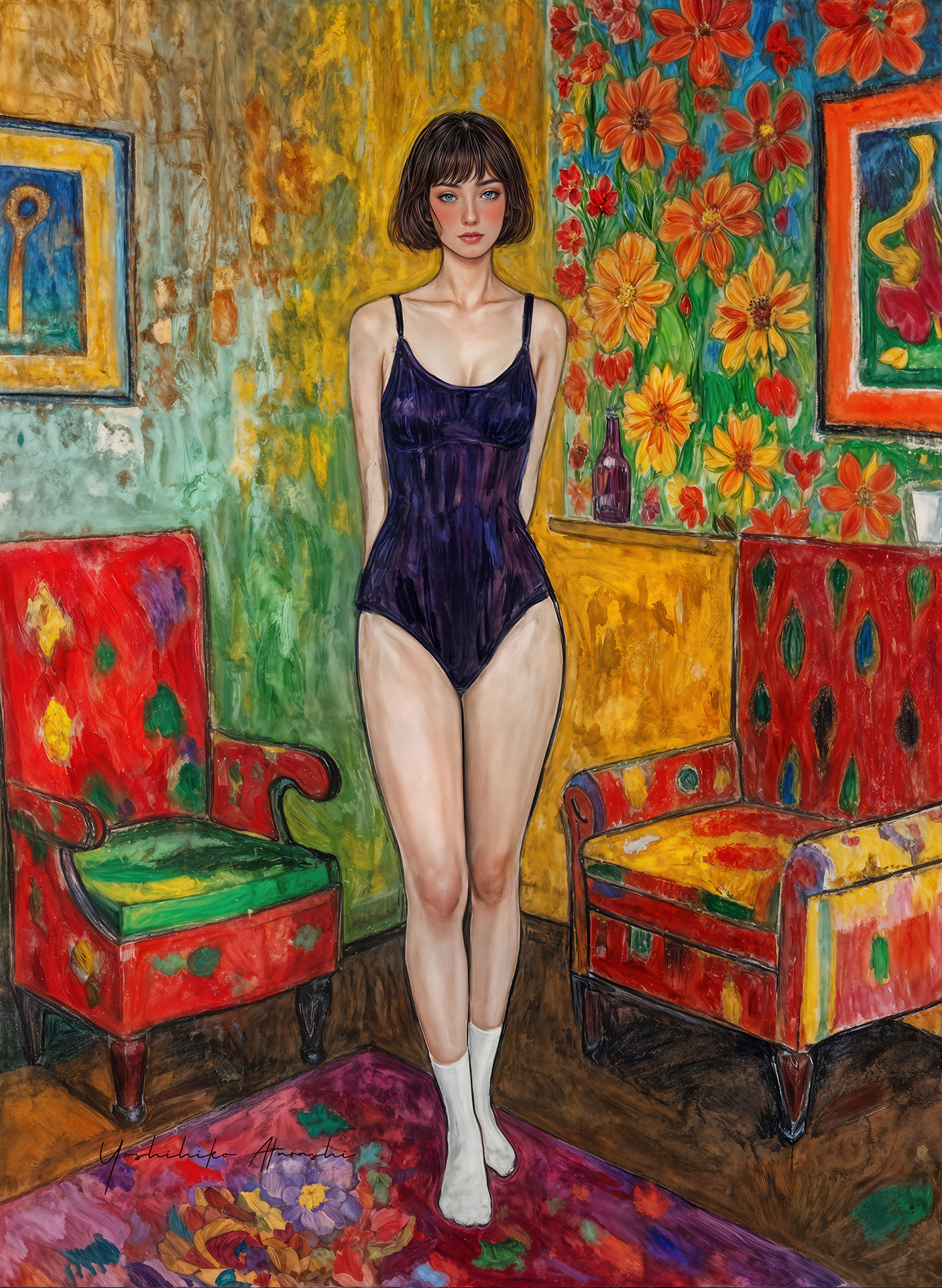 本作「Impressionist Dolls」シリーズは、印象派の色彩と現代女性の静謐な美を融合させた珠玉の作品群です。背景の鮮烈な花や抽象模様が人物の魅力を引き立て、観る者を物語の中へ誘いま す。ギャラリーでは壁一面をシリーズで構成し、空間全体をひとつの幻想世界として演出。華やかでありながら深みある美術体験をご提供しま す。コレクターのみならず、空間演出を求める方にも最適なコレクションです。