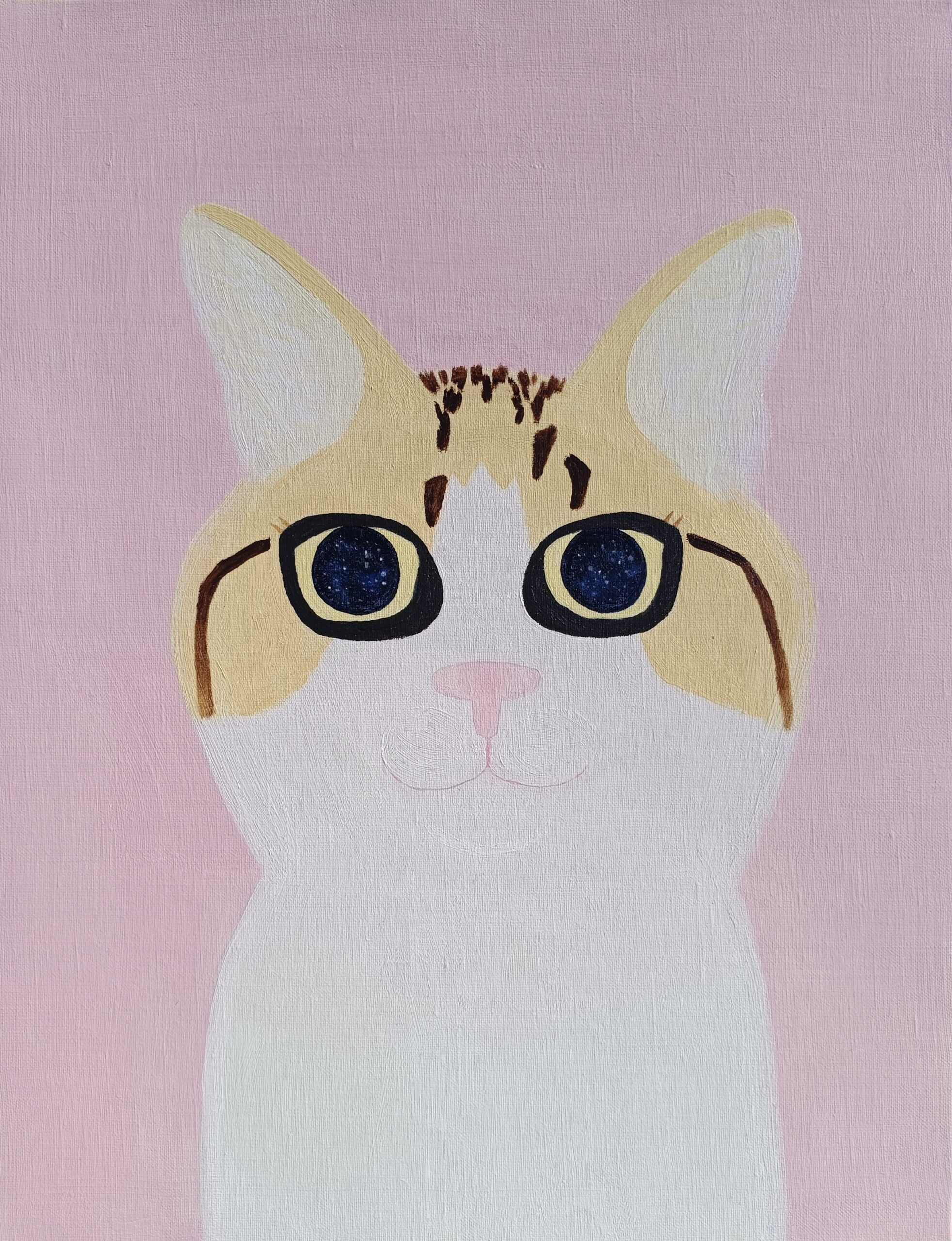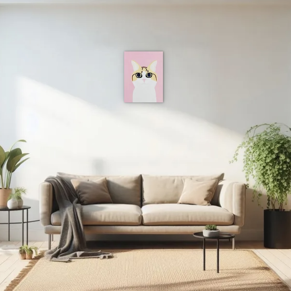 この絵は、遊び心のあるエネルギーと温かさを放っています。大胆なポップアートの影響と半抽象的なスタイルを用いて、明るく魂のこもった瞳を持つ猫の好奇心旺盛な無邪気さを表現しました。柔らかなピンクの背景は、喜びと安らぎに満ちた雰囲気を醸し出し、どんな空間にも魅力と軽快さを添えてくれます。この作品は、シンプルな幸せと、日々の瞬間に感じる魔法を、あなたに届けてくれるでしょう。