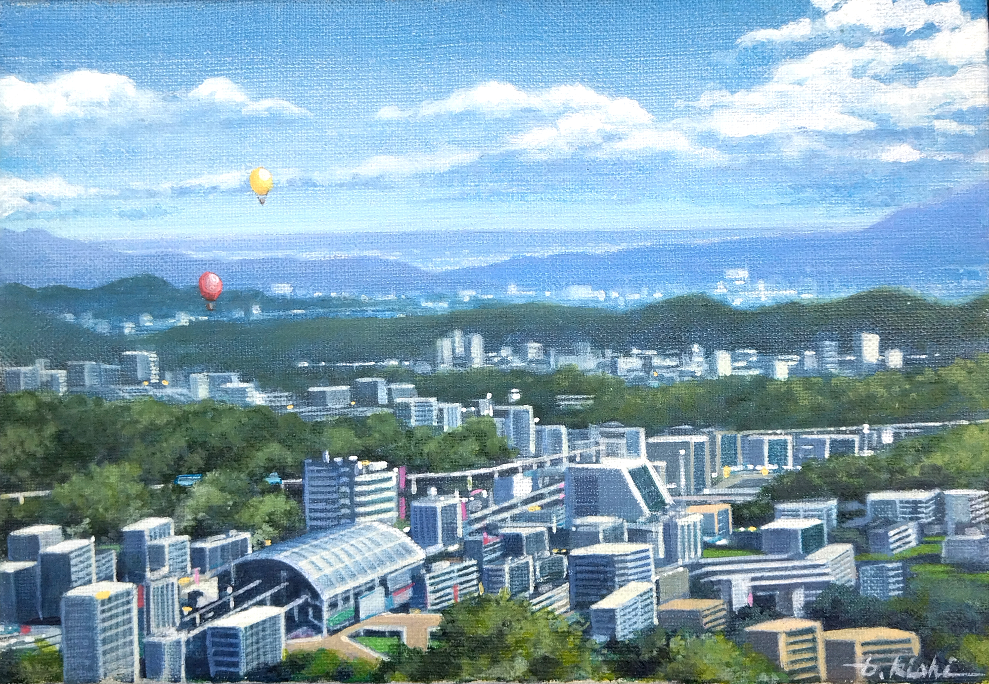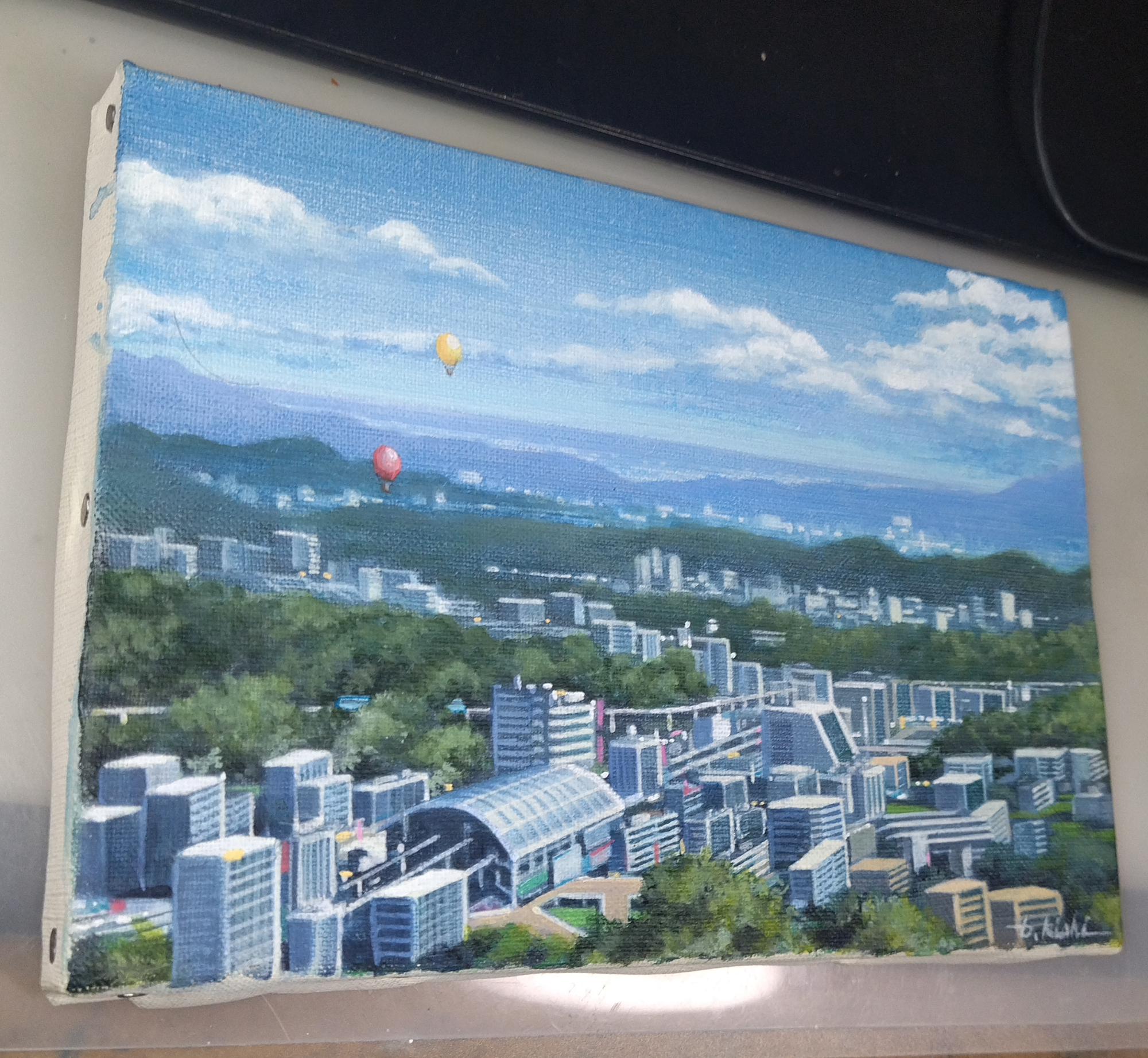 初めて(紙ではなく)貼りキャンバスに描いた近未来都市の風景画です。