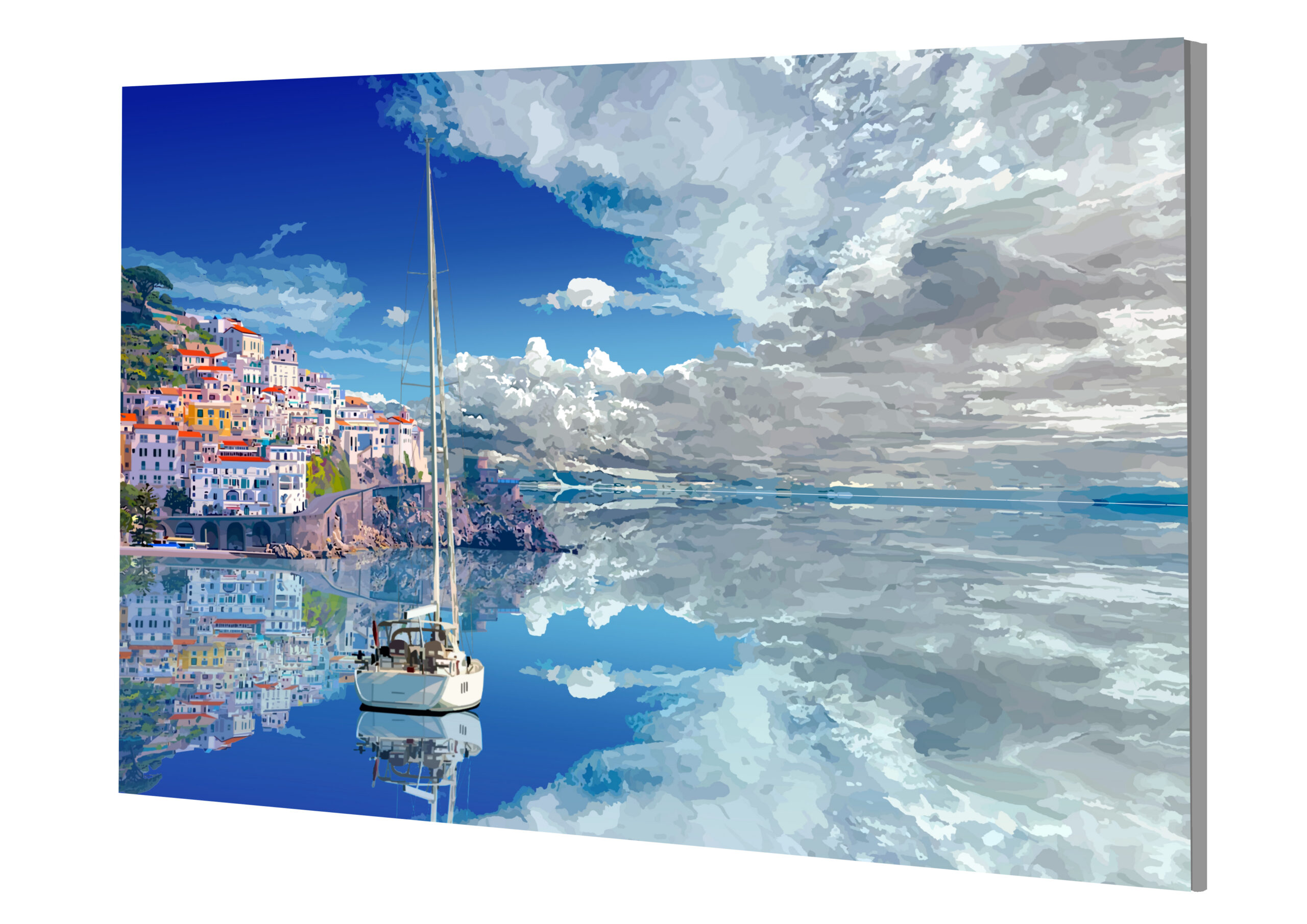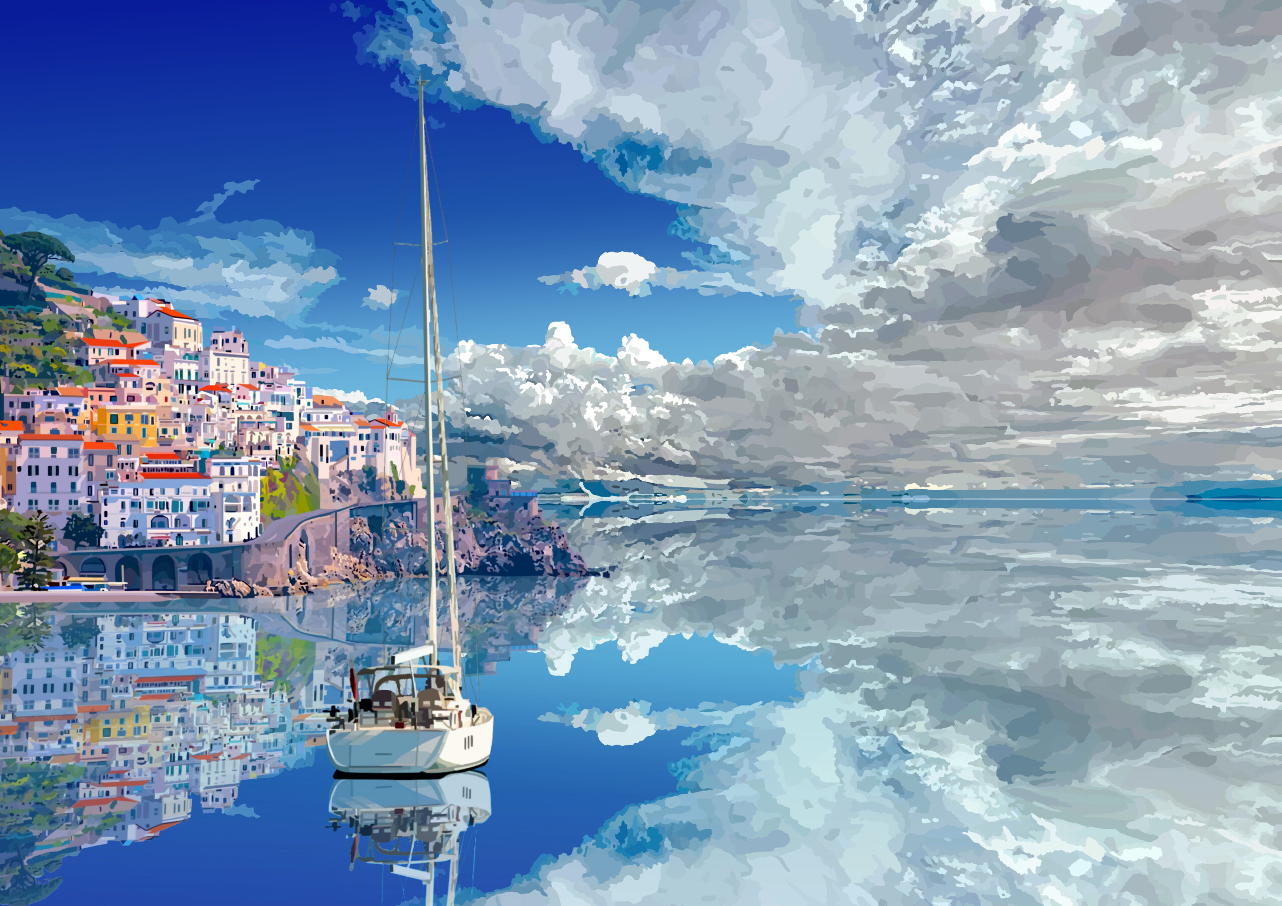 凪と言う波ひとつたたない超静寂の海に漂うヨットと風光明媚なアマルフィの街並みを描いた非現実ともとれる世界