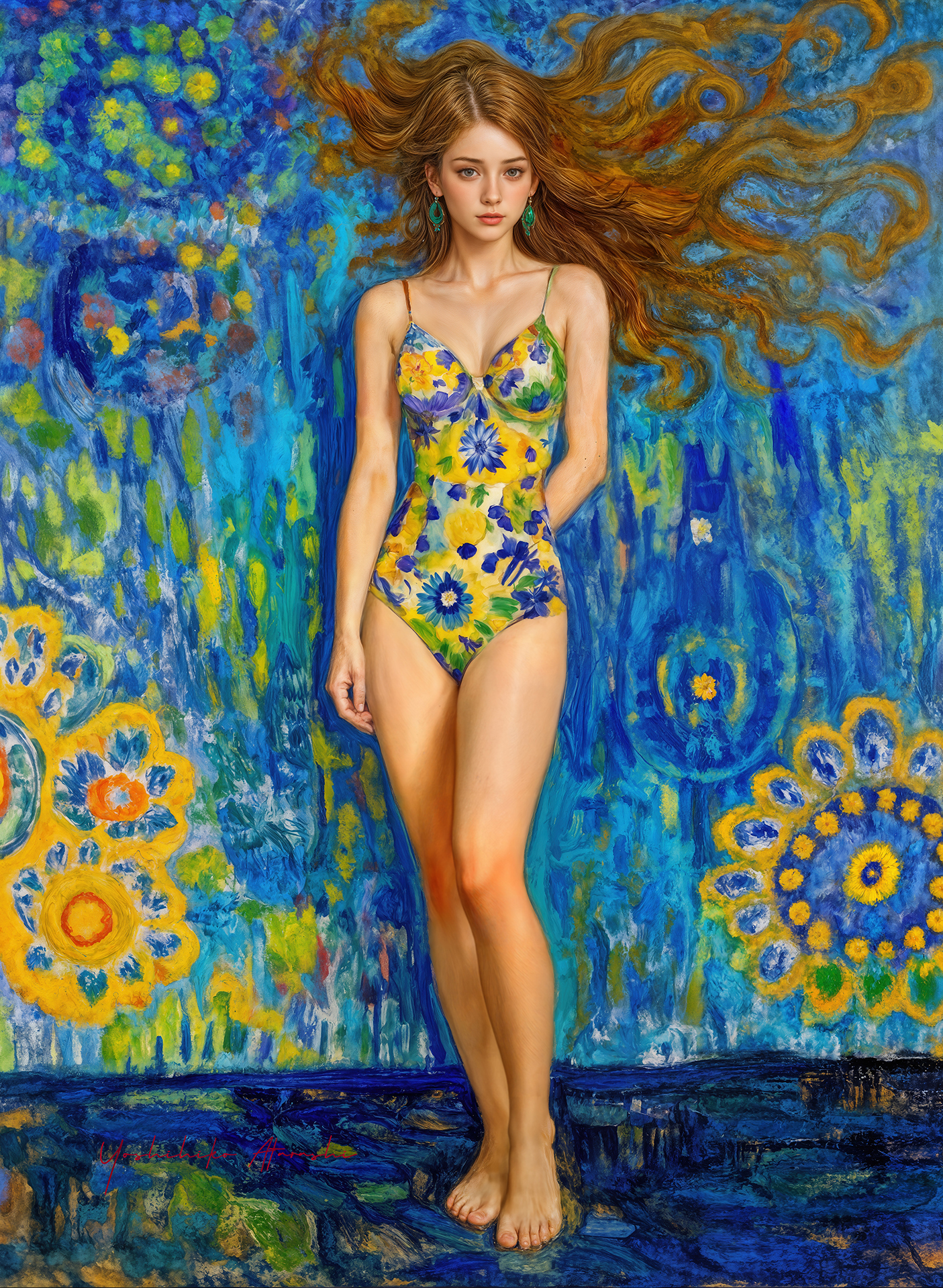 本作「Impressionist Dolls」シリーズは、印象派の色彩と現代女性の静謐な美を融合させた珠玉の作品群です。背景の鮮烈な花や抽象模様が人物の魅力を引き立て、観る者を物語の中へ誘いま す。ギャラリーでは壁一面をシリーズで構成し、空間全体をひとつの幻想世界として演出。華やかでありながら深みある美術体験をご提供しま す。コレクターのみならず、空間演出を求める方にも最適なコレクションです。