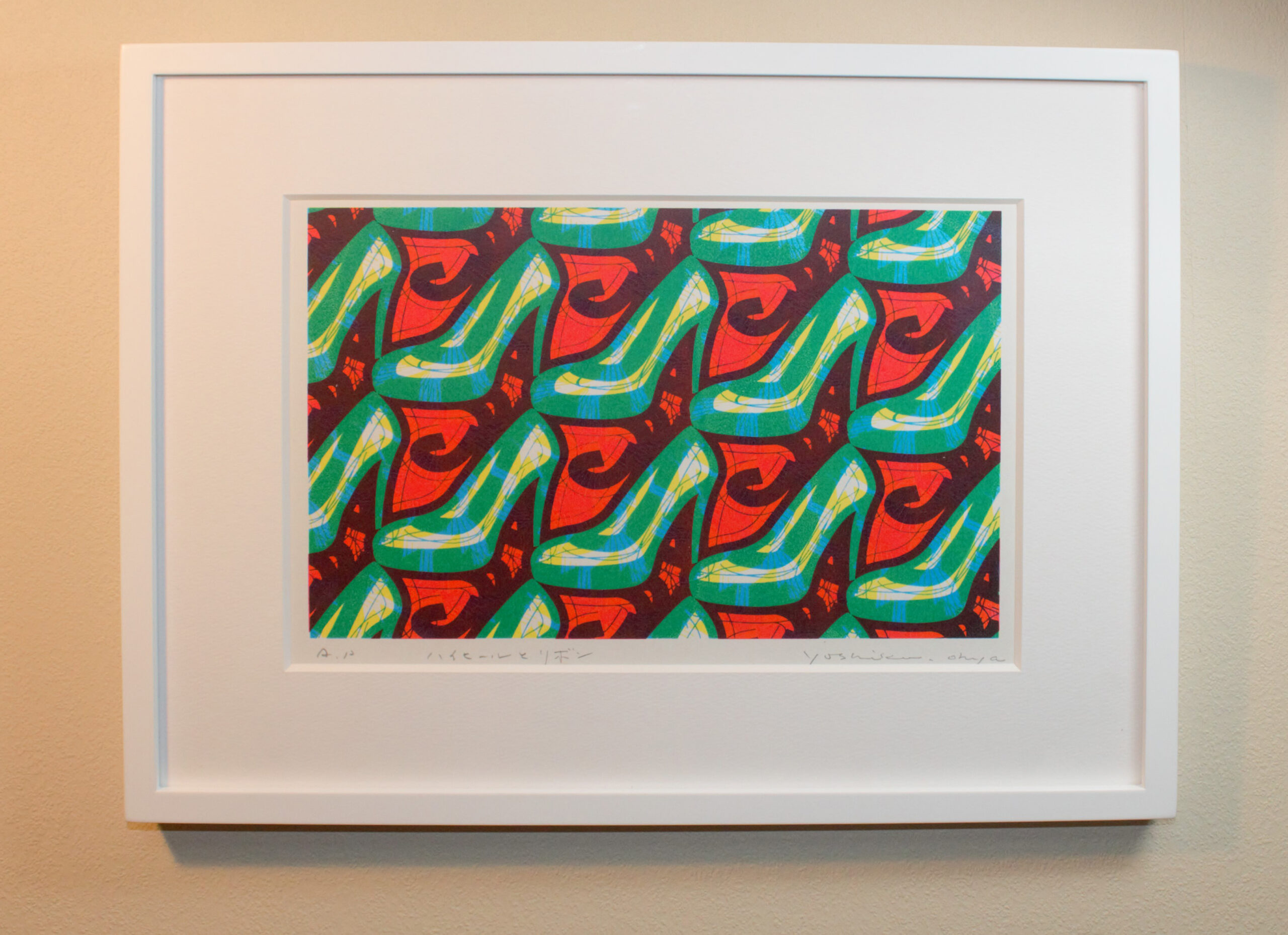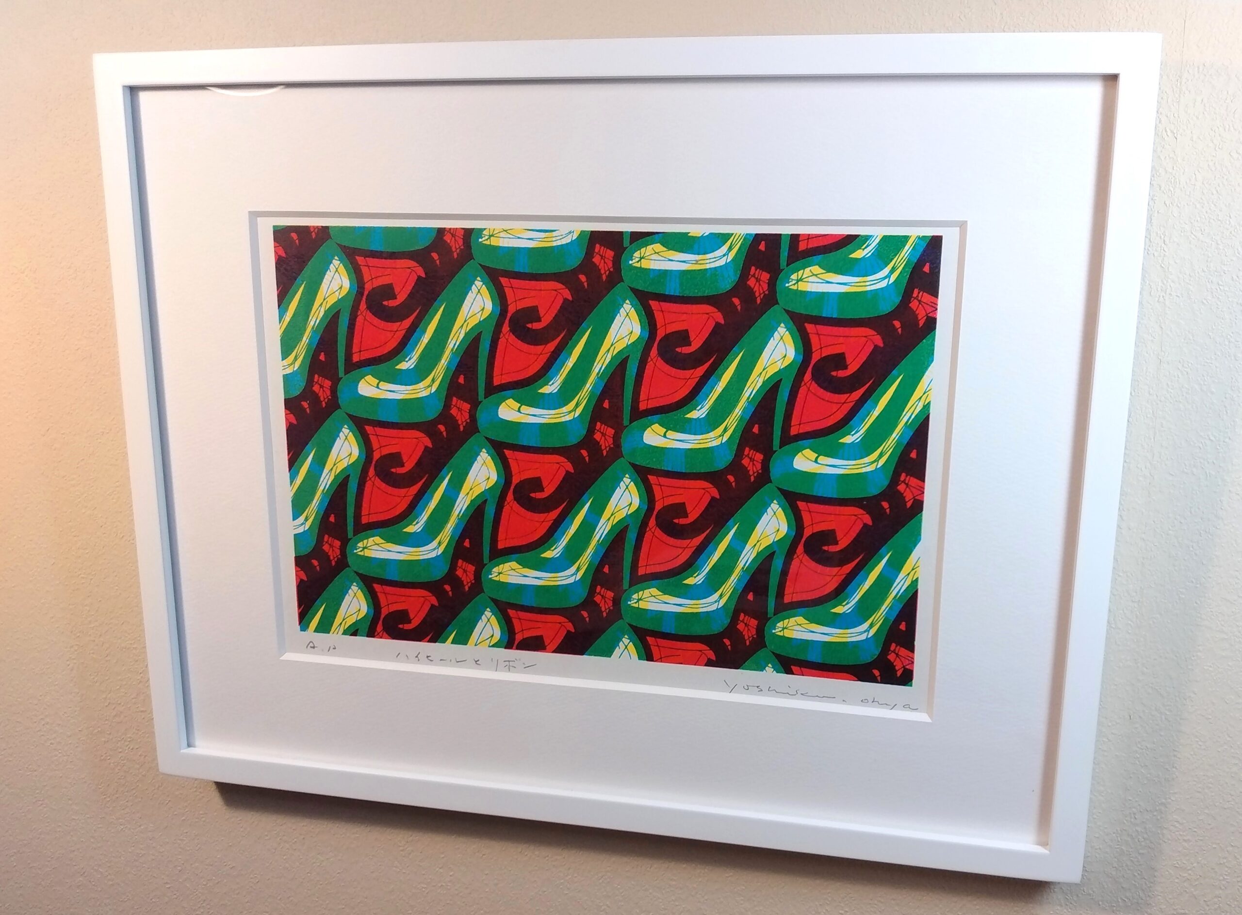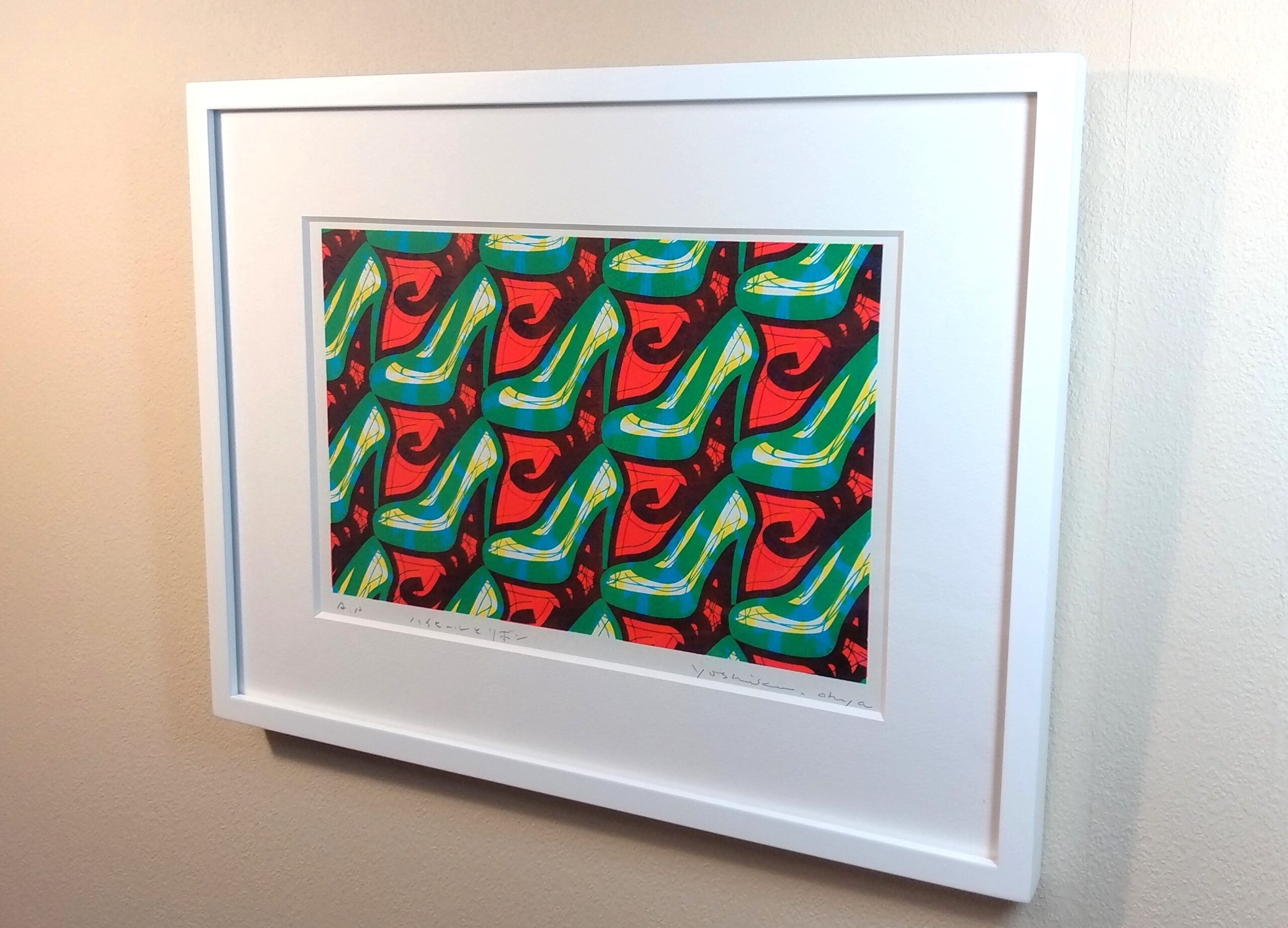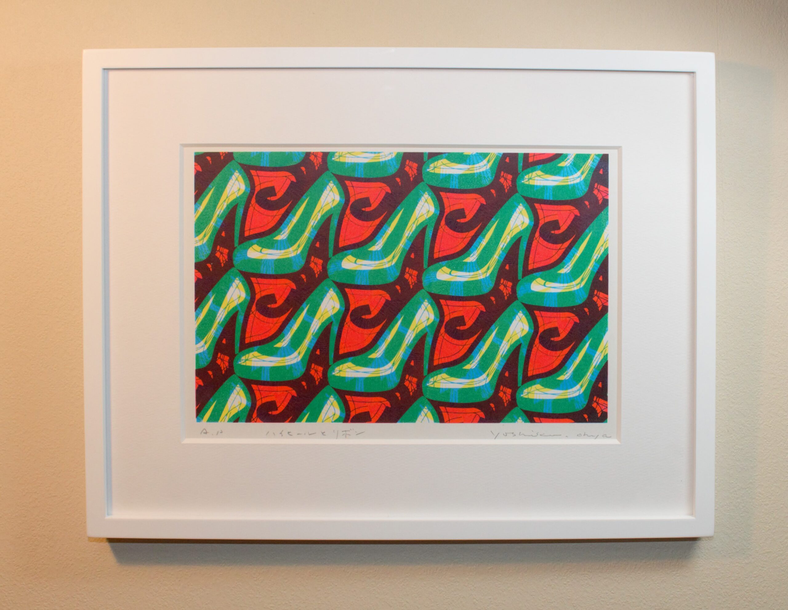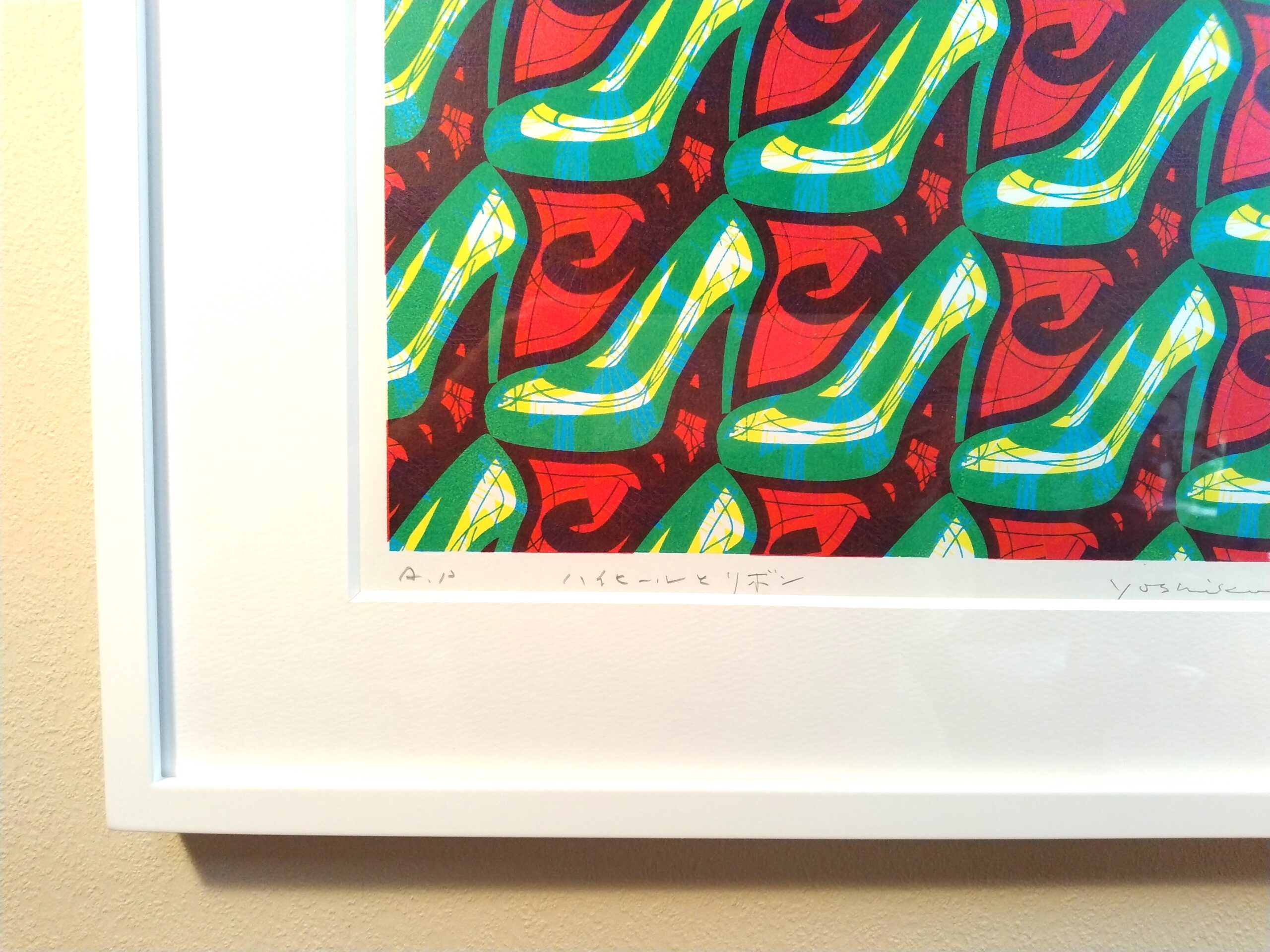 ハイヒールとリボンの2つのパターンで作品を構成しました。この2つのパターンで作品を多数制作しています。シルクスクリーンで印刷しています。版は3版使いました。エディションは3になります。シルクスクリーンのダイカラー(透明絵具)を使っております。色の重なりを楽しんでいただけたらと思います。