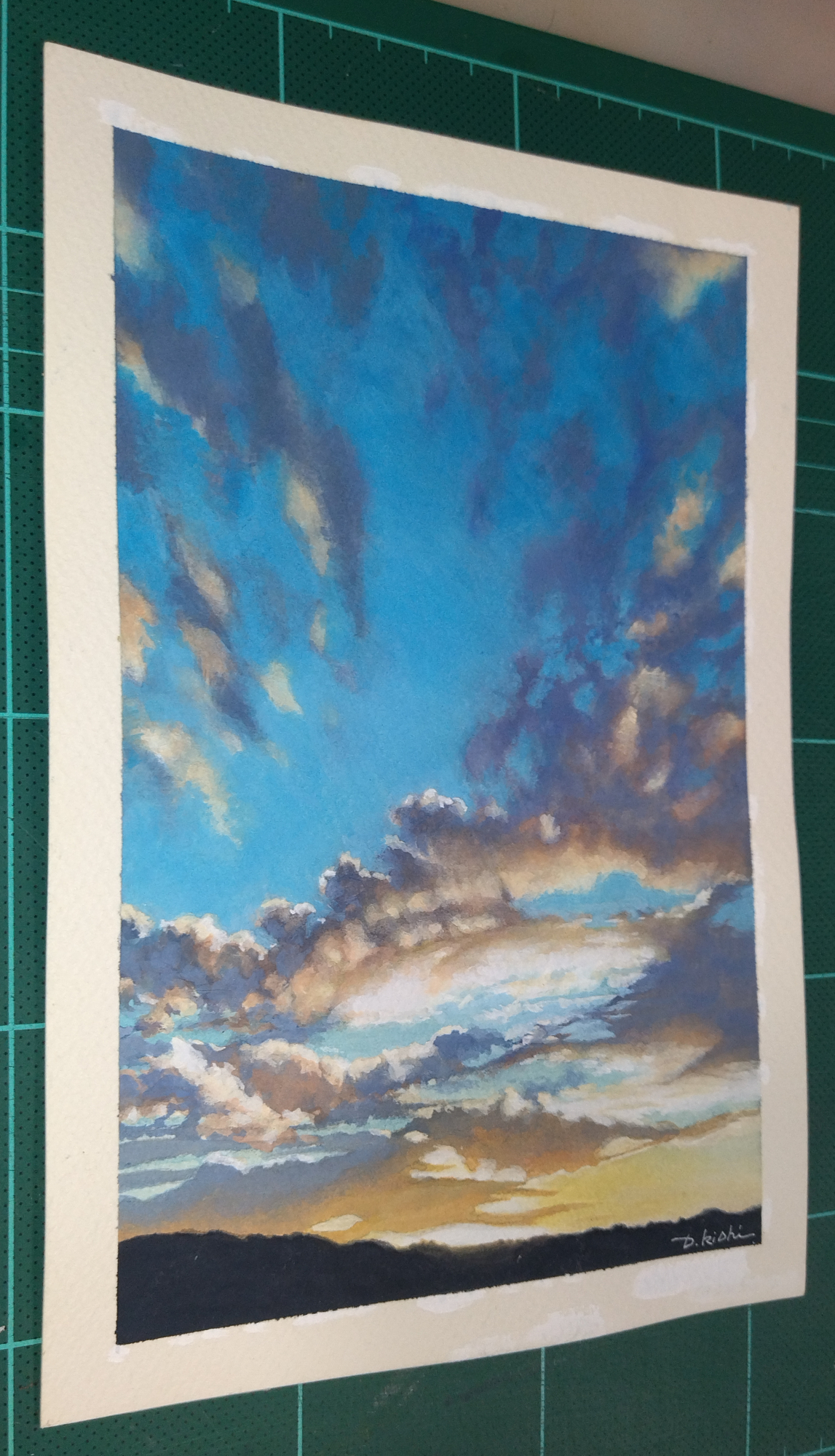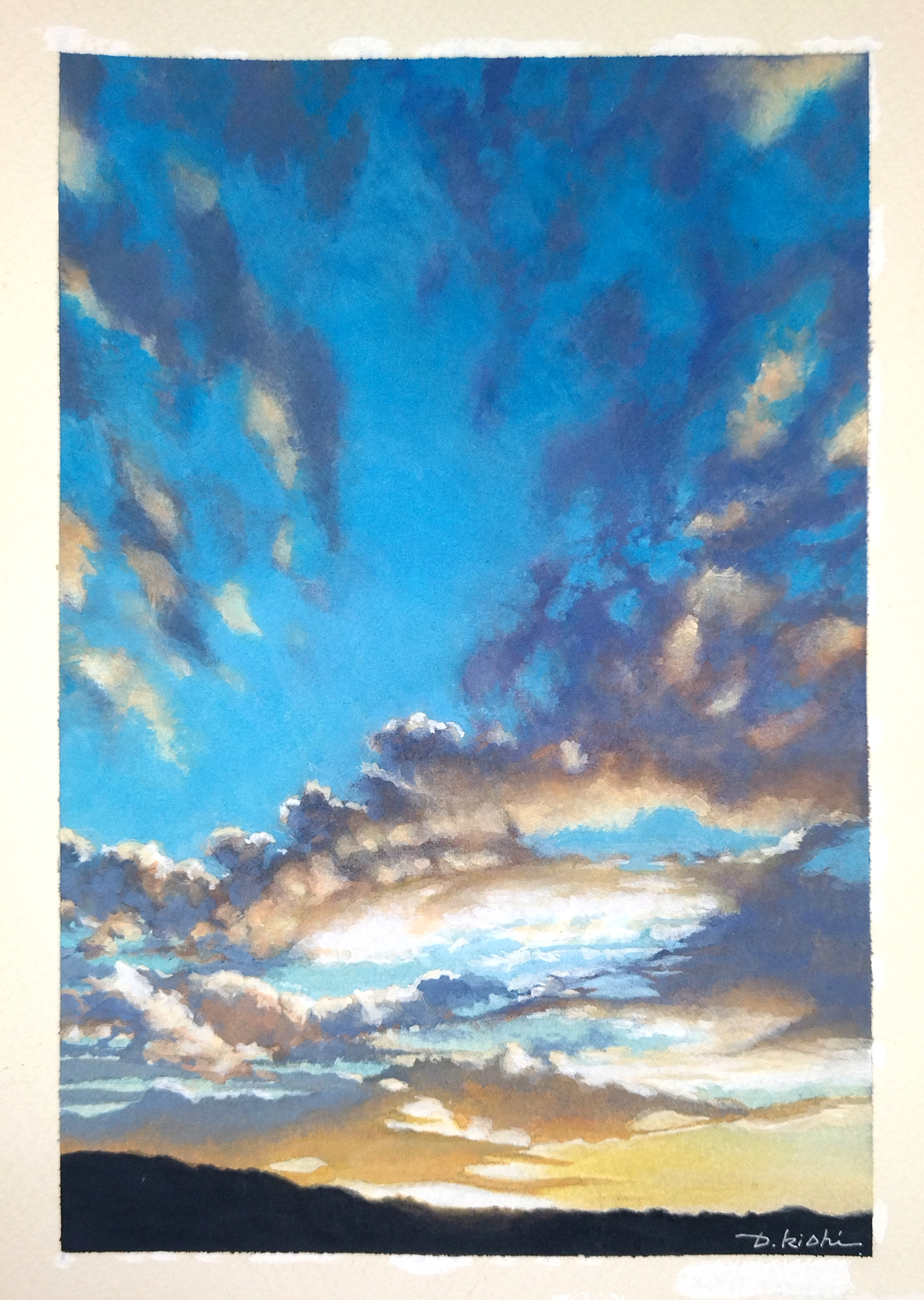 8月下旬のある日、幾重にも重なり合った雲の層が美しい朝焼けの空でした。ホワイトアイビス水彩紙にアクリルガッシュで描いています。SMサイズの各辺1cm内側が絵のサイズです。