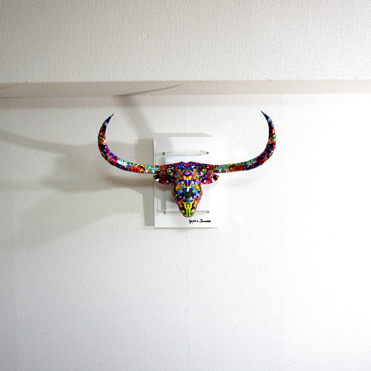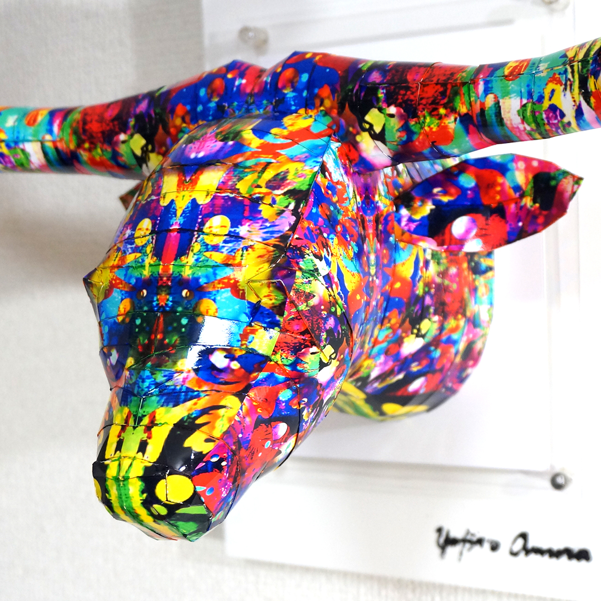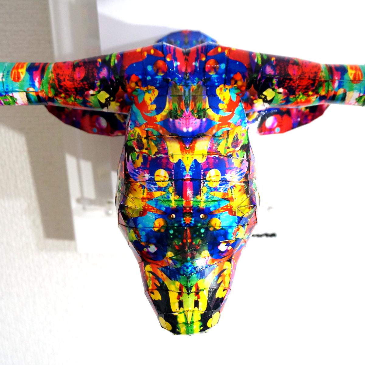 バッファローの頭部のコラージュ画像を作成しペーパークラフト技術を用いて立体的に表現した作品です。