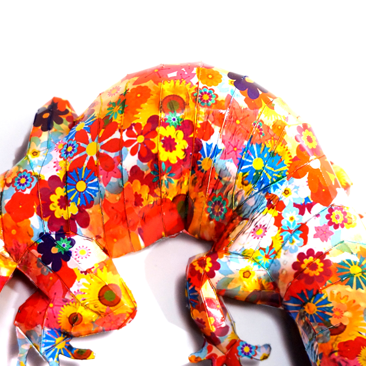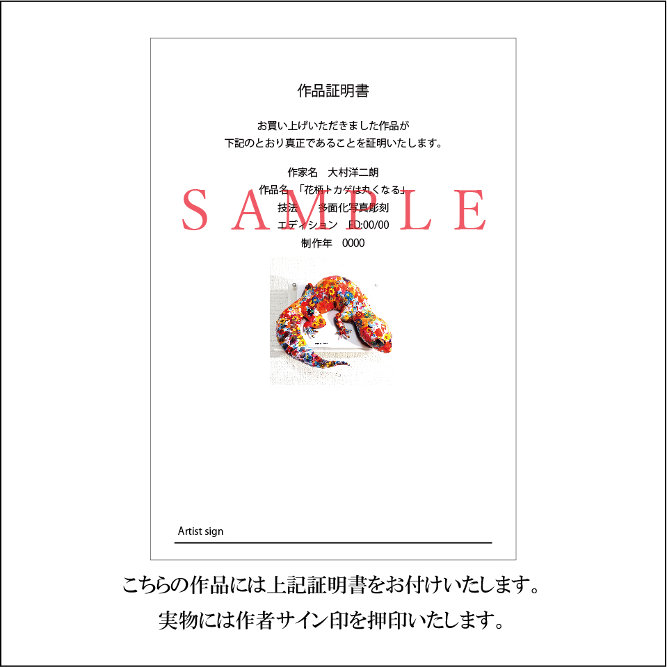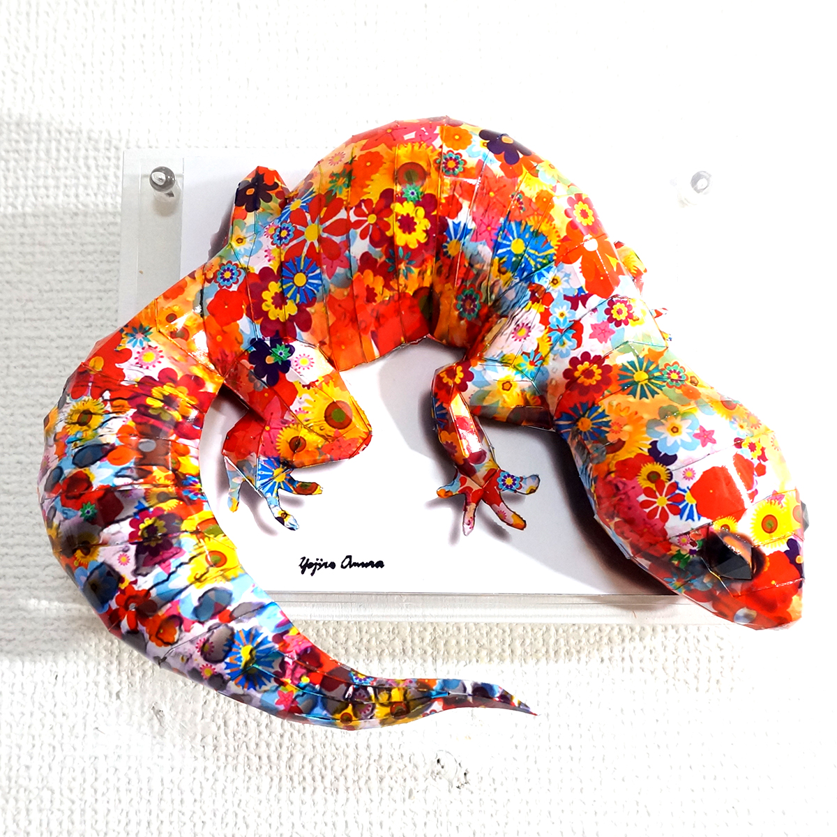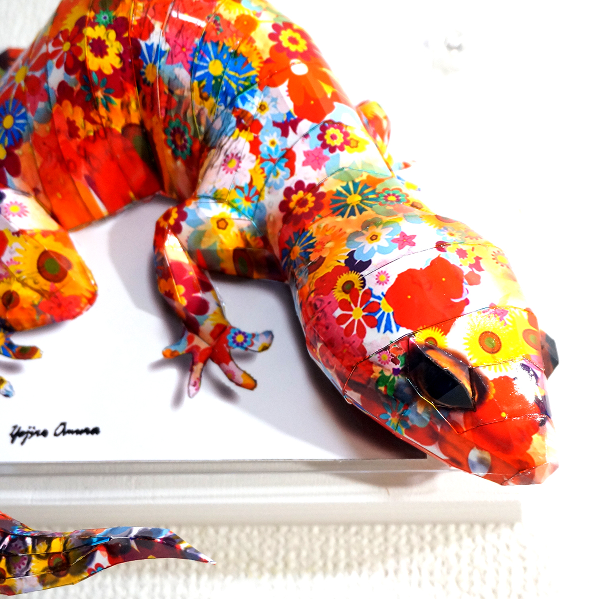 表面上はカラフルな花柄模様をトカゲ本来の表情と重ね合わせたデザインです。表面上は光沢紙の艶のある質感となっております。