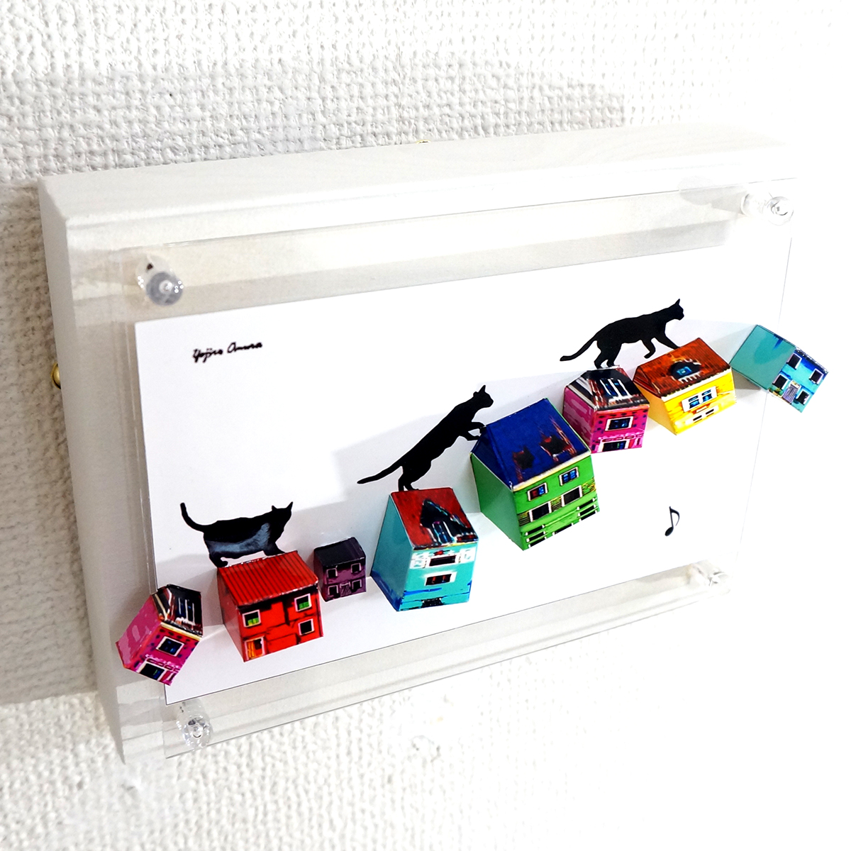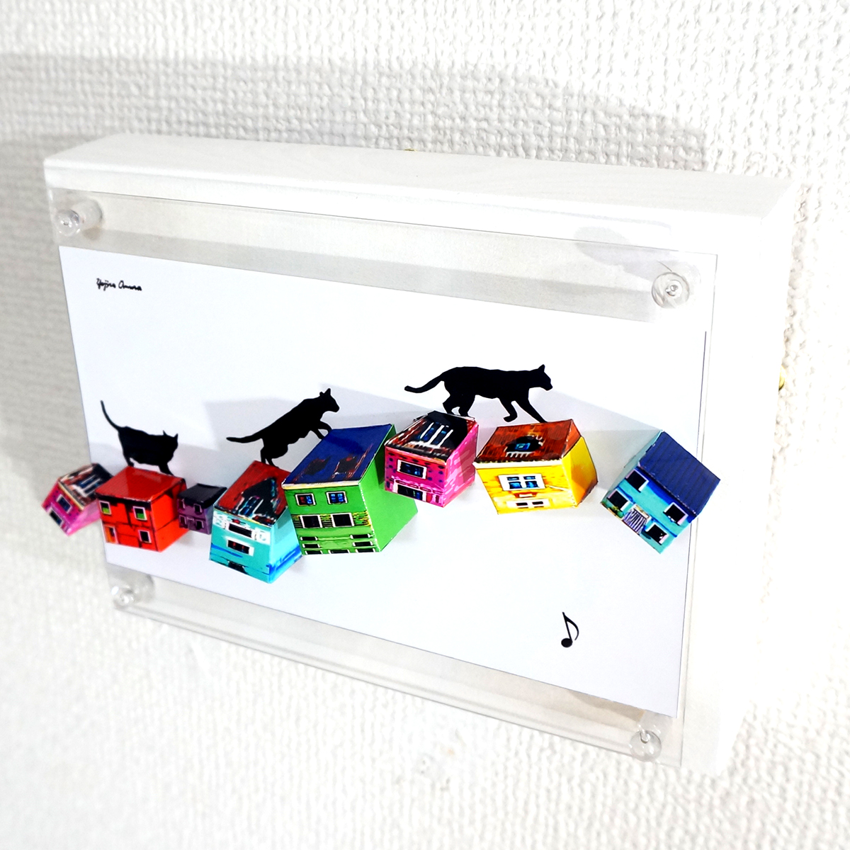 両サイドの家の端をパネルからはみ出させることで、猫たちがそのままパネルの外まで歩いてきそうな予感を感じさせるデザインになっております。
