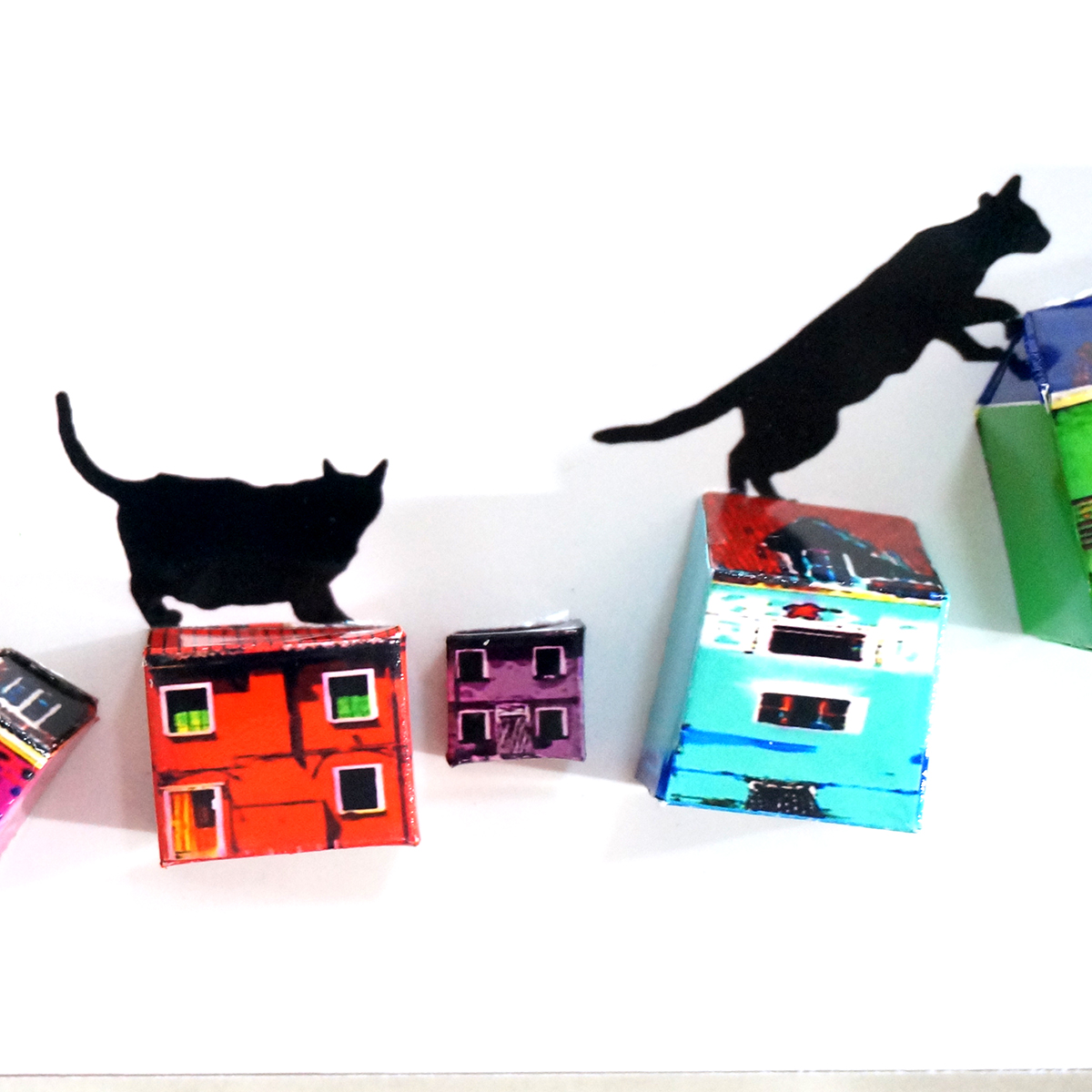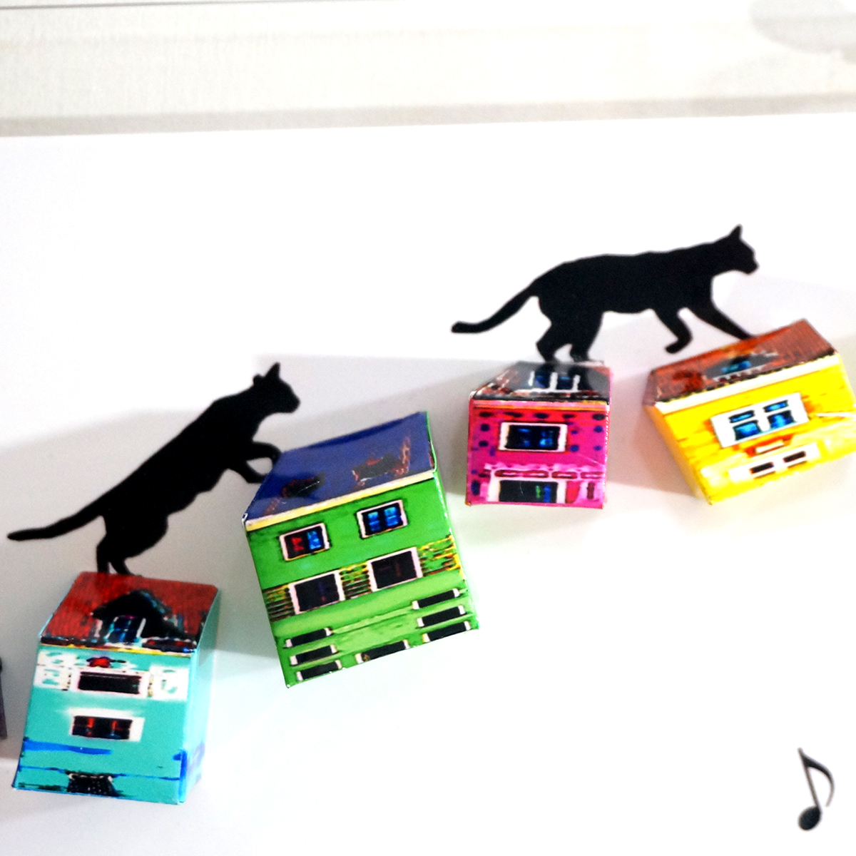 3匹の猫が宙に浮かんだ家の上を散歩する様子をペーパークラフト技術を用いて表した作品です。