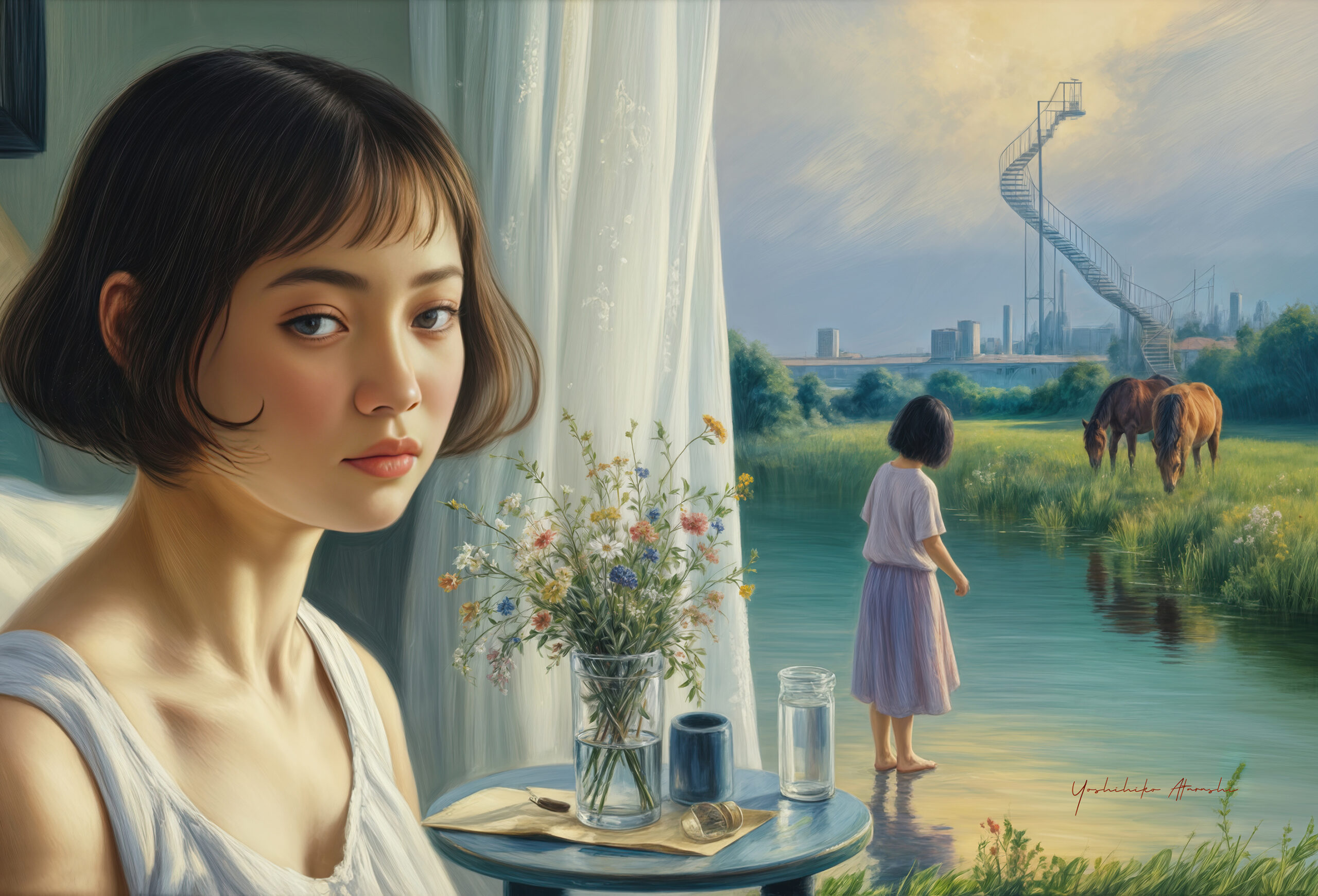 このシリーズ《幻想回顧》は、過去の記憶と夢想の境界をたゆたう女性たちを描いた作品群です。現実の室内と幻想的な風景を一枚に融合さ せ、写実的な筆致で静けさと内面の揺らぎを表現しました。光と水、視線と背中、内と外の対比を通じて、見る者それぞれの記憶を呼び起こす よう意図しています。絵の中の女性は時に観察者であり、時に過去そのものであり、観る者の感情に静かに語りかけます。