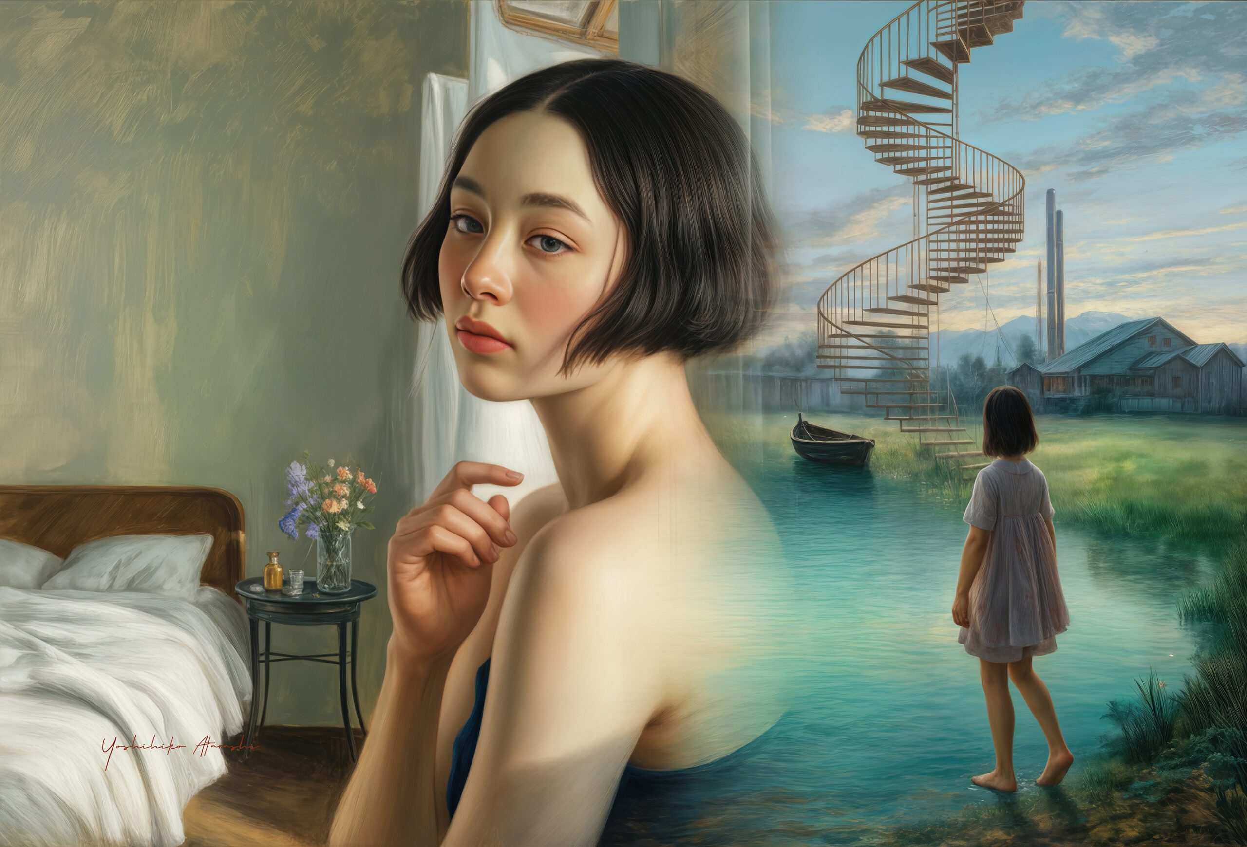 このシリーズ《幻想回顧》は、過去の記憶と夢想の境界をたゆたう女性たちを描いた作品群です。現実の室内と幻想的な風景を一枚に融合さ せ、写実的な筆致で静けさと内面の揺らぎを表現しました。光と水、視線と背中、内と外の対比を通じて、見る者それぞれの記憶を呼び起こす よう意図しています。絵の中の女性は時に観察者であり、時に過去そのものであり、観る者の感情に静かに語りかけます。