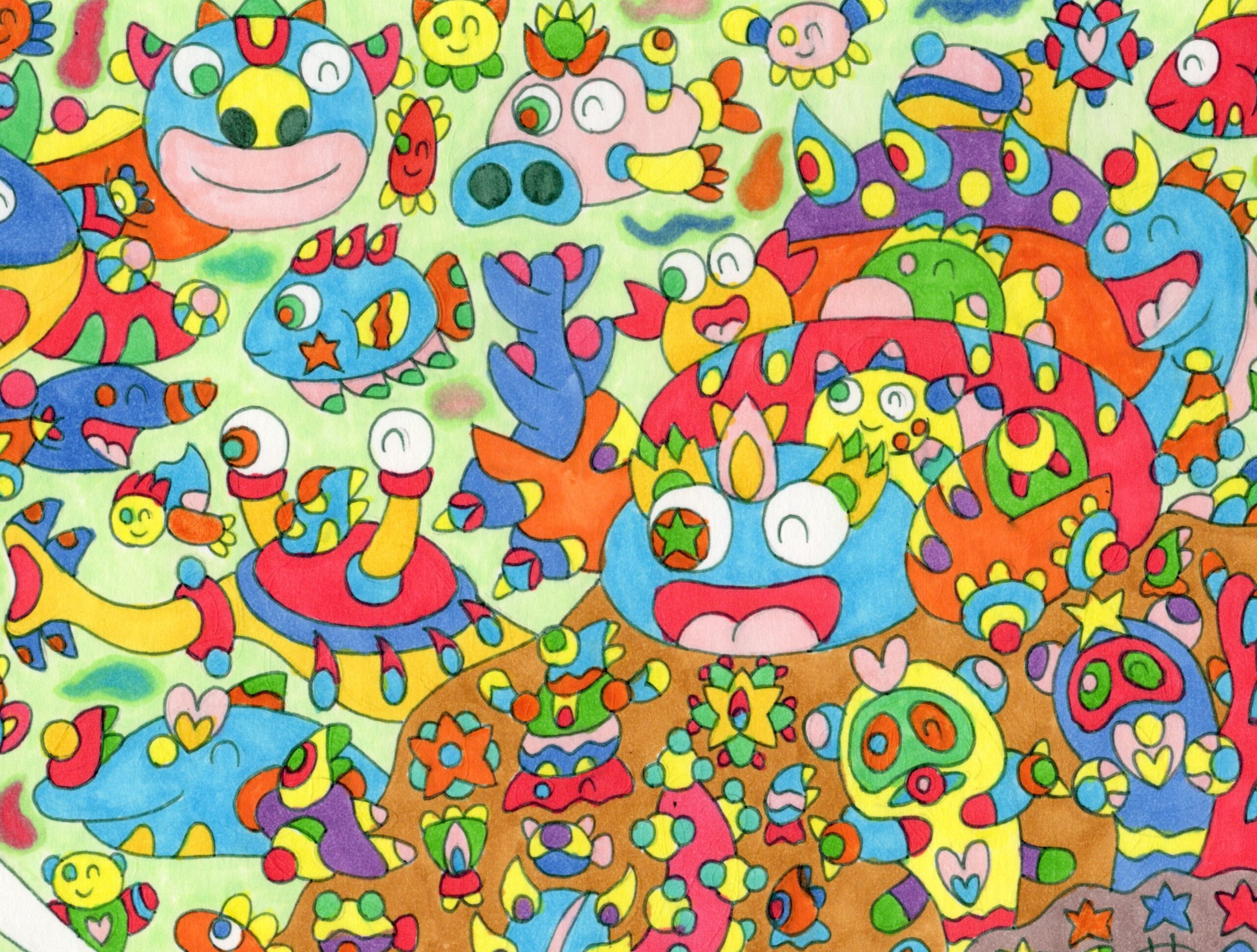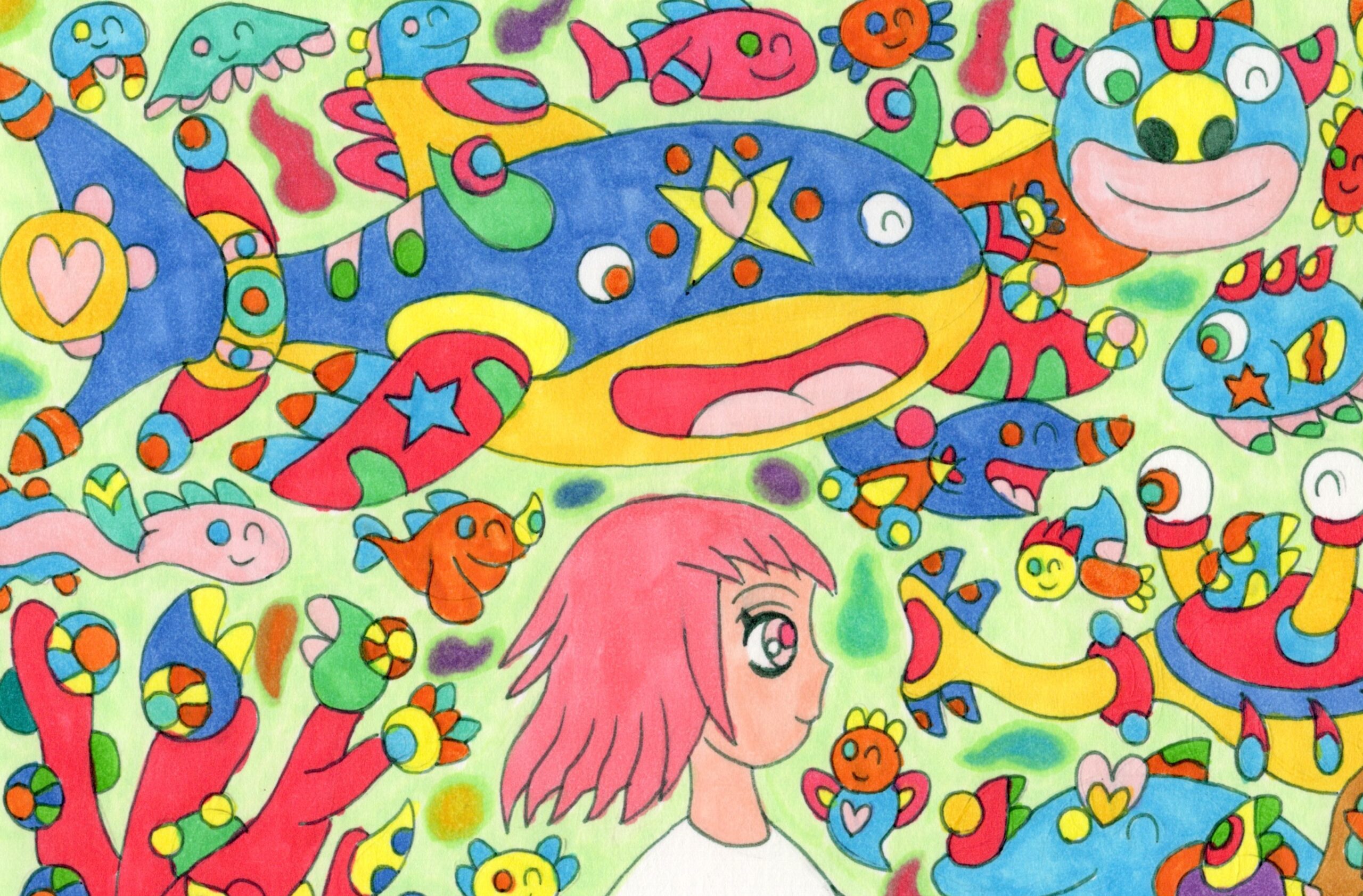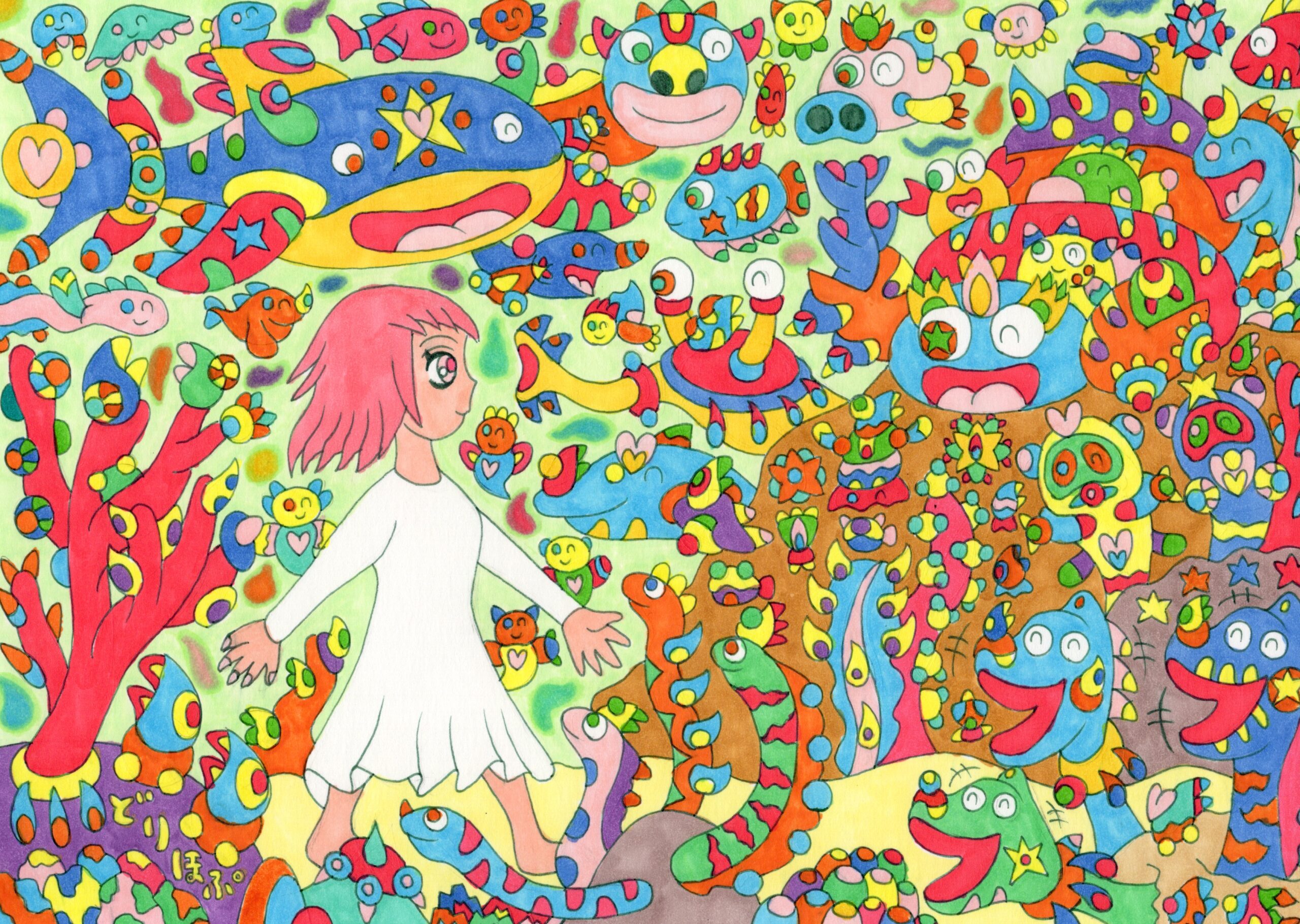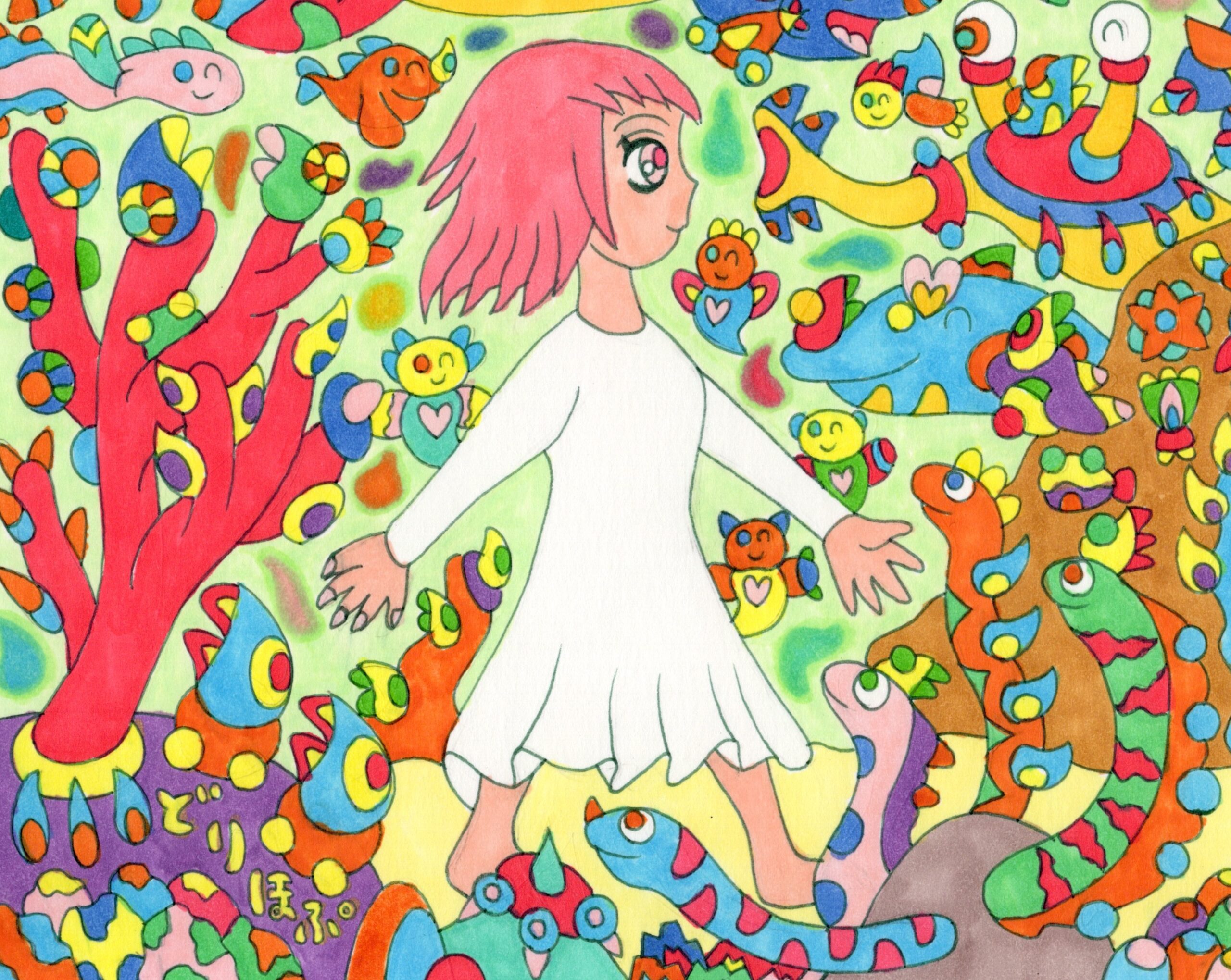女の子が想像した海の景色の中を、女の子が想像した海の生物達と楽しく散歩している様子をイメージして描きました。