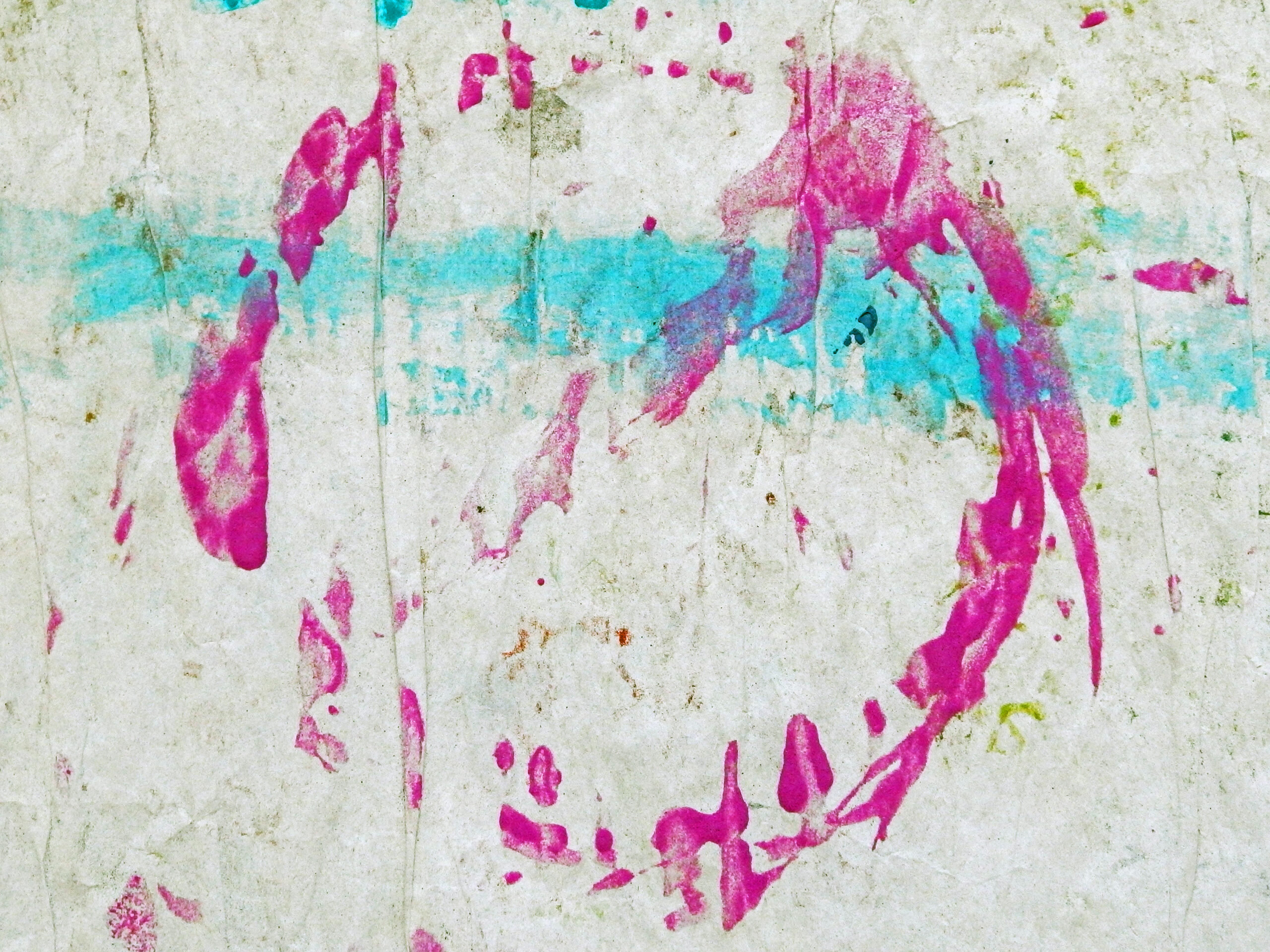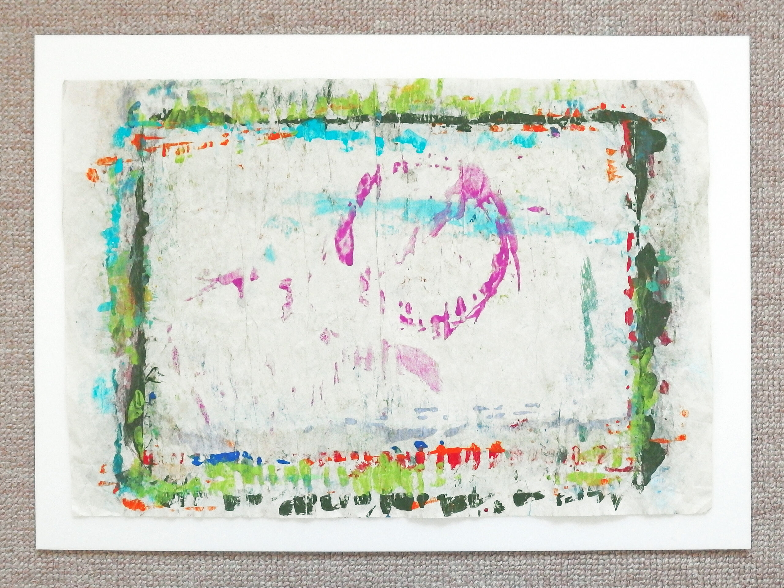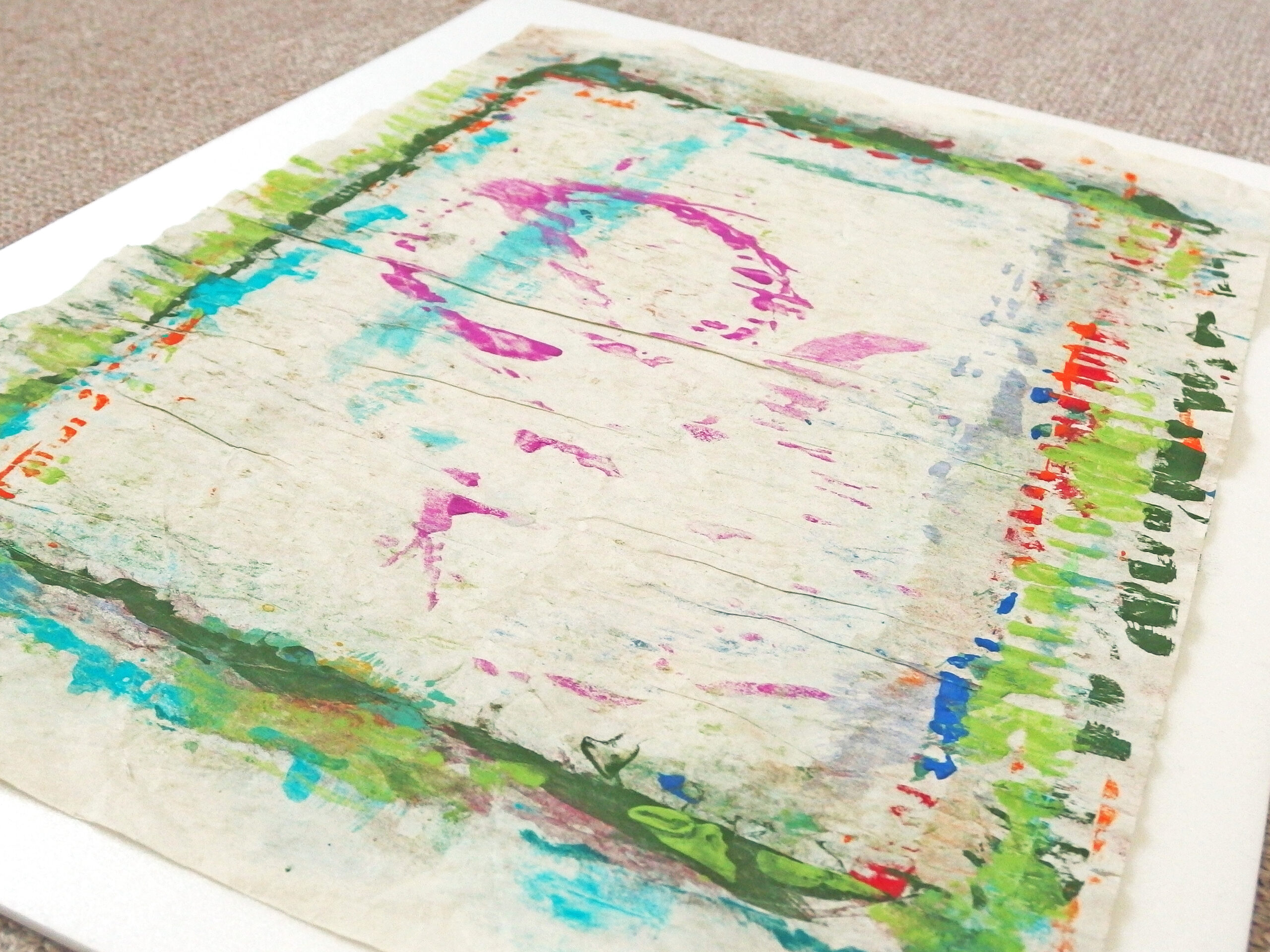 天然素材の和紙に膠を使うのが「日本画」の常識ですが、あえて人工素材を使っています。