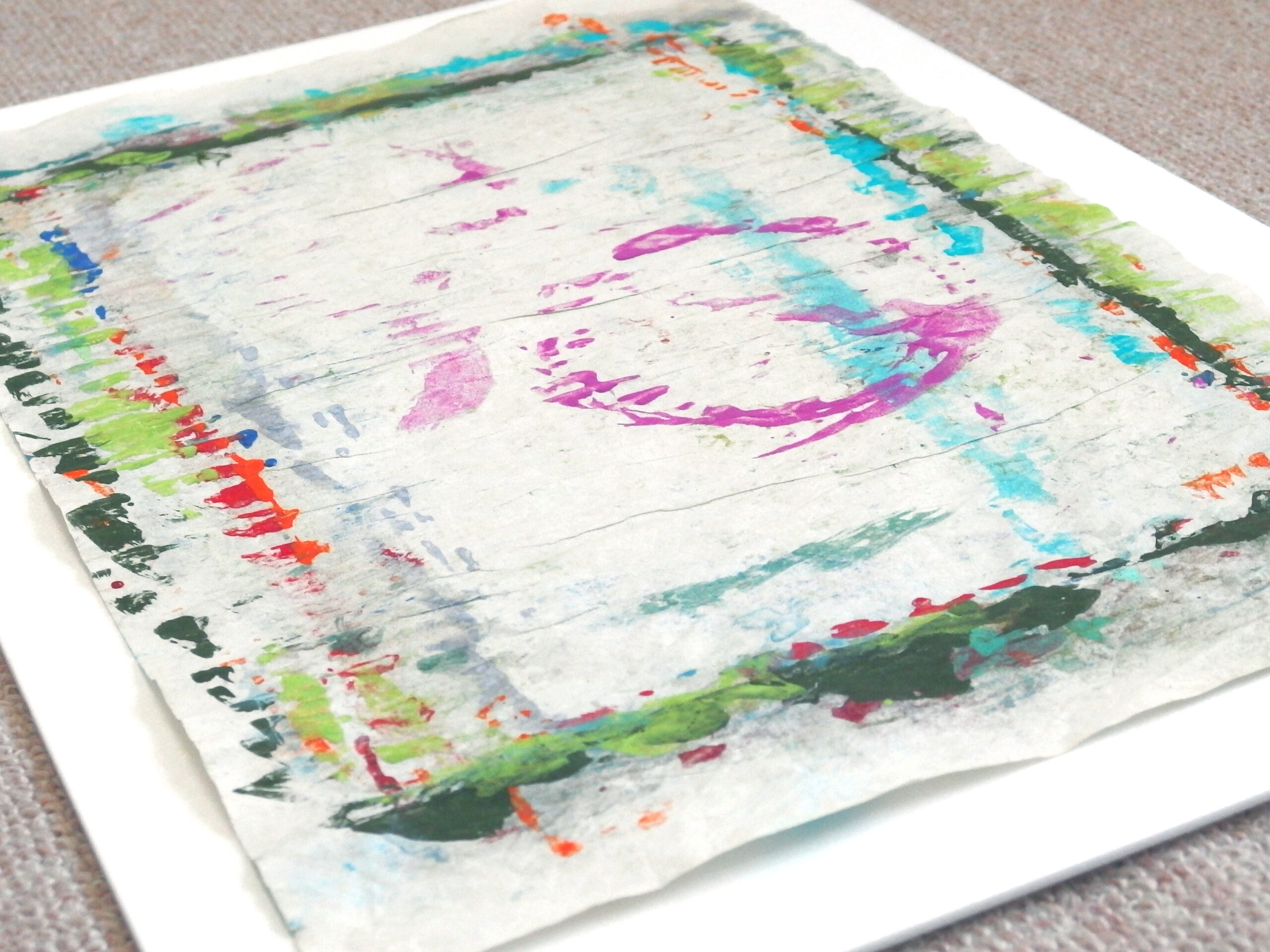 スチレンペーパーという光沢のある真っ白な素材に、岩絵の具自体の美しさが際立ちます。この組み合わせを発見し、気に入って使い続けています。